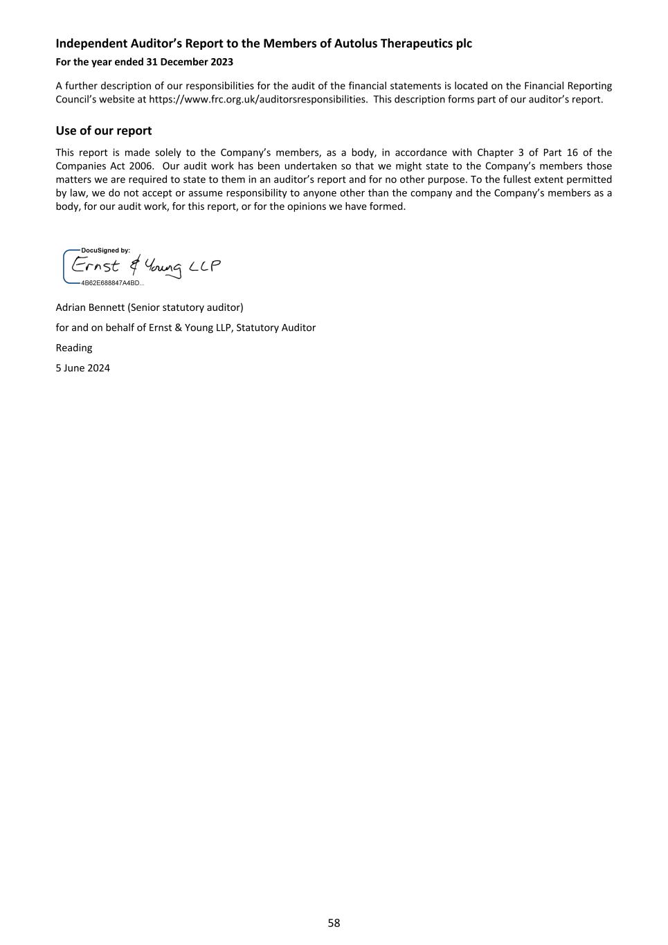 A further description of our responsibilities for the audit of the financial statements is located on the Financial Reporting Council’s website at https://www.frc.org.uk/auditorsresponsibilities. This description forms part of our auditor’s report. Use of our report This report is made solely to the Company’s members, as a body, in accordance with Chapter 3 of Part 16 of the Companies Act 2006. Our audit work has been undertaken so that we might state to the Company’s members those matters we are required to state to them in an auditor’s report and for no other purpose. To the fullest extent permitted by law, we do not accept or assume responsibility to anyone other than the company and the Company’s members as a body, for our audit work, for this report, or for the opinions we have formed. Adrian Bennett (Senior statutory auditor) for and on behalf of Ernst & Young LLP, Statutory Auditor Reading 5 June 2024 Independent Auditor’s Report to the Members of Autolus Therapeutics plc For the year ended 31 December 2023 58