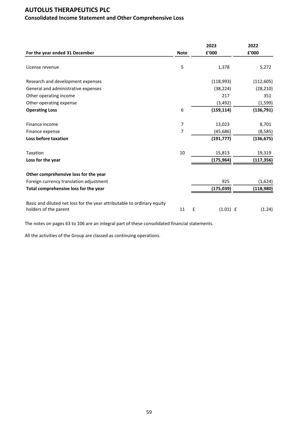 2023 2022 For the year ended 31 December Note £'000 £'000 License revenue 5 1,378 5,272 Research and development expenses (118,993) (112,605) General and administrative expenses (38,224) (28,210) Other operating income 217 351 Other operating expense (3,492) (1,599) Operating Loss 6 (159,114) (136,791) Finance income 7 13,023 8,701 Finance expense 7 (45,686) (8,585) Loss before taxation (191,777) (136,675) Taxation 10 15,813 19,319 Loss for the year (175,964) (117,356) Other comprehensive loss for the year Foreign currency translation adjustment 925 (1,624) Total comprehensive loss for the year (175,039) (118,980) Basic and diluted net loss for the year attributable to ordinary equity holders of the parent 11 £ (1.01) £ (1.24) The notes on pages 63 to 106 are an integral part of these consolidated financial statements. All the activities of the Group are classed as continuing operations. AUTOLUS THERAPEUTICS PLC Consolidated Income Statement and Other Comprehensive Loss 59