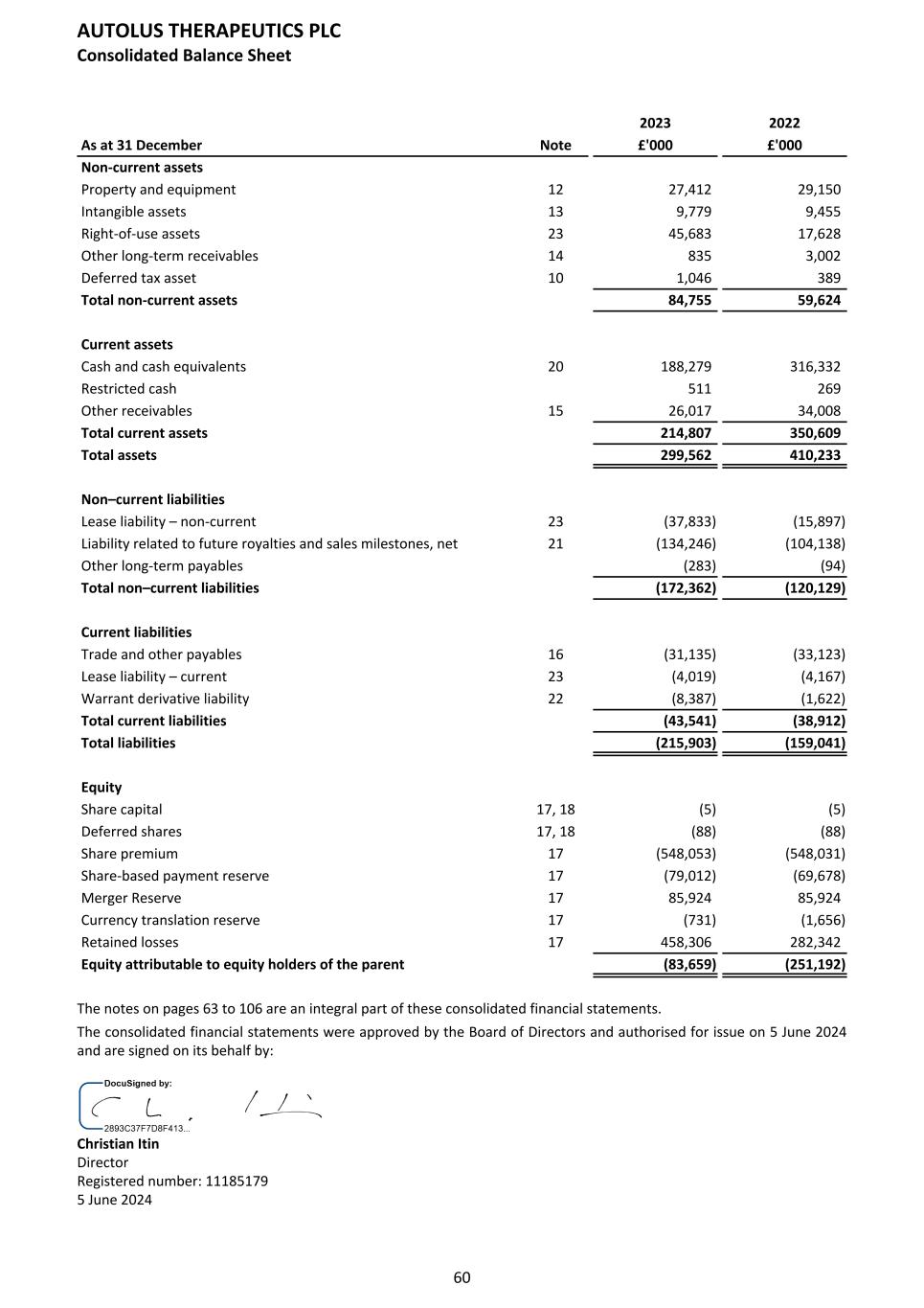 2023 2022 As at 31 December Note £'000 £'000 Non-current assets Property and equipment 12 27,412 29,150 Intangible assets 13 9,779 9,455 Right-of-use assets 23 45,683 17,628 Other long-term receivables 14 835 3,002 Deferred tax asset 10 1,046 389 Total non-current assets 84,755 59,624 Current assets Cash and cash equivalents 20 188,279 316,332 Restricted cash 511 269 Other receivables 15 26,017 34,008 Total current assets 214,807 350,609 Total assets 299,562 410,233 Non–current liabilities Lease liability – non-current 23 (37,833) (15,897) Liability related to future royalties and sales milestones, net 21 (134,246) (104,138) Other long-term payables (283) (94) Total non–current liabilities (172,362) (120,129) Current liabilities Trade and other payables 16 (31,135) (33,123) Lease liability – current 23 (4,019) (4,167) Warrant derivative liability 22 (8,387) (1,622) Total current liabilities (43,541) (38,912) Total liabilities (215,903) (159,041) Equity Share capital 17, 18 (5) (5) Deferred shares 17, 18 (88) (88) Share premium 17 (548,053) (548,031) Share-based payment reserve 17 (79,012) (69,678) Merger Reserve 17 85,924 85,924 Currency translation reserve 17 (731) (1,656) Retained losses 17 458,306 282,342 Equity attributable to equity holders of the parent (83,659) (251,192) The notes on pages 63 to 106 are an integral part of these consolidated financial statements. The consolidated financial statements were approved by the Board of Directors and authorised for issue on 5 June 2024 and are signed on its behalf by: Christian Itin Director Registered number: 11185179 5 June 2024 AUTOLUS THERAPEUTICS PLC Consolidated Balance Sheet 60
