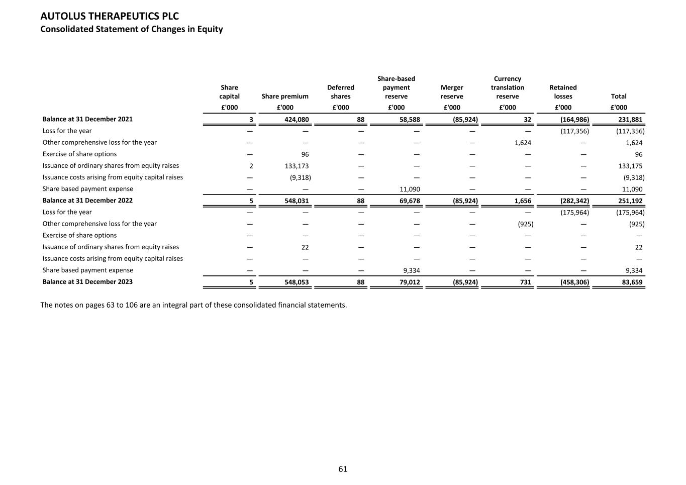 Share capital Share premium Deferred shares Share-based payment reserve Merger reserve Currency translation reserve Retained losses Total £'000 £'000 £'000 £'000 £'000 £’000 £'000 £'000 Balance at 31 December 2021 3 424,080 88 58,588 (85,924) 32 (164,986) 231,881 Loss for the year — — — — — — (117,356) (117,356) Other comprehensive loss for the year — — — — — 1,624 — 1,624 Exercise of share options — 96 — — — — — 96 Issuance of ordinary shares from equity raises 2 133,173 — — — — — 133,175 Issuance costs arising from equity capital raises — (9,318) — — — — — (9,318) Share based payment expense — — — 11,090 — — — 11,090 Balance at 31 December 2022 5 548,031 88 69,678 (85,924) 1,656 (282,342) 251,192 Loss for the year — — — — — — (175,964) (175,964) Other comprehensive loss for the year — — — — — (925) — (925) Exercise of share options — — — — — — — — Issuance of ordinary shares from equity raises — 22 — — — — — 22 Issuance costs arising from equity capital raises — — — — — — — — Share based payment expense — — — 9,334 — — — 9,334 Balance at 31 December 2023 5 548,053 88 79,012 (85,924) 731 (458,306) 83,659 The notes on pages 63 to 106 are an integral part of these consolidated financial statements. AUTOLUS THERAPEUTICS PLC Consolidated Statement of Changes in Equity 61