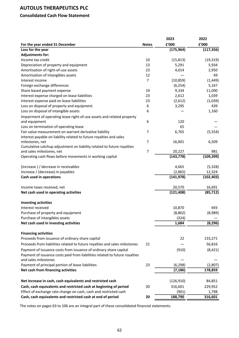 2023 2022 For the year ended 31 December Notes £'000 £'000 Loss for the year (175,964) (117,356) Adjustments for: Income tax credit 10 (15,813) (19,319) Depreciation of property and equipment 13 5,291 5,934 Amortisation of right-of-use assets 23 4,014 2,950 Amortisation of intangibles assets 12 — 49 Interest income 7 (10,859) (1,449) Foreign exchange differences (6,254) 5,167 Share based payment expense 19 9,334 11,090 Interest expense charged on lease liabilities 23 2,612 1,039 Interest expense paid on lease liabilities 23 (2,612) (1,039) Loss on disposal of property and equipment 6 3,295 439 Loss on disposal of intangible assets 6 — 1,160 Impairment of operating lease right-of-use assets and related property and equipment 6 120 — Loss on termination of operating lease 65 — Fair value measurement on warrant derivative liability 7 6,765 (5,554) Interest payable on liability related to future royalties and sales milestones, net 7 16,001 6,509 Cumulative catchup adjustment on liability related to future royalties and sales milestones, net 7 20,227 981 Operating cash flows before movements in working capital (143,778) (109,399) (Increase ) / decrease in receivables 4,665 (5,328) Increase / (decrease) in payables (2,865) 12,324 Cash used in operations (141,978) (102,403) Income taxes received, net 20,570 16,691 Net cash used in operating activities (121,408) (85,712) Investing activities Interest received 10,870 693 Purchase of property and equipment (8,862) (8,989) Purchase of intangibles assets (324) — Net cash used in investing activities 1,684 (8,296) Financing activities Proceeds from issuance of ordinary share capital 22 133,271 Proceeds from liabilities related to future royalties and sales milestones 21 — 56,816 Payment of Issuance costs from issuance of ordinary share capital (910) (8,421) Payment of issuance costs paid from liabilities related to future royalties and sales milestones — — Payment of principal portion of lease liabilities 23 (6,298) (2,807) Net cash from financing activities (7,186) 178,859 Net increase in cash, cash equivalents and restricted cash (126,910) 84,851 Cash, cash equivalents and restricted cash at beginning of period 20 316,601 229,952 Effect of exchange rate change on cash, cash and restricted cash (901) 1,798 Cash, cash equivalents and restricted cash at end of period 20 188,790 316,601 The notes on pages 63 to 106 are an integral part of these consolidated financial statements. AUTOLUS THERAPEUTICS PLC Consolidated Cash Flow Statement 62