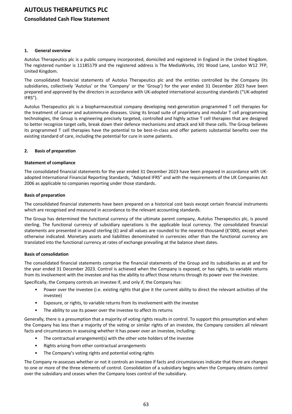 1. General overview Autolus Therapeutics plc is a public company incorporated, domiciled and registered in England in the United Kingdom. The registered number is 11185179 and the registered address is The MediaWorks, 191 Wood Lane, London W12 7FP, United Kingdom. The consolidated financial statements of Autolus Therapeutics plc and the entities controlled by the Company (its subsidiaries, collectively ‘Autolus’ or the ‘Company’ or the ‘Group’) for the year ended 31 December 2023 have been prepared and approved by the directors in accordance with UK-adopted international accounting standards (“UK-adopted IFRS”). Autolus Therapeutics plc is a biopharmaceutical company developing next-generation programmed T cell therapies for the treatment of cancer and autoimmune diseases. Using its broad suite of proprietary and modular T cell programming technologies, the Group is engineering precisely targeted, controlled and highly active T cell therapies that are designed to better recognize target cells, break down their defence mechanisms and attack and kill these cells. The Group believes its programmed T cell therapies have the potential to be best-in-class and offer patients substantial benefits over the existing standard of care, including the potential for cure in some patients. 2. Basis of preparation Statement of compliance The consolidated financial statements for the year ended 31 December 2023 have been prepared in accordance with UK- adopted International Financial Reporting Standards, “Adopted IFRS” and with the requirements of the UK Companies Act 2006 as applicable to companies reporting under those standards. Basis of preparation The consolidated financial statements have been prepared on a historical cost basis except certain financial instruments which are recognised and measured in accordance to the relevant accounting standards. The Group has determined the functional currency of the ultimate parent company, Autolus Therapeutics plc, is pound sterling. The functional currency of subsidiary operations is the applicable local currency. The consolidated financial statements are presented in pound sterling (£) and all values are rounded to the nearest thousand (£’000), except when otherwise indicated. Monetary assets and liabilities denominated in currencies other than the functional currency are translated into the functional currency at rates of exchange prevailing at the balance sheet dates. Basis of consolidation The consolidated financial statements comprise the financial statements of the Group and its subsidiaries as at and for the year ended 31 December 2023. Control is achieved when the Company is exposed, or has rights, to variable returns from its involvement with the investee and has the ability to affect those returns through its power over the investee. Specifically, the Company controls an investee if, and only if, the Company has: • Power over the investee (i.e. existing rights that give it the current ability to direct the relevant activities of the investee) • Exposure, or rights, to variable returns from its involvement with the investee • The ability to use its power over the investee to affect its returns Generally, there is a presumption that a majority of voting rights results in control. To support this presumption and when the Company has less than a majority of the voting or similar rights of an investee, the Company considers all relevant facts and circumstances in assessing whether it has power over an investee, including: • The contractual arrangement(s) with the other vote holders of the investee • Rights arising from other contractual arrangements • The Company’s voting rights and potential voting rights The Company re-assesses whether or not it controls an investee if facts and circumstances indicate that there are changes to one or more of the three elements of control. Consolidation of a subsidiary begins when the Company obtains control over the subsidiary and ceases when the Company loses control of the subsidiary. AUTOLUS THERAPEUTICS PLC Consolidated Cash Flow Statement 63