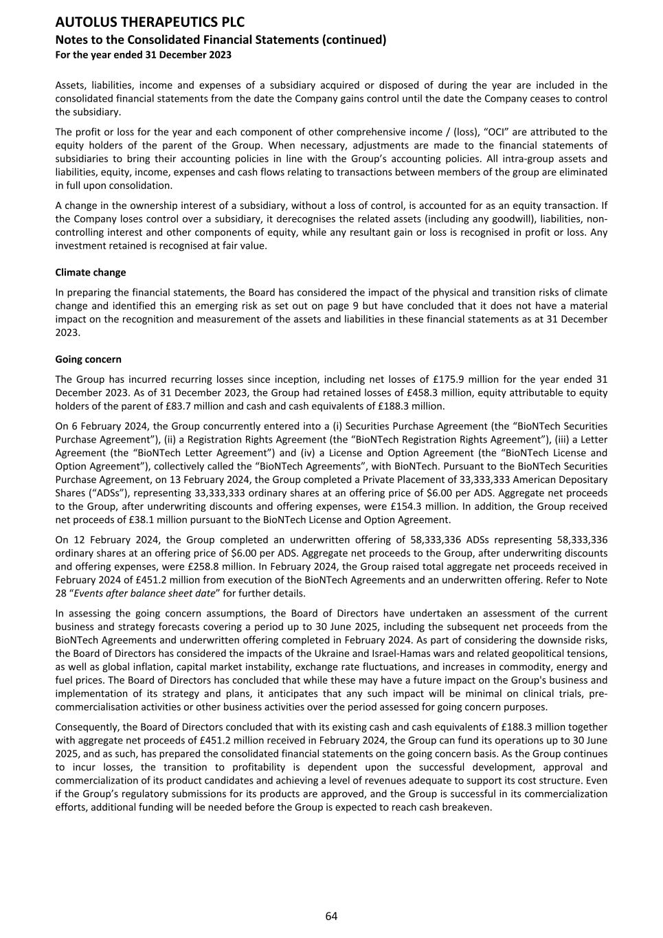 Assets, liabilities, income and expenses of a subsidiary acquired or disposed of during the year are included in the consolidated financial statements from the date the Company gains control until the date the Company ceases to control the subsidiary. The profit or loss for the year and each component of other comprehensive income / (loss), “OCI” are attributed to the equity holders of the parent of the Group. When necessary, adjustments are made to the financial statements of subsidiaries to bring their accounting policies in line with the Group’s accounting policies. All intra-group assets and liabilities, equity, income, expenses and cash flows relating to transactions between members of the group are eliminated in full upon consolidation. A change in the ownership interest of a subsidiary, without a loss of control, is accounted for as an equity transaction. If the Company loses control over a subsidiary, it derecognises the related assets (including any goodwill), liabilities, non- controlling interest and other components of equity, while any resultant gain or loss is recognised in profit or loss. Any investment retained is recognised at fair value. Climate change In preparing the financial statements, the Board has considered the impact of the physical and transition risks of climate change and identified this an emerging risk as set out on page 9 but have concluded that it does not have a material impact on the recognition and measurement of the assets and liabilities in these financial statements as at 31 December 2023. Going concern The Group has incurred recurring losses since inception, including net losses of £175.9 million for the year ended 31 December 2023. As of 31 December 2023, the Group had retained losses of £458.3 million, equity attributable to equity holders of the parent of £83.7 million and cash and cash equivalents of £188.3 million. On 6 February 2024, the Group concurrently entered into a (i) Securities Purchase Agreement (the “BioNTech Securities Purchase Agreement”), (ii) a Registration Rights Agreement (the “BioNTech Registration Rights Agreement”), (iii) a Letter Agreement (the “BioNTech Letter Agreement”) and (iv) a License and Option Agreement (the “BioNTech License and Option Agreement”), collectively called the “BioNTech Agreements”, with BioNTech. Pursuant to the BioNTech Securities Purchase Agreement, on 13 February 2024, the Group completed a Private Placement of 33,333,333 American Depositary Shares (“ADSs”), representing 33,333,333 ordinary shares at an offering price of $6.00 per ADS. Aggregate net proceeds to the Group, after underwriting discounts and offering expenses, were £154.3 million. In addition, the Group received net proceeds of £38.1 million pursuant to the BioNTech License and Option Agreement. On 12 February 2024, the Group completed an underwritten offering of 58,333,336 ADSs representing 58,333,336 ordinary shares at an offering price of $6.00 per ADS. Aggregate net proceeds to the Group, after underwriting discounts and offering expenses, were £258.8 million. In February 2024, the Group raised total aggregate net proceeds received in February 2024 of £451.2 million from execution of the BioNTech Agreements and an underwritten offering. Refer to Note 28 “Events after balance sheet date” for further details. In assessing the going concern assumptions, the Board of Directors have undertaken an assessment of the current business and strategy forecasts covering a period up to 30 June 2025, including the subsequent net proceeds from the BioNTech Agreements and underwritten offering completed in February 2024. As part of considering the downside risks, the Board of Directors has considered the impacts of the Ukraine and Israel-Hamas wars and related geopolitical tensions, as well as global inflation, capital market instability, exchange rate fluctuations, and increases in commodity, energy and fuel prices. The Board of Directors has concluded that while these may have a future impact on the Group's business and implementation of its strategy and plans, it anticipates that any such impact will be minimal on clinical trials, pre- commercialisation activities or other business activities over the period assessed for going concern purposes. Consequently, the Board of Directors concluded that with its existing cash and cash equivalents of £188.3 million together with aggregate net proceeds of £451.2 million received in February 2024, the Group can fund its operations up to 30 June 2025, and as such, has prepared the consolidated financial statements on the going concern basis. As the Group continues to incur losses, the transition to profitability is dependent upon the successful development, approval and commercialization of its product candidates and achieving a level of revenues adequate to support its cost structure. Even if the Group’s regulatory submissions for its products are approved, and the Group is successful in its commercialization efforts, additional funding will be needed before the Group is expected to reach cash breakeven. AUTOLUS THERAPEUTICS PLC Notes to the Consolidated Financial Statements (continued) For the year ended 31 December 2023 64