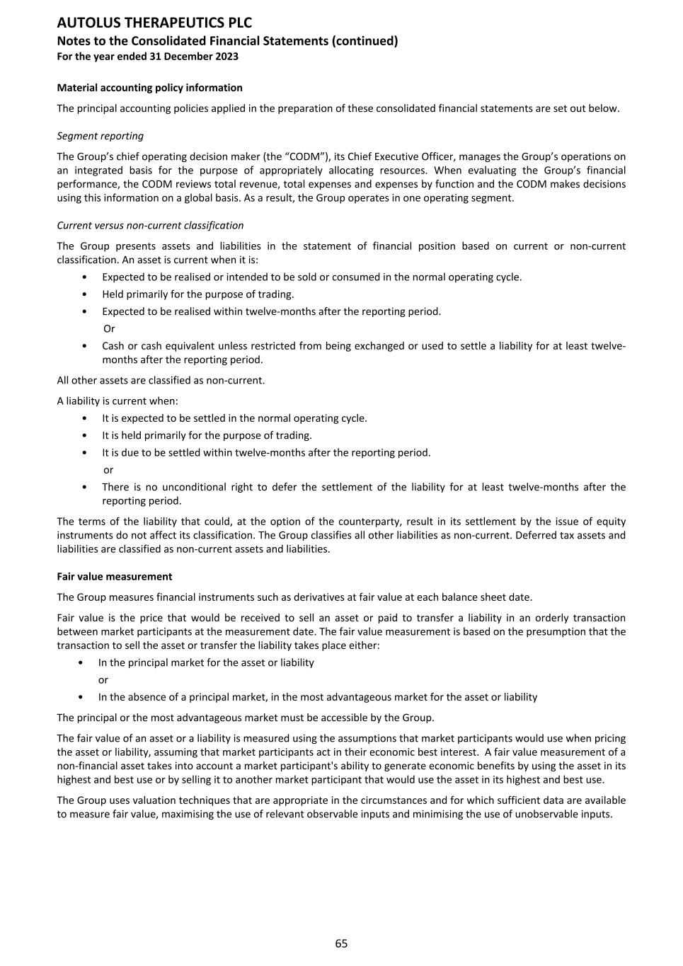 Material accounting policy information The principal accounting policies applied in the preparation of these consolidated financial statements are set out below. Segment reporting The Group’s chief operating decision maker (the “CODM”), its Chief Executive Officer, manages the Group’s operations on an integrated basis for the purpose of appropriately allocating resources. When evaluating the Group’s financial performance, the CODM reviews total revenue, total expenses and expenses by function and the CODM makes decisions using this information on a global basis. As a result, the Group operates in one operating segment. Current versus non-current classification The Group presents assets and liabilities in the statement of financial position based on current or non-current classification. An asset is current when it is: • Expected to be realised or intended to be sold or consumed in the normal operating cycle. • Held primarily for the purpose of trading. • Expected to be realised within twelve-months after the reporting period. Or • Cash or cash equivalent unless restricted from being exchanged or used to settle a liability for at least twelve- months after the reporting period. All other assets are classified as non-current. A liability is current when: • It is expected to be settled in the normal operating cycle. • It is held primarily for the purpose of trading. • It is due to be settled within twelve-months after the reporting period. or • There is no unconditional right to defer the settlement of the liability for at least twelve-months after the reporting period. The terms of the liability that could, at the option of the counterparty, result in its settlement by the issue of equity instruments do not affect its classification. The Group classifies all other liabilities as non-current. Deferred tax assets and liabilities are classified as non-current assets and liabilities. Fair value measurement The Group measures financial instruments such as derivatives at fair value at each balance sheet date. Fair value is the price that would be received to sell an asset or paid to transfer a liability in an orderly transaction between market participants at the measurement date. The fair value measurement is based on the presumption that the transaction to sell the asset or transfer the liability takes place either: • In the principal market for the asset or liability or • In the absence of a principal market, in the most advantageous market for the asset or liability The principal or the most advantageous market must be accessible by the Group. The fair value of an asset or a liability is measured using the assumptions that market participants would use when pricing the asset or liability, assuming that market participants act in their economic best interest. A fair value measurement of a non-financial asset takes into account a market participant's ability to generate economic benefits by using the asset in its highest and best use or by selling it to another market participant that would use the asset in its highest and best use. The Group uses valuation techniques that are appropriate in the circumstances and for which sufficient data are available to measure fair value, maximising the use of relevant observable inputs and minimising the use of unobservable inputs. AUTOLUS THERAPEUTICS PLC Notes to the Consolidated Financial Statements (continued) For the year ended 31 December 2023 65