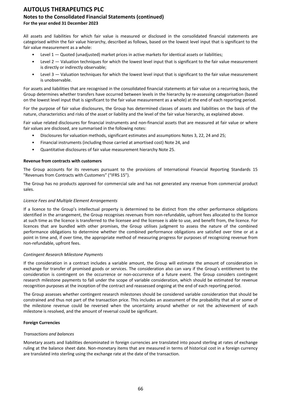All assets and liabilities for which fair value is measured or disclosed in the consolidated financial statements are categorised within the fair value hierarchy, described as follows, based on the lowest level input that is significant to the fair value measurement as a whole: • Level 1 — Quoted (unadjusted) market prices in active markets for identical assets or liabilities; • Level 2 — Valuation techniques for which the lowest level input that is significant to the fair value measurement is directly or indirectly observable; • Level 3 — Valuation techniques for which the lowest level input that is significant to the fair value measurement is unobservable. For assets and liabilities that are recognised in the consolidated financial statements at fair value on a recurring basis, the Group determines whether transfers have occurred between levels in the hierarchy by re-assessing categorisation (based on the lowest level input that is significant to the fair value measurement as a whole) at the end of each reporting period. For the purpose of fair value disclosures, the Group has determined classes of assets and liabilities on the basis of the nature, characteristics and risks of the asset or liability and the level of the fair value hierarchy, as explained above. Fair value related disclosures for financial instruments and non-financial assets that are measured at fair value or where fair values are disclosed, are summarised in the following notes: • Disclosures for valuation methods, significant estimates and assumptions Notes 3, 22, 24 and 25; • Financial instruments (including those carried at amortised cost) Note 24, and • Quantitative disclosures of fair value measurement hierarchy Note 25. Revenue from contracts with customers The Group accounts for its revenues pursuant to the provisions of International Financial Reporting Standards 15 "Revenues from Contracts with Customers” (“IFRS 15”). The Group has no products approved for commercial sale and has not generated any revenue from commercial product sales. Licence Fees and Multiple Element Arrangements If a licence to the Group’s intellectual property is determined to be distinct from the other performance obligations identified in the arrangement, the Group recognises revenues from non-refundable, upfront fees allocated to the licence at such time as the licence is transferred to the licensee and the licensee is able to use, and benefit from, the licence. For licences that are bundled with other promises, the Group utilises judgment to assess the nature of the combined performance obligations to determine whether the combined performance obligations are satisfied over time or at a point in time and, if over time, the appropriate method of measuring progress for purposes of recognizing revenue from non-refundable, upfront fees. Contingent Research Milestone Payments If the consideration in a contract includes a variable amount, the Group will estimate the amount of consideration in exchange for transfer of promised goods or services. The consideration also can vary if the Group’s entitlement to the consideration is contingent on the occurrence or non-occurrence of a future event. The Group considers contingent research milestone payments to fall under the scope of variable consideration, which should be estimated for revenue recognition purposes at the inception of the contract and reassessed ongoing at the end of each reporting period. The Group assesses whether contingent research milestones should be considered variable consideration that should be constrained and thus not part of the transaction price. This includes an assessment of the probability that all or some of the milestone revenue could be reversed when the uncertainty around whether or not the achievement of each milestone is resolved, and the amount of reversal could be significant. Foreign Currencies Transactions and balances Monetary assets and liabilities denominated in foreign currencies are translated into pound sterling at rates of exchange ruling at the balance sheet date. Non-monetary items that are measured in terms of historical cost in a foreign currency are translated into sterling using the exchange rate at the date of the transaction. AUTOLUS THERAPEUTICS PLC Notes to the Consolidated Financial Statements (continued) For the year ended 31 December 2023 66