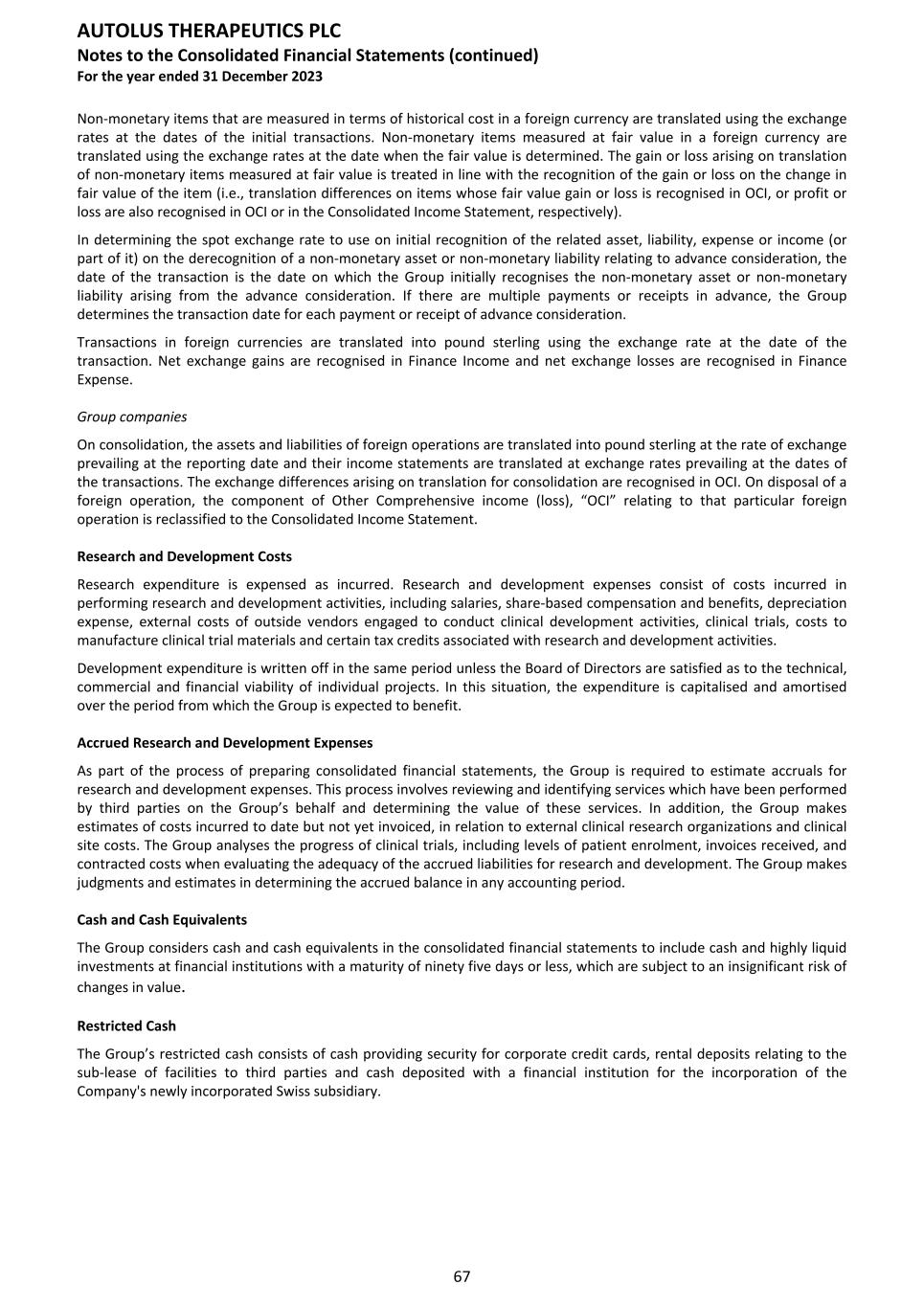 Non-monetary items that are measured in terms of historical cost in a foreign currency are translated using the exchange rates at the dates of the initial transactions. Non-monetary items measured at fair value in a foreign currency are translated using the exchange rates at the date when the fair value is determined. The gain or loss arising on translation of non-monetary items measured at fair value is treated in line with the recognition of the gain or loss on the change in fair value of the item (i.e., translation differences on items whose fair value gain or loss is recognised in OCI, or profit or loss are also recognised in OCI or in the Consolidated Income Statement, respectively). In determining the spot exchange rate to use on initial recognition of the related asset, liability, expense or income (or part of it) on the derecognition of a non-monetary asset or non-monetary liability relating to advance consideration, the date of the transaction is the date on which the Group initially recognises the non-monetary asset or non-monetary liability arising from the advance consideration. If there are multiple payments or receipts in advance, the Group determines the transaction date for each payment or receipt of advance consideration. Transactions in foreign currencies are translated into pound sterling using the exchange rate at the date of the transaction. Net exchange gains are recognised in Finance Income and net exchange losses are recognised in Finance Expense. Group companies On consolidation, the assets and liabilities of foreign operations are translated into pound sterling at the rate of exchange prevailing at the reporting date and their income statements are translated at exchange rates prevailing at the dates of the transactions. The exchange differences arising on translation for consolidation are recognised in OCI. On disposal of a foreign operation, the component of Other Comprehensive income (loss), “OCI” relating to that particular foreign operation is reclassified to the Consolidated Income Statement. Research and Development Costs Research expenditure is expensed as incurred. Research and development expenses consist of costs incurred in performing research and development activities, including salaries, share-based compensation and benefits, depreciation expense, external costs of outside vendors engaged to conduct clinical development activities, clinical trials, costs to manufacture clinical trial materials and certain tax credits associated with research and development activities. Development expenditure is written off in the same period unless the Board of Directors are satisfied as to the technical, commercial and financial viability of individual projects. In this situation, the expenditure is capitalised and amortised over the period from which the Group is expected to benefit. Accrued Research and Development Expenses As part of the process of preparing consolidated financial statements, the Group is required to estimate accruals for research and development expenses. This process involves reviewing and identifying services which have been performed by third parties on the Group’s behalf and determining the value of these services. In addition, the Group makes estimates of costs incurred to date but not yet invoiced, in relation to external clinical research organizations and clinical site costs. The Group analyses the progress of clinical trials, including levels of patient enrolment, invoices received, and contracted costs when evaluating the adequacy of the accrued liabilities for research and development. The Group makes judgments and estimates in determining the accrued balance in any accounting period. Cash and Cash Equivalents The Group considers cash and cash equivalents in the consolidated financial statements to include cash and highly liquid investments at financial institutions with a maturity of ninety five days or less, which are subject to an insignificant risk of changes in value. Restricted Cash The Group’s restricted cash consists of cash providing security for corporate credit cards, rental deposits relating to the sub-lease of facilities to third parties and cash deposited with a financial institution for the incorporation of the Company's newly incorporated Swiss subsidiary. AUTOLUS THERAPEUTICS PLC Notes to the Consolidated Financial Statements (continued) For the year ended 31 December 2023 67