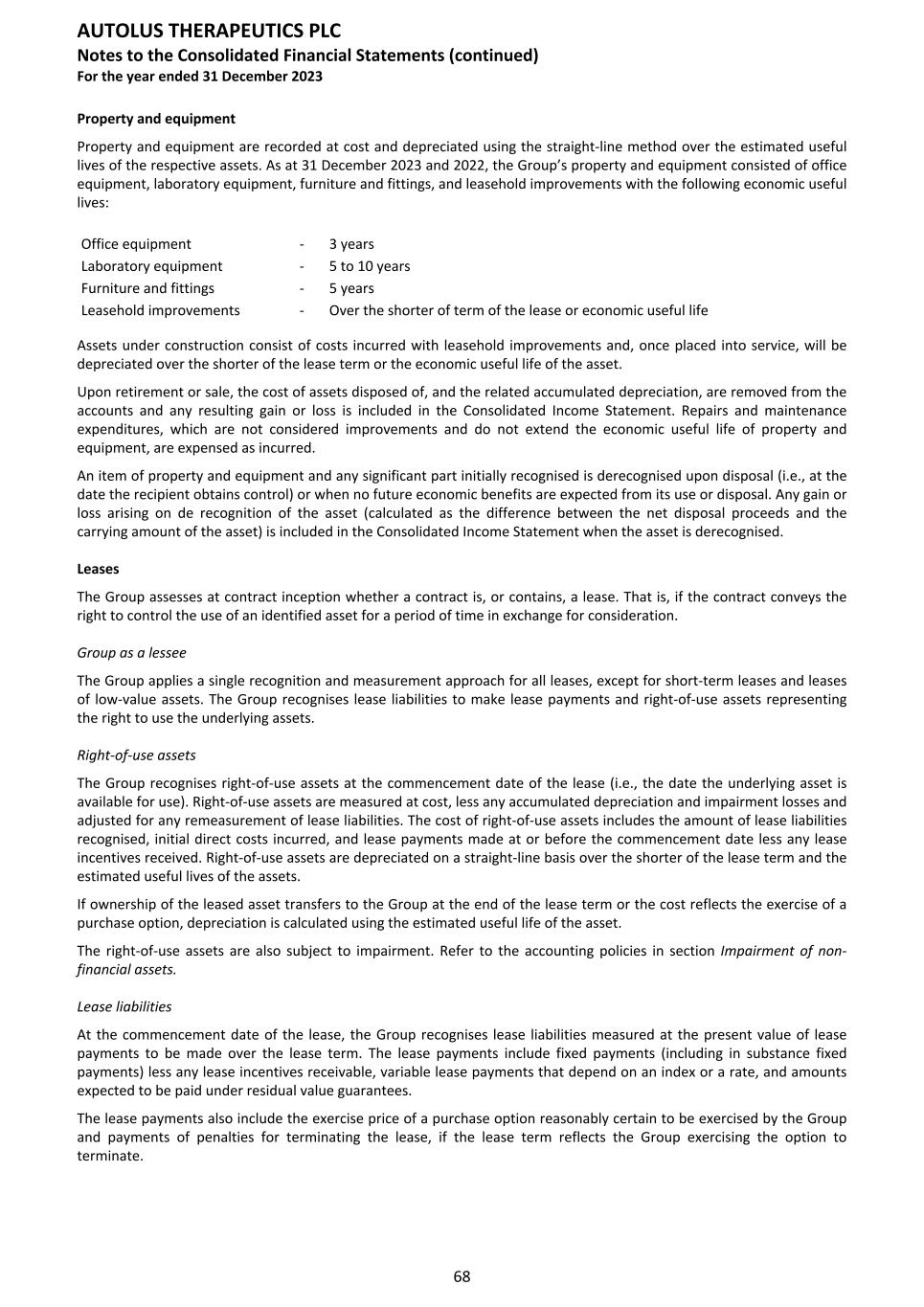 Property and equipment Property and equipment are recorded at cost and depreciated using the straight-line method over the estimated useful lives of the respective assets. As at 31 December 2023 and 2022, the Group’s property and equipment consisted of office equipment, laboratory equipment, furniture and fittings, and leasehold improvements with the following economic useful lives: Office equipment - 3 years Laboratory equipment - 5 to 10 years Furniture and fittings - 5 years Leasehold improvements - Over the shorter of term of the lease or economic useful life Assets under construction consist of costs incurred with leasehold improvements and, once placed into service, will be depreciated over the shorter of the lease term or the economic useful life of the asset. Upon retirement or sale, the cost of assets disposed of, and the related accumulated depreciation, are removed from the accounts and any resulting gain or loss is included in the Consolidated Income Statement. Repairs and maintenance expenditures, which are not considered improvements and do not extend the economic useful life of property and equipment, are expensed as incurred. An item of property and equipment and any significant part initially recognised is derecognised upon disposal (i.e., at the date the recipient obtains control) or when no future economic benefits are expected from its use or disposal. Any gain or loss arising on de recognition of the asset (calculated as the difference between the net disposal proceeds and the carrying amount of the asset) is included in the Consolidated Income Statement when the asset is derecognised. Leases The Group assesses at contract inception whether a contract is, or contains, a lease. That is, if the contract conveys the right to control the use of an identified asset for a period of time in exchange for consideration. Group as a lessee The Group applies a single recognition and measurement approach for all leases, except for short-term leases and leases of low-value assets. The Group recognises lease liabilities to make lease payments and right-of-use assets representing the right to use the underlying assets. Right-of-use assets The Group recognises right-of-use assets at the commencement date of the lease (i.e., the date the underlying asset is available for use). Right-of-use assets are measured at cost, less any accumulated depreciation and impairment losses and adjusted for any remeasurement of lease liabilities. The cost of right-of-use assets includes the amount of lease liabilities recognised, initial direct costs incurred, and lease payments made at or before the commencement date less any lease incentives received. Right-of-use assets are depreciated on a straight-line basis over the shorter of the lease term and the estimated useful lives of the assets. If ownership of the leased asset transfers to the Group at the end of the lease term or the cost reflects the exercise of a purchase option, depreciation is calculated using the estimated useful life of the asset. The right-of-use assets are also subject to impairment. Refer to the accounting policies in section Impairment of non- financial assets. Lease liabilities At the commencement date of the lease, the Group recognises lease liabilities measured at the present value of lease payments to be made over the lease term. The lease payments include fixed payments (including in substance fixed payments) less any lease incentives receivable, variable lease payments that depend on an index or a rate, and amounts expected to be paid under residual value guarantees. The lease payments also include the exercise price of a purchase option reasonably certain to be exercised by the Group and payments of penalties for terminating the lease, if the lease term reflects the Group exercising the option to terminate. AUTOLUS THERAPEUTICS PLC Notes to the Consolidated Financial Statements (continued) For the year ended 31 December 2023 68