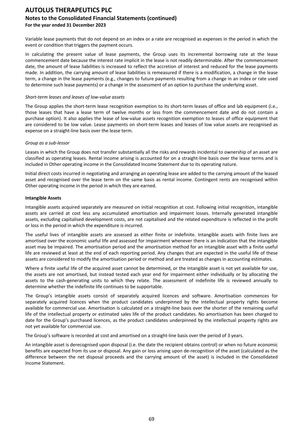 Variable lease payments that do not depend on an index or a rate are recognised as expenses in the period in which the event or condition that triggers the payment occurs. In calculating the present value of lease payments, the Group uses its incremental borrowing rate at the lease commencement date because the interest rate implicit in the lease is not readily determinable. After the commencement date, the amount of lease liabilities is increased to reflect the accretion of interest and reduced for the lease payments made. In addition, the carrying amount of lease liabilities is remeasured if there is a modification, a change in the lease term, a change in the lease payments (e.g., changes to future payments resulting from a change in an index or rate used to determine such lease payments) or a change in the assessment of an option to purchase the underlying asset. Short-term leases and leases of low-value assets The Group applies the short-term lease recognition exemption to its short-term leases of office and lab equipment (i.e., those leases that have a lease term of twelve months or less from the commencement date and do not contain a purchase option). It also applies the lease of low-value assets recognition exemption to leases of office equipment that are considered to be low value. Lease payments on short-term leases and leases of low value assets are recognised as expense on a straight-line basis over the lease term. Group as a sub-lessor Leases in which the Group does not transfer substantially all the risks and rewards incidental to ownership of an asset are classified as operating leases. Rental income arising is accounted for on a straight-line basis over the lease terms and is included in Other operating income in the Consolidated Income Statement due to its operating nature. Initial direct costs incurred in negotiating and arranging an operating lease are added to the carrying amount of the leased asset and recognised over the lease term on the same basis as rental income. Contingent rents are recognised within Other operating income in the period in which they are earned. Intangible Assets Intangible assets acquired separately are measured on initial recognition at cost. Following initial recognition, intangible assets are carried at cost less any accumulated amortisation and impairment losses. Internally generated intangible assets, excluding capitalised development costs, are not capitalised and the related expenditure is reflected in the profit or loss in the period in which the expenditure is incurred. The useful lives of intangible assets are assessed as either finite or indefinite. Intangible assets with finite lives are amortised over the economic useful life and assessed for impairment whenever there is an indication that the intangible asset may be impaired. The amortisation period and the amortisation method for an intangible asset with a finite useful life are reviewed at least at the end of each reporting period. Any changes that are expected in the useful life of these assets are considered to modify the amortisation period or method and are treated as changes in accounting estimates. Where a finite useful life of the acquired asset cannot be determined, or the intangible asset is not yet available for use, the assets are not amortised, but instead tested each year end for impairment either individually or by allocating the assets to the cash-generating units to which they relate. The assessment of indefinite life is reviewed annually to determine whether the indefinite life continues to be supportable. The Group’s intangible assets consist of separately acquired licences and software. Amortisation commences for separately acquired licences when the product candidates underpinned by the intellectual property rights become available for commercial use. Amortisation is calculated on a straight-line basis over the shorter of the remaining useful life of the intellectual property or estimated sales life of the product candidates. No amortisation has been charged to date for the Group’s purchased licences, as the product candidates underpinned by the intellectual property rights are not yet available for commercial use. The Group’s software is recorded at cost and amortised on a straight-line basis over the period of 3 years. An intangible asset is derecognised upon disposal (i.e. the date the recipient obtains control) or when no future economic benefits are expected from its use or disposal. Any gain or loss arising upon de-recognition of the asset (calculated as the difference between the net disposal proceeds and the carrying amount of the asset) is included in the Consolidated Income Statement. AUTOLUS THERAPEUTICS PLC Notes to the Consolidated Financial Statements (continued) For the year ended 31 December 2023 69