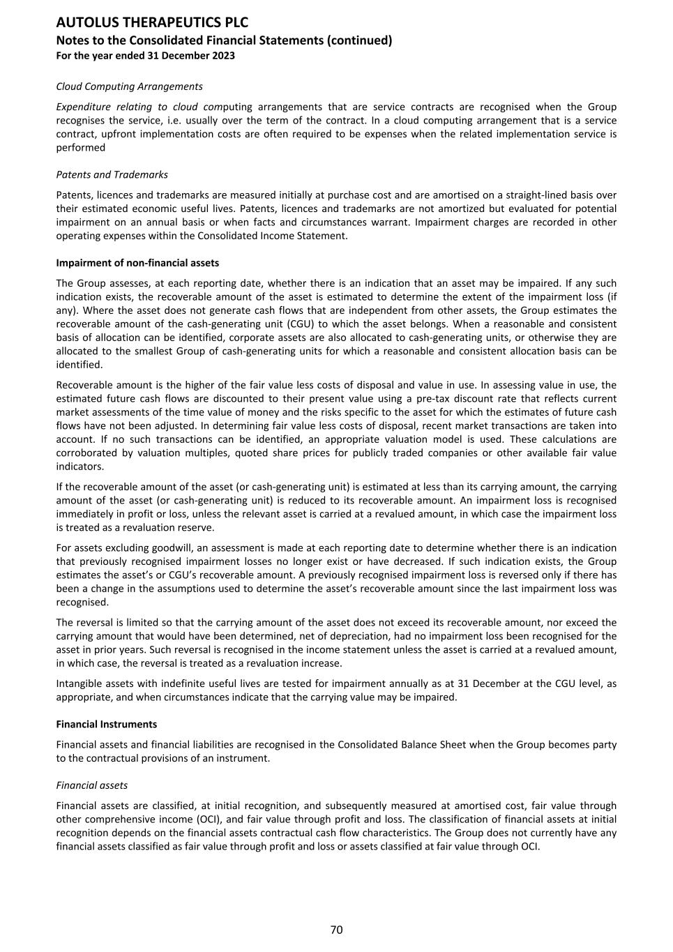 Cloud Computing Arrangements Expenditure relating to cloud computing arrangements that are service contracts are recognised when the Group recognises the service, i.e. usually over the term of the contract. In a cloud computing arrangement that is a service contract, upfront implementation costs are often required to be expenses when the related implementation service is performed Patents and Trademarks Patents, licences and trademarks are measured initially at purchase cost and are amortised on a straight-lined basis over their estimated economic useful lives. Patents, licences and trademarks are not amortized but evaluated for potential impairment on an annual basis or when facts and circumstances warrant. Impairment charges are recorded in other operating expenses within the Consolidated Income Statement. Impairment of non-financial assets The Group assesses, at each reporting date, whether there is an indication that an asset may be impaired. If any such indication exists, the recoverable amount of the asset is estimated to determine the extent of the impairment loss (if any). Where the asset does not generate cash flows that are independent from other assets, the Group estimates the recoverable amount of the cash-generating unit (CGU) to which the asset belongs. When a reasonable and consistent basis of allocation can be identified, corporate assets are also allocated to cash-generating units, or otherwise they are allocated to the smallest Group of cash-generating units for which a reasonable and consistent allocation basis can be identified. Recoverable amount is the higher of the fair value less costs of disposal and value in use. In assessing value in use, the estimated future cash flows are discounted to their present value using a pre-tax discount rate that reflects current market assessments of the time value of money and the risks specific to the asset for which the estimates of future cash flows have not been adjusted. In determining fair value less costs of disposal, recent market transactions are taken into account. If no such transactions can be identified, an appropriate valuation model is used. These calculations are corroborated by valuation multiples, quoted share prices for publicly traded companies or other available fair value indicators. If the recoverable amount of the asset (or cash-generating unit) is estimated at less than its carrying amount, the carrying amount of the asset (or cash-generating unit) is reduced to its recoverable amount. An impairment loss is recognised immediately in profit or loss, unless the relevant asset is carried at a revalued amount, in which case the impairment loss is treated as a revaluation reserve. For assets excluding goodwill, an assessment is made at each reporting date to determine whether there is an indication that previously recognised impairment losses no longer exist or have decreased. If such indication exists, the Group estimates the asset’s or CGU’s recoverable amount. A previously recognised impairment loss is reversed only if there has been a change in the assumptions used to determine the asset’s recoverable amount since the last impairment loss was recognised. The reversal is limited so that the carrying amount of the asset does not exceed its recoverable amount, nor exceed the carrying amount that would have been determined, net of depreciation, had no impairment loss been recognised for the asset in prior years. Such reversal is recognised in the income statement unless the asset is carried at a revalued amount, in which case, the reversal is treated as a revaluation increase. Intangible assets with indefinite useful lives are tested for impairment annually as at 31 December at the CGU level, as appropriate, and when circumstances indicate that the carrying value may be impaired. Financial Instruments Financial assets and financial liabilities are recognised in the Consolidated Balance Sheet when the Group becomes party to the contractual provisions of an instrument. Financial assets Financial assets are classified, at initial recognition, and subsequently measured at amortised cost, fair value through other comprehensive income (OCI), and fair value through profit and loss. The classification of financial assets at initial recognition depends on the financial assets contractual cash flow characteristics. The Group does not currently have any financial assets classified as fair value through profit and loss or assets classified at fair value through OCI. AUTOLUS THERAPEUTICS PLC Notes to the Consolidated Financial Statements (continued) For the year ended 31 December 2023 70