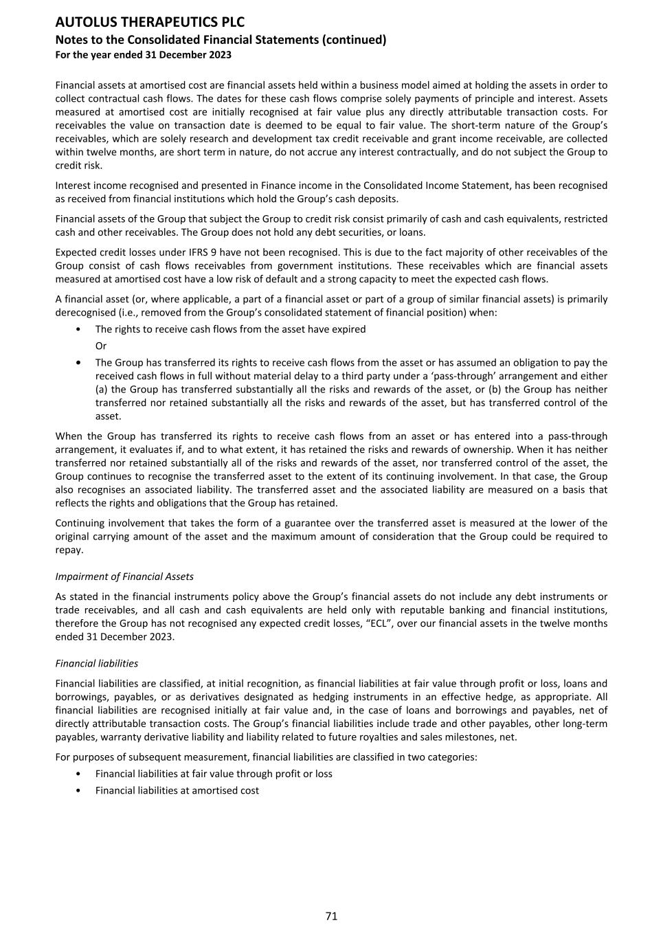 Financial assets at amortised cost are financial assets held within a business model aimed at holding the assets in order to collect contractual cash flows. The dates for these cash flows comprise solely payments of principle and interest. Assets measured at amortised cost are initially recognised at fair value plus any directly attributable transaction costs. For receivables the value on transaction date is deemed to be equal to fair value. The short-term nature of the Group’s receivables, which are solely research and development tax credit receivable and grant income receivable, are collected within twelve months, are short term in nature, do not accrue any interest contractually, and do not subject the Group to credit risk. Interest income recognised and presented in Finance income in the Consolidated Income Statement, has been recognised as received from financial institutions which hold the Group’s cash deposits. Financial assets of the Group that subject the Group to credit risk consist primarily of cash and cash equivalents, restricted cash and other receivables. The Group does not hold any debt securities, or loans. Expected credit losses under IFRS 9 have not been recognised. This is due to the fact majority of other receivables of the Group consist of cash flows receivables from government institutions. These receivables which are financial assets measured at amortised cost have a low risk of default and a strong capacity to meet the expected cash flows. A financial asset (or, where applicable, a part of a financial asset or part of a group of similar financial assets) is primarily derecognised (i.e., removed from the Group’s consolidated statement of financial position) when: • The rights to receive cash flows from the asset have expired Or • The Group has transferred its rights to receive cash flows from the asset or has assumed an obligation to pay the received cash flows in full without material delay to a third party under a ‘pass-through’ arrangement and either (a) the Group has transferred substantially all the risks and rewards of the asset, or (b) the Group has neither transferred nor retained substantially all the risks and rewards of the asset, but has transferred control of the asset. When the Group has transferred its rights to receive cash flows from an asset or has entered into a pass-through arrangement, it evaluates if, and to what extent, it has retained the risks and rewards of ownership. When it has neither transferred nor retained substantially all of the risks and rewards of the asset, nor transferred control of the asset, the Group continues to recognise the transferred asset to the extent of its continuing involvement. In that case, the Group also recognises an associated liability. The transferred asset and the associated liability are measured on a basis that reflects the rights and obligations that the Group has retained. Continuing involvement that takes the form of a guarantee over the transferred asset is measured at the lower of the original carrying amount of the asset and the maximum amount of consideration that the Group could be required to repay. Impairment of Financial Assets As stated in the financial instruments policy above the Group’s financial assets do not include any debt instruments or trade receivables, and all cash and cash equivalents are held only with reputable banking and financial institutions, therefore the Group has not recognised any expected credit losses, “ECL”, over our financial assets in the twelve months ended 31 December 2023. Financial liabilities Financial liabilities are classified, at initial recognition, as financial liabilities at fair value through profit or loss, loans and borrowings, payables, or as derivatives designated as hedging instruments in an effective hedge, as appropriate. All financial liabilities are recognised initially at fair value and, in the case of loans and borrowings and payables, net of directly attributable transaction costs. The Group’s financial liabilities include trade and other payables, other long-term payables, warranty derivative liability and liability related to future royalties and sales milestones, net. For purposes of subsequent measurement, financial liabilities are classified in two categories: • Financial liabilities at fair value through profit or loss • Financial liabilities at amortised cost AUTOLUS THERAPEUTICS PLC Notes to the Consolidated Financial Statements (continued) For the year ended 31 December 2023 71