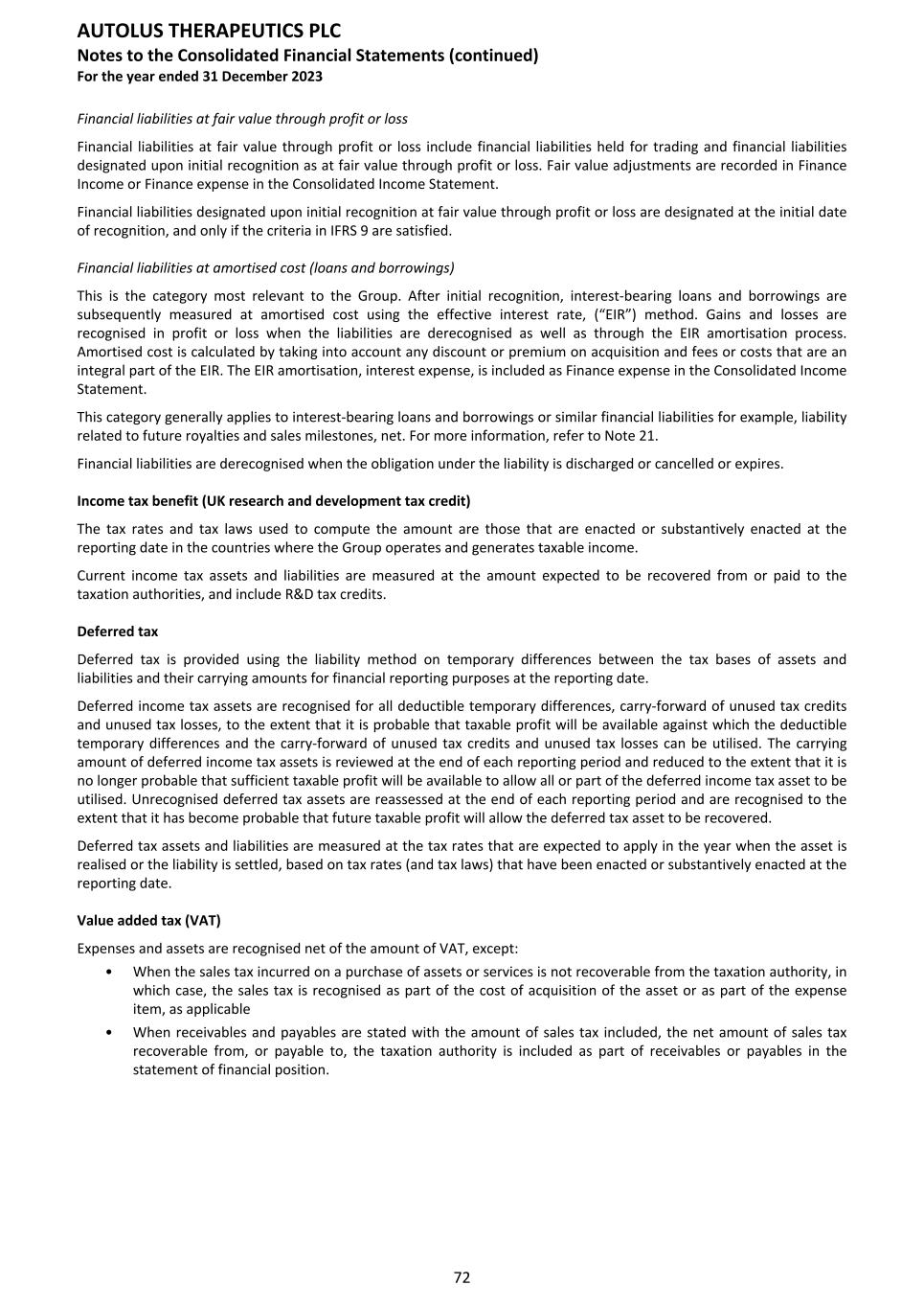 Financial liabilities at fair value through profit or loss Financial liabilities at fair value through profit or loss include financial liabilities held for trading and financial liabilities designated upon initial recognition as at fair value through profit or loss. Fair value adjustments are recorded in Finance Income or Finance expense in the Consolidated Income Statement. Financial liabilities designated upon initial recognition at fair value through profit or loss are designated at the initial date of recognition, and only if the criteria in IFRS 9 are satisfied. Financial liabilities at amortised cost (loans and borrowings) This is the category most relevant to the Group. After initial recognition, interest-bearing loans and borrowings are subsequently measured at amortised cost using the effective interest rate, (“EIR”) method. Gains and losses are recognised in profit or loss when the liabilities are derecognised as well as through the EIR amortisation process. Amortised cost is calculated by taking into account any discount or premium on acquisition and fees or costs that are an integral part of the EIR. The EIR amortisation, interest expense, is included as Finance expense in the Consolidated Income Statement. This category generally applies to interest-bearing loans and borrowings or similar financial liabilities for example, liability related to future royalties and sales milestones, net. For more information, refer to Note 21. Financial liabilities are derecognised when the obligation under the liability is discharged or cancelled or expires. Income tax benefit (UK research and development tax credit) The tax rates and tax laws used to compute the amount are those that are enacted or substantively enacted at the reporting date in the countries where the Group operates and generates taxable income. Current income tax assets and liabilities are measured at the amount expected to be recovered from or paid to the taxation authorities, and include R&D tax credits. Deferred tax Deferred tax is provided using the liability method on temporary differences between the tax bases of assets and liabilities and their carrying amounts for financial reporting purposes at the reporting date. Deferred income tax assets are recognised for all deductible temporary differences, carry-forward of unused tax credits and unused tax losses, to the extent that it is probable that taxable profit will be available against which the deductible temporary differences and the carry-forward of unused tax credits and unused tax losses can be utilised. The carrying amount of deferred income tax assets is reviewed at the end of each reporting period and reduced to the extent that it is no longer probable that sufficient taxable profit will be available to allow all or part of the deferred income tax asset to be utilised. Unrecognised deferred tax assets are reassessed at the end of each reporting period and are recognised to the extent that it has become probable that future taxable profit will allow the deferred tax asset to be recovered. Deferred tax assets and liabilities are measured at the tax rates that are expected to apply in the year when the asset is realised or the liability is settled, based on tax rates (and tax laws) that have been enacted or substantively enacted at the reporting date. Value added tax (VAT) Expenses and assets are recognised net of the amount of VAT, except: • When the sales tax incurred on a purchase of assets or services is not recoverable from the taxation authority, in which case, the sales tax is recognised as part of the cost of acquisition of the asset or as part of the expense item, as applicable • When receivables and payables are stated with the amount of sales tax included, the net amount of sales tax recoverable from, or payable to, the taxation authority is included as part of receivables or payables in the statement of financial position. AUTOLUS THERAPEUTICS PLC Notes to the Consolidated Financial Statements (continued) For the year ended 31 December 2023 72
