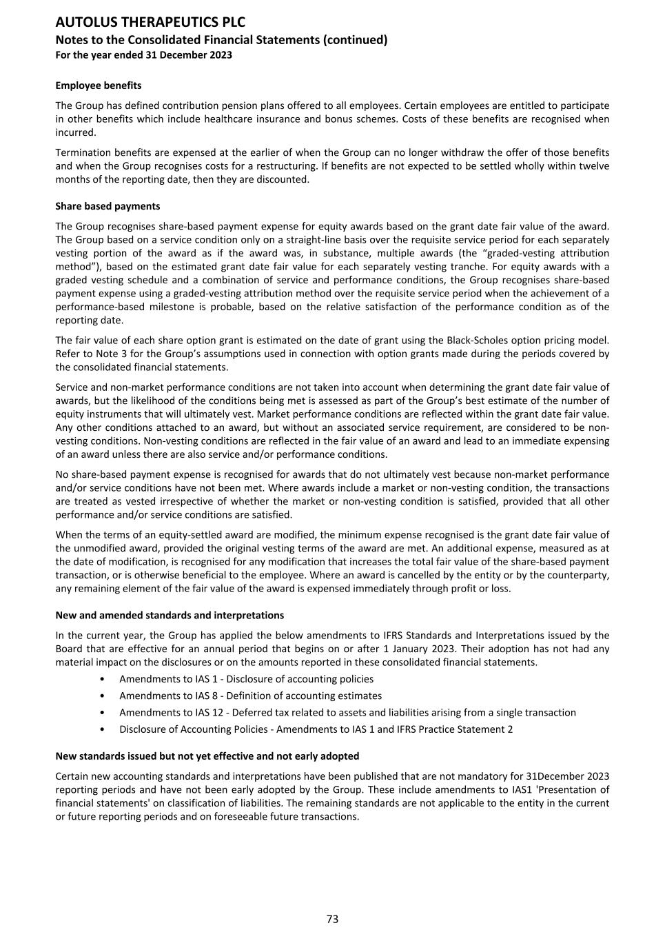 Employee benefits The Group has defined contribution pension plans offered to all employees. Certain employees are entitled to participate in other benefits which include healthcare insurance and bonus schemes. Costs of these benefits are recognised when incurred. Termination benefits are expensed at the earlier of when the Group can no longer withdraw the offer of those benefits and when the Group recognises costs for a restructuring. If benefits are not expected to be settled wholly within twelve months of the reporting date, then they are discounted. Share based payments The Group recognises share-based payment expense for equity awards based on the grant date fair value of the award. The Group based on a service condition only on a straight-line basis over the requisite service period for each separately vesting portion of the award as if the award was, in substance, multiple awards (the “graded-vesting attribution method”), based on the estimated grant date fair value for each separately vesting tranche. For equity awards with a graded vesting schedule and a combination of service and performance conditions, the Group recognises share-based payment expense using a graded-vesting attribution method over the requisite service period when the achievement of a performance-based milestone is probable, based on the relative satisfaction of the performance condition as of the reporting date. The fair value of each share option grant is estimated on the date of grant using the Black-Scholes option pricing model. Refer to Note 3 for the Group’s assumptions used in connection with option grants made during the periods covered by the consolidated financial statements. Service and non-market performance conditions are not taken into account when determining the grant date fair value of awards, but the likelihood of the conditions being met is assessed as part of the Group’s best estimate of the number of equity instruments that will ultimately vest. Market performance conditions are reflected within the grant date fair value. Any other conditions attached to an award, but without an associated service requirement, are considered to be non- vesting conditions. Non-vesting conditions are reflected in the fair value of an award and lead to an immediate expensing of an award unless there are also service and/or performance conditions. No share-based payment expense is recognised for awards that do not ultimately vest because non-market performance and/or service conditions have not been met. Where awards include a market or non-vesting condition, the transactions are treated as vested irrespective of whether the market or non-vesting condition is satisfied, provided that all other performance and/or service conditions are satisfied. When the terms of an equity-settled award are modified, the minimum expense recognised is the grant date fair value of the unmodified award, provided the original vesting terms of the award are met. An additional expense, measured as at the date of modification, is recognised for any modification that increases the total fair value of the share-based payment transaction, or is otherwise beneficial to the employee. Where an award is cancelled by the entity or by the counterparty, any remaining element of the fair value of the award is expensed immediately through profit or loss. New and amended standards and interpretations In the current year, the Group has applied the below amendments to IFRS Standards and Interpretations issued by the Board that are effective for an annual period that begins on or after 1 January 2023. Their adoption has not had any material impact on the disclosures or on the amounts reported in these consolidated financial statements. • Amendments to IAS 1 - Disclosure of accounting policies • Amendments to IAS 8 - Definition of accounting estimates • Amendments to IAS 12 - Deferred tax related to assets and liabilities arising from a single transaction • Disclosure of Accounting Policies - Amendments to IAS 1 and IFRS Practice Statement 2 New standards issued but not yet effective and not early adopted Certain new accounting standards and interpretations have been published that are not mandatory for 31December 2023 reporting periods and have not been early adopted by the Group. These include amendments to IAS1 'Presentation of financial statements' on classification of liabilities. The remaining standards are not applicable to the entity in the current or future reporting periods and on foreseeable future transactions. AUTOLUS THERAPEUTICS PLC Notes to the Consolidated Financial Statements (continued) For the year ended 31 December 2023 73