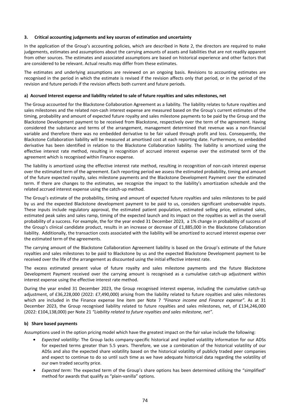 3. Critical accounting judgements and key sources of estimation and uncertainty In the application of the Group’s accounting policies, which are described in Note 2, the directors are required to make judgements, estimates and assumptions about the carrying amounts of assets and liabilities that are not readily apparent from other sources. The estimates and associated assumptions are based on historical experience and other factors that are considered to be relevant. Actual results may differ from these estimates. The estimates and underlying assumptions are reviewed on an ongoing basis. Revisions to accounting estimates are recognised in the period in which the estimate is revised if the revision affects only that period, or in the period of the revision and future periods if the revision affects both current and future periods. a) Accrued Interest expense and liability related to sale of future royalties and sales milestones, net The Group accounted for the Blackstone Collaboration Agreement as a liability. The liability relates to future royalties and sales milestones and the related non-cash interest expense are measured based on the Group's current estimates of the timing, probability and amount of expected future royalty and sales milestone payments to be paid by the Group and the Blackstone Development payment to be received from Blackstone, respectively over the term of the agreement. Having considered the substance and terms of the arrangement, management determined that revenue was a non-financial variable and therefore there was no embedded derivative to be fair valued through profit and loss. Consequently, the Blackstone Collaboration liability will be measured at amortised cost at each reporting date. Furthermore, no embedded derivative has been identified in relation to the Blackstone Collaboration liability. The liability is amortized using the effective interest rate method, resulting in recognition of accrued interest expense over the estimated term of the agreement which is recognised within Finance expense. The liability is amortized using the effective interest rate method, resulting in recognition of non-cash interest expense over the estimated term of the agreement. Each reporting period we assess the estimated probability, timing and amount of the future expected royalty, sales milestone payments and the Blackstone Development Payment over the estimated term. If there are changes to the estimates, we recognize the impact to the liability’s amortization schedule and the related accrued interest expense using the catch-up method. The Group’s estimate of the probability, timing and amount of expected future royalties and sales milestones to be paid by us and the expected Blackstone development payment to be paid to us, considers significant unobservable inputs. These inputs include regulatory approval, the estimated patient population, estimated selling price, estimated sales, estimated peak sales and sales ramp, timing of the expected launch and its impact on the royalties as well as the overall probability of a success. For example, the for the year ended 31 December 2023, a 1% change in probability of success of the Group’s clinical candidate product, results in an increase or decrease of £1,885,000 in the Blackstone Collaboration liability. Additionally, the transaction costs associated with the liability will be amortized to accrued interest expense over the estimated term of the agreements. The carrying amount of the Blackstone Collaboration Agreement liability is based on the Group’s estimate of the future royalties and sales milestones to be paid to Blackstone by us and the expected Blackstone Development payment to be received over the life of the arrangement as discounted using the initial effective interest rate. The excess estimated present value of future royalty and sales milestone payments and the future Blackstone Development Payment received over the carrying amount is recognised as a cumulative catch-up adjustment within interest expense using the effective interest rate method. During the year ended 31 December 2023, the Group recognised interest expense, including the cumulative catch-up adjustment, of £36,228,000 (2022: £7,490,000) arising from the liability related to future royalties and sales milestones which are included in the Finance expense line item per Note 7 “Finance income and Finance expense”. As at 31 December 2023, the Group recognised liability related to future royalties and sales milestones, net, of £134,246,000 (2022: £104,138,000) per Note 21 “Liability related to future royalties and sales milestone, net”. b) Share based payments Assumptions used in the option pricing model which have the greatest impact on the fair value include the following: • Expected volatility: The Group lacks company-specific historical and implied volatility information for our ADSs for expected terms greater than 5.5 years. Therefore, we use a combination of the historical volatility of our ADSs and also the expected share volatility based on the historical volatility of publicly traded peer companies and expect to continue to do so until such time as we have adequate historical data regarding the volatility of our own traded security price. • Expected term: The expected term of the Group’s share options has been determined utilising the “simplified” method for awards that qualify as “plain-vanilla” options. 74
