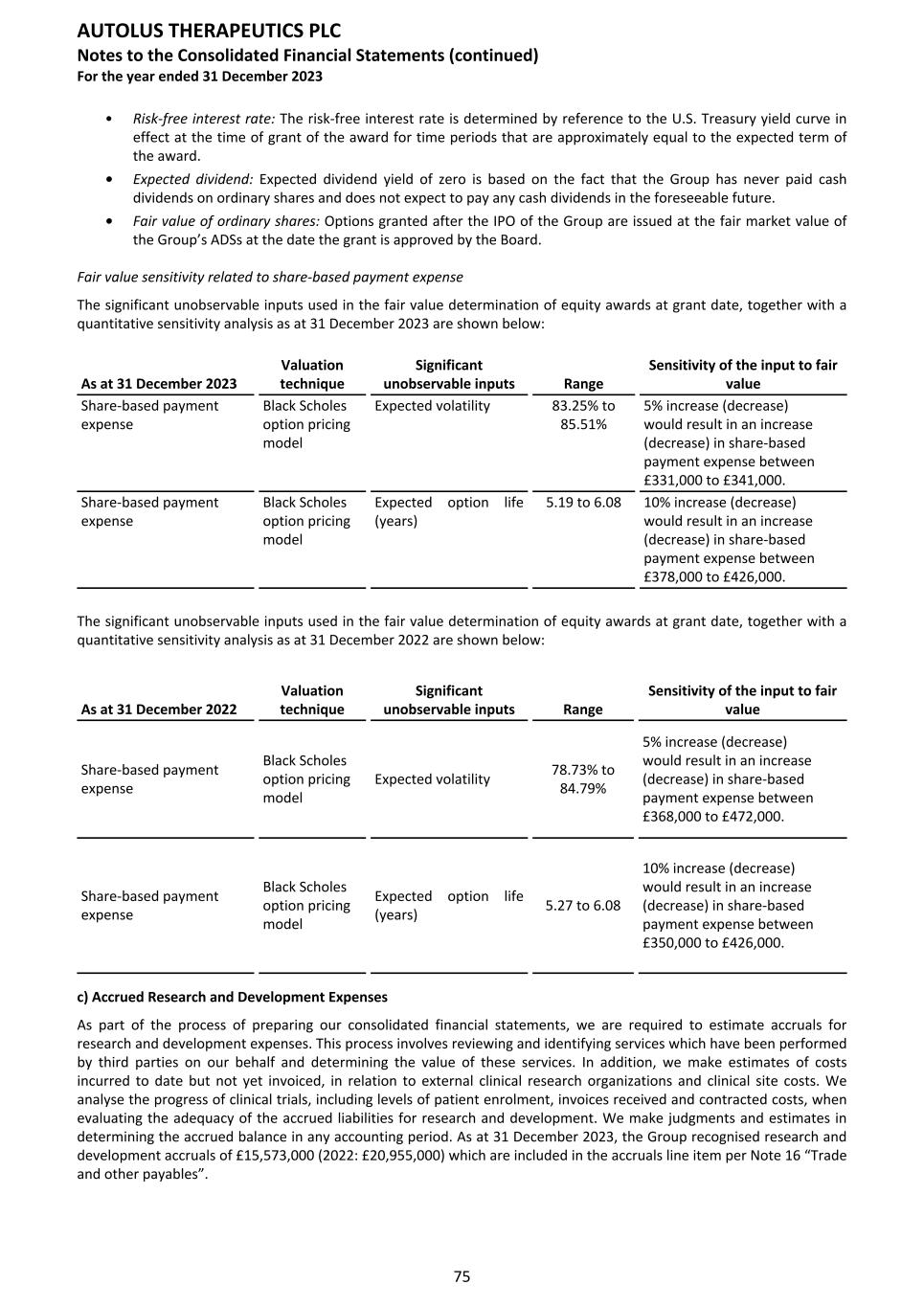 • Risk-free interest rate: The risk-free interest rate is determined by reference to the U.S. Treasury yield curve in effect at the time of grant of the award for time periods that are approximately equal to the expected term of the award. • Expected dividend: Expected dividend yield of zero is based on the fact that the Group has never paid cash dividends on ordinary shares and does not expect to pay any cash dividends in the foreseeable future. • Fair value of ordinary shares: Options granted after the IPO of the Group are issued at the fair market value of the Group’s ADSs at the date the grant is approved by the Board. Fair value sensitivity related to share-based payment expense The significant unobservable inputs used in the fair value determination of equity awards at grant date, together with a quantitative sensitivity analysis as at 31 December 2023 are shown below: As at 31 December 2023 Valuation technique Significant unobservable inputs Range Sensitivity of the input to fair value Share-based payment expense Black Scholes option pricing model Expected volatility 83.25% to 85.51% 5% increase (decrease) would result in an increase (decrease) in share-based payment expense between £331,000 to £341,000. Share-based payment expense Black Scholes option pricing model Expected option life (years) 5.19 to 6.08 10% increase (decrease) would result in an increase (decrease) in share-based payment expense between £378,000 to £426,000. The significant unobservable inputs used in the fair value determination of equity awards at grant date, together with a quantitative sensitivity analysis as at 31 December 2022 are shown below: As at 31 December 2022 Valuation technique Significant unobservable inputs Range Sensitivity of the input to fair value Share-based payment expense Black Scholes option pricing model Expected volatility 78.73% to 84.79% 5% increase (decrease) would result in an increase (decrease) in share-based payment expense between £368,000 to £472,000. Share-based payment expense Black Scholes option pricing model Expected option life (years) 5.27 to 6.08 10% increase (decrease) would result in an increase (decrease) in share-based payment expense between £350,000 to £426,000. c) Accrued Research and Development Expenses As part of the process of preparing our consolidated financial statements, we are required to estimate accruals for research and development expenses. This process involves reviewing and identifying services which have been performed by third parties on our behalf and determining the value of these services. In addition, we make estimates of costs incurred to date but not yet invoiced, in relation to external clinical research organizations and clinical site costs. We analyse the progress of clinical trials, including levels of patient enrolment, invoices received and contracted costs, when evaluating the adequacy of the accrued liabilities for research and development. We make judgments and estimates in determining the accrued balance in any accounting period. As at 31 December 2023, the Group recognised research and development accruals of £15,573,000 (2022: £20,955,000) which are included in the accruals line item per Note 16 “Trade and other payables”. AUTOLUS THERAPEUTICS PLC Notes to the Consolidated Financial Statements (continued) For the year ended 31 December 2023 75