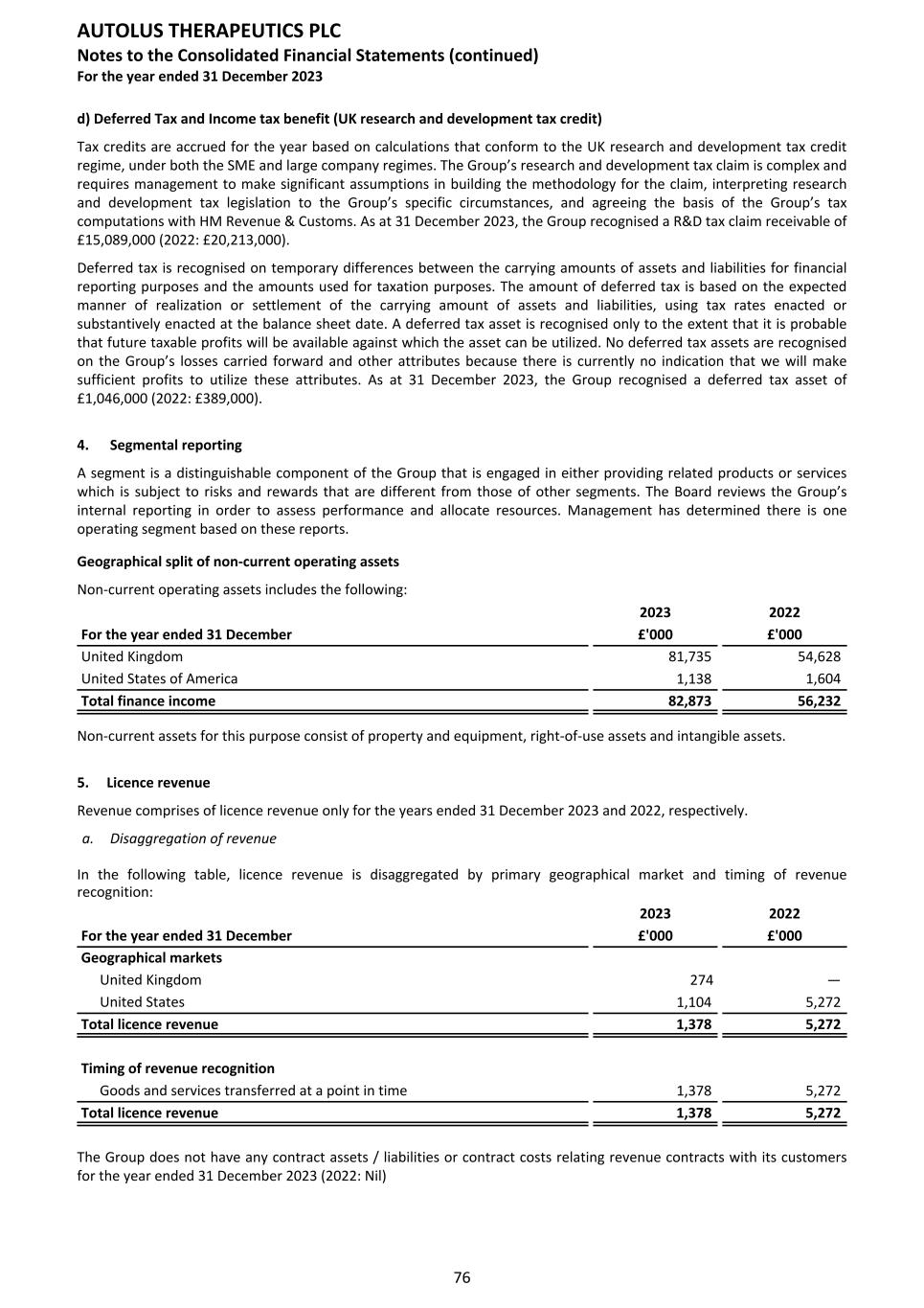 d) Deferred Tax and Income tax benefit (UK research and development tax credit) Tax credits are accrued for the year based on calculations that conform to the UK research and development tax credit regime, under both the SME and large company regimes. The Group’s research and development tax claim is complex and requires management to make significant assumptions in building the methodology for the claim, interpreting research and development tax legislation to the Group’s specific circumstances, and agreeing the basis of the Group’s tax computations with HM Revenue & Customs. As at 31 December 2023, the Group recognised a R&D tax claim receivable of £15,089,000 (2022: £20,213,000). Deferred tax is recognised on temporary differences between the carrying amounts of assets and liabilities for financial reporting purposes and the amounts used for taxation purposes. The amount of deferred tax is based on the expected manner of realization or settlement of the carrying amount of assets and liabilities, using tax rates enacted or substantively enacted at the balance sheet date. A deferred tax asset is recognised only to the extent that it is probable that future taxable profits will be available against which the asset can be utilized. No deferred tax assets are recognised on the Group’s losses carried forward and other attributes because there is currently no indication that we will make sufficient profits to utilize these attributes. As at 31 December 2023, the Group recognised a deferred tax asset of £1,046,000 (2022: £389,000). 4. Segmental reporting A segment is a distinguishable component of the Group that is engaged in either providing related products or services which is subject to risks and rewards that are different from those of other segments. The Board reviews the Group’s internal reporting in order to assess performance and allocate resources. Management has determined there is one operating segment based on these reports. Geographical split of non-current operating assets Non-current operating assets includes the following: 2023 2022 For the year ended 31 December £'000 £'000 United Kingdom 81,735 54,628 United States of America 1,138 1,604 Total finance income 82,873 56,232 Non-current assets for this purpose consist of property and equipment, right-of-use assets and intangible assets. 5. Licence revenue Revenue comprises of licence revenue only for the years ended 31 December 2023 and 2022, respectively. a. Disaggregation of revenue In the following table, licence revenue is disaggregated by primary geographical market and timing of revenue recognition: 2023 2022 For the year ended 31 December £'000 £'000 Geographical markets United Kingdom 274 — United States 1,104 5,272 Total licence revenue 1,378 5,272 Timing of revenue recognition Goods and services transferred at a point in time 1,378 5,272 Total licence revenue 1,378 5,272 The Group does not have any contract assets / liabilities or contract costs relating revenue contracts with its customers for the year ended 31 December 2023 (2022: Nil) AUTOLUS THERAPEUTICS PLC Notes to the Consolidated Financial Statements (continued) For the year ended 31 December 2023 76