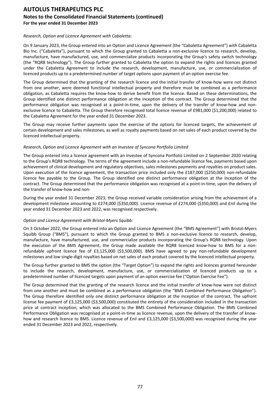 Research, Option and Licence Agreement with Cabaletta: On 9 January 2023, the Group entered into an Option and Licence Agreement (the “Cabaletta Agreement”) with Cabaletta Bio Inc. (“Cabaletta”), pursuant to which the Group granted to Cabaletta a non-exclusive licence to research, develop, manufacture, have manufactured, use, and commercialize products incorporating the Group's safety switch technology (the “RQR8 technology”). The Group further granted to Cabaletta the option to expand the rights and licences granted under the Cabaletta Agreement to include the research, development, manufacture, use, or commercialization of licenced products up to a predetermined number of target options upon payment of an option exercise fee. The Group determined that the granting of the research licence and the initial transfer of know-how were not distinct from one another, were deemed functional intellectual property and therefore must be combined as a performance obligation, as Cabaletta requires the know-how to derive benefit from the licence. Based on these determinations, the Group identified one distinct performance obligation at the inception of the contract. The Group determined that the performance obligation was recognised at a point-in-time, upon the delivery of the transfer of know-how and non- exclusive licence to Cabaletta. The Group therefore recognised total licence revenue of £981,000 ($1,200,000) related to the Cabaletta Agreement for the year ended 31 December 2023. The Group may receive further payments upon the exercise of the options for licenced targets, the achievement of certain development and sales milestones, as well as royalty payments based on net sales of each product covered by the licenced intellectual property. Research, Option and Licence Agreement with an Investee of Syncona Portfolio Limited The Group entered into a licence agreement with an investee of Syncona Portfolio Limited on 2 September 2020 relating to the Group's RQR8 technology. The terms of the agreement include a non-refundable licence fee, payments based upon achievement of clinical development and regulatory objectives, sales milestones payments and royalties on product sales. Upon execution of the licence agreement, the transaction price included only the £187,000 ($250,000) non-refundable licence fee payable to the Group. The Group identified one distinct performance obligation at the inception of the contract. The Group determined that the performance obligation was recognised at a point-in-time, upon the delivery of the transfer of know-how and non- During the year ended 31 December 2023, the Group received variable consideration arising from the achievement of a development milestone amounting to £274,000 ($350,000). Licence revenue of £274,000 ($350,000) and £nil during the year ended 31 December 2023 and 2022, was recognised respectively. Option and Licence Agreement with Bristol-Myers Squibb: On 3 October 2022, the Group entered into an Option and Licence Agreement (the “BMS Agreement”) with Bristol-Myers Squibb Group (“BMS”), pursuant to which the Group granted to BMS a non-exclusive licence to research, develop, manufacture, have manufactured, use, and commercialize products incorporating the Group's RQR8 technology. Upon the execution of the BMS Agreement, the Group made available the RQR8 licenced know-how to BMS for a non- refundable upfront licence fee of £3,125,000 ($3,500,000). BMS have agreed to pay non-refundable development milestones and low single-digit royalties based on net sales of each product covered by the licenced intellectual property. The Group further granted to BMS the option (the “Target Option”) to expand the rights and licences granted hereunder to include the research, development, manufacture, use, or commercialization of licenced products up to a predetermined number of licenced targets upon payment of an option exercise fee (“Option Exercise Fee”). The Group determined that the granting of the research licence and the initial transfer of know-how were not distinct from one another and must be combined as a performance obligation (the “BMS Combined Performance Obligation”). The Group therefore identified only one distinct performance obligation at the inception of the contract. The upfront license fee payment of £3,125,000 ($3,500,000) constituted the entirety of the consideration included in the transaction price at contract inception, which was allocated to the BMS Combined Performance Obligation. The BMS Combined Performance Obligation was recognised at a point-in-time as licence revenue, upon the delivery of the transfer of know- how and research licence to BMS. Licence revenue of £nil and £3,125,000 ($3,500,000) was recognised during the year ended 31 December 2023 and 2022, respectively. AUTOLUS THERAPEUTICS PLC Notes to the Consolidated Financial Statements (continued) For the year ended 31 December 2023 77
