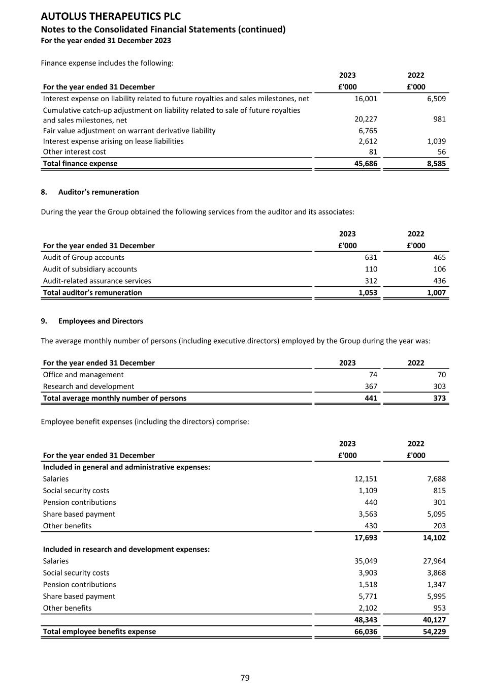 Finance expense includes the following: 2023 2022 For the year ended 31 December £'000 £'000 Interest expense on liability related to future royalties and sales milestones, net 16,001 6,509 Cumulative catch-up adjustment on liability related to sale of future royalties and sales milestones, net 20,227 981 Fair value adjustment on warrant derivative liability 6,765 Interest expense arising on lease liabilities 2,612 1,039 Other interest cost 81 56 Total finance expense 45,686 8,585 8. Auditor’s remuneration During the year the Group obtained the following services from the auditor and its associates: 2023 2022 For the year ended 31 December £'000 £'000 Audit of Group accounts 631 465 Audit of subsidiary accounts 110 106 Audit-related assurance services 312 436 Total auditor’s remuneration 1,053 1,007 9. Employees and Directors The average monthly number of persons (including executive directors) employed by the Group during the year was: For the year ended 31 December 2023 2022 Office and management 74 70 Research and development 367 303 Total average monthly number of persons 441 373 Employee benefit expenses (including the directors) comprise: 2023 2022 For the year ended 31 December £'000 £'000 Included in general and administrative expenses: Salaries 12,151 7,688 Social security costs 1,109 815 Pension contributions 440 301 Share based payment 3,563 5,095 Other benefits 430 203 17,693 14,102 Included in research and development expenses: Salaries 35,049 27,964 Social security costs 3,903 3,868 Pension contributions 1,518 1,347 Share based payment 5,771 5,995 Other benefits 2,102 953 48,343 40,127 Total employee benefits expense 66,036 54,229 AUTOLUS THERAPEUTICS PLC Notes to the Consolidated Financial Statements (continued) For the year ended 31 December 2023 79