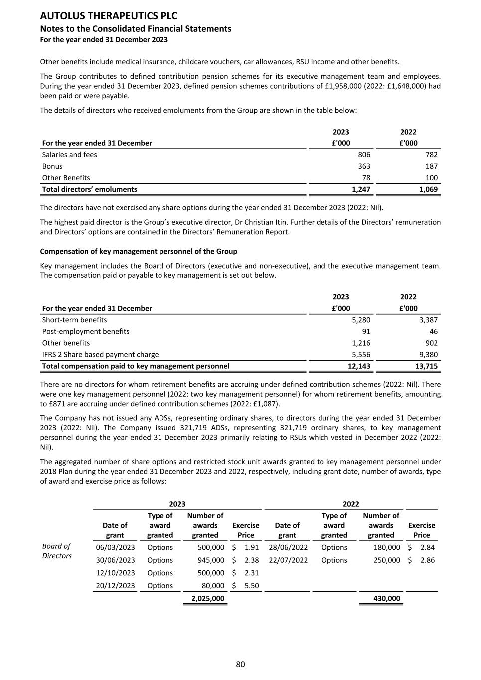 Other benefits include medical insurance, childcare vouchers, car allowances, RSU income and other benefits. The Group contributes to defined contribution pension schemes for its executive management team and employees. During the year ended 31 December 2023, defined pension schemes contributions of £1,958,000 (2022: £1,648,000) had been paid or were payable. The details of directors who received emoluments from the Group are shown in the table below: 2023 2022 For the year ended 31 December £'000 £'000 Salaries and fees 806 782 Bonus 363 187 Other Benefits 78 100 Total directors’ emoluments 1,247 1,069 The directors have not exercised any share options during the year ended 31 December 2023 (2022: Nil). The highest paid director is the Group’s executive director, Dr Christian Itin. Further details of the Directors’ remuneration and Directors’ options are contained in the Directors’ Remuneration Report. Compensation of key management personnel of the Group Key management includes the Board of Directors (executive and non-executive), and the executive management team. The compensation paid or payable to key management is set out below. 2023 2022 For the year ended 31 December £'000 £'000 Short-term benefits 5,280 3,387 Post-employment benefits 91 46 Other benefits 1,216 902 IFRS 2 Share based payment charge 5,556 9,380 Total compensation paid to key management personnel 12,143 13,715 There are no directors for whom retirement benefits are accruing under defined contribution schemes (2022: Nil). There were one key management personnel (2022: two key management personnel) for whom retirement benefits, amounting to £871 are accruing under defined contribution schemes (2022: £1,087). The Company has not issued any ADSs, representing ordinary shares, to directors during the year ended 31 December 2023 (2022: Nil). The Company issued 321,719 ADSs, representing 321,719 ordinary shares, to key management personnel during the year ended 31 December 2023 primarily relating to RSUs which vested in December 2022 (2022: Nil). The aggregated number of share options and restricted stock unit awards granted to key management personnel under 2018 Plan during the year ended 31 December 2023 and 2022, respectively, including grant date, number of awards, type of award and exercise price as follows: 2023 2022 Date of grant Type of award granted Number of awards granted Exercise Price Date of grant Type of award granted Number of awards granted Exercise Price Board of Directors 06/03/2023 Options 500,000 $ 1.91 28/06/2022 Options 180,000 $ 2.84 30/06/2023 Options 945,000 $ 2.38 22/07/2022 Options 250,000 $ 2.86 12/10/2023 Options 500,000 $ 2.31 20/12/2023 Options 80,000 $ 5.50 2,025,000 430,000 AUTOLUS THERAPEUTICS PLC Notes to the Consolidated Financial Statements For the year ended 31 December 2023 80