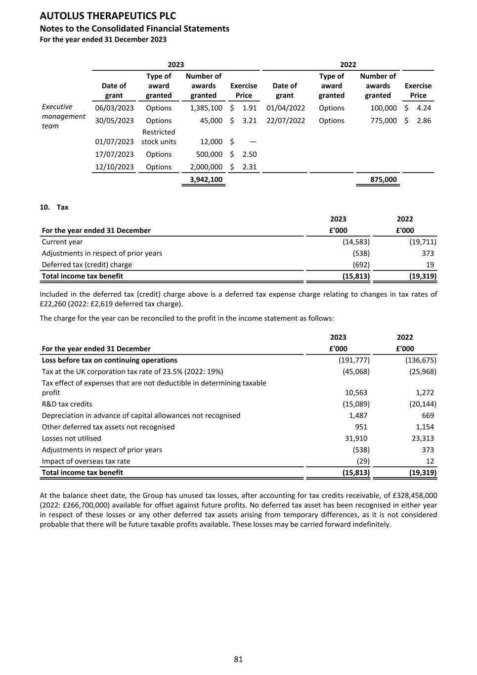 2023 2022 Date of grant Type of award granted Number of awards granted Exercise Price Date of grant Type of award granted Number of awards granted Exercise Price Executive management team 06/03/2023 Options 1,385,100 $ 1.91 01/04/2022 Options 100,000 $ 4.24 30/05/2023 Options 45,000 $ 3.21 22/07/2022 Options 775,000 $ 2.86 01/07/2023 Restricted stock units 12,000 $ — 17/07/2023 Options 500,000 $ 2.50 12/10/2023 Options 2,000,000 $ 2.31 3,942,100 875,000 10. Tax 2023 2022 For the year ended 31 December £'000 £'000 Current year (14,583) (19,711) Adjustments in respect of prior years (538) 373 Deferred tax (credit) charge (692) 19 Total income tax benefit (15,813) (19,319) Included in the deferred tax (credit) charge above is a deferred tax expense charge relating to changes in tax rates of £22,260 (2022: £2,619 deferred tax charge). The charge for the year can be reconciled to the profit in the income statement as follows: 2023 2022 For the year ended 31 December £'000 £'000 Loss before tax on continuing operations (191,777) (136,675) Tax at the UK corporation tax rate of 23.5% (2022: 19%) (45,068) (25,968) Tax effect of expenses that are not deductible in determining taxable profit 10,563 1,272 R&D tax credits (15,089) (20,144) Depreciation in advance of capital allowances not recognised 1,487 669 Other deferred tax assets not recognised 951 1,154 Losses not utilised 31,910 23,313 Adjustments in respect of prior years (538) 373 Impact of overseas tax rate (29) 12 Total income tax benefit (15,813) (19,319) At the balance sheet date, the Group has unused tax losses, after accounting for tax credits receivable, of £328,458,000 (2022: £266,700,000) available for offset against future profits. No deferred tax asset has been recognised in either year in respect of these losses or any other deferred tax assets arising from temporary differences, as it is not considered probable that there will be future taxable profits available. These losses may be carried forward indefinitely. AUTOLUS THERAPEUTICS PLC Notes to the Consolidated Financial Statements For the year ended 31 December 2023 81