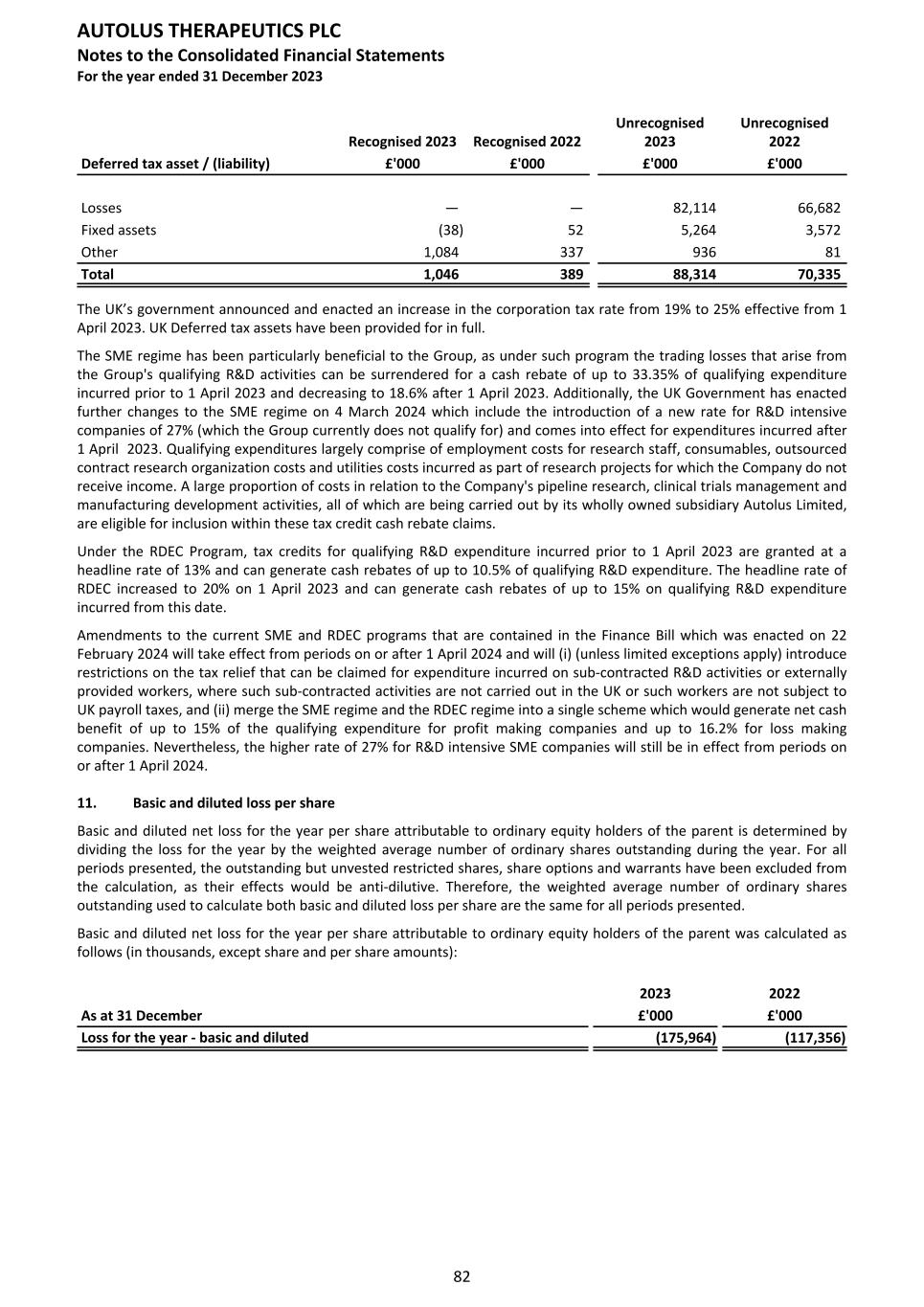 Recognised 2023 Recognised 2022 Unrecognised 2023 Unrecognised 2022 Deferred tax asset / (liability) £'000 £'000 £'000 £'000 Losses — — 82,114 66,682 Fixed assets (38) 52 5,264 3,572 Other 1,084 337 936 81 Total 1,046 389 88,314 70,335 The UK’s government announced and enacted an increase in the corporation tax rate from 19% to 25% effective from 1 April 2023. UK Deferred tax assets have been provided for in full. The SME regime has been particularly beneficial to the Group, as under such program the trading losses that arise from the Group's qualifying R&D activities can be surrendered for a cash rebate of up to 33.35% of qualifying expenditure incurred prior to 1 April 2023 and decreasing to 18.6% after 1 April 2023. Additionally, the UK Government has enacted further changes to the SME regime on 4 March 2024 which include the introduction of a new rate for R&D intensive companies of 27% (which the Group currently does not qualify for) and comes into effect for expenditures incurred after 1 April 2023. Qualifying expenditures largely comprise of employment costs for research staff, consumables, outsourced contract research organization costs and utilities costs incurred as part of research projects for which the Company do not receive income. A large proportion of costs in relation to the Company's pipeline research, clinical trials management and manufacturing development activities, all of which are being carried out by its wholly owned subsidiary Autolus Limited, are eligible for inclusion within these tax credit cash rebate claims. Under the RDEC Program, tax credits for qualifying R&D expenditure incurred prior to 1 April 2023 are granted at a headline rate of 13% and can generate cash rebates of up to 10.5% of qualifying R&D expenditure. The headline rate of RDEC increased to 20% on 1 April 2023 and can generate cash rebates of up to 15% on qualifying R&D expenditure incurred from this date. Amendments to the current SME and RDEC programs that are contained in the Finance Bill which was enacted on 22 February 2024 will take effect from periods on or after 1 April 2024 and will (i) (unless limited exceptions apply) introduce restrictions on the tax relief that can be claimed for expenditure incurred on sub-contracted R&D activities or externally provided workers, where such sub-contracted activities are not carried out in the UK or such workers are not subject to UK payroll taxes, and (ii) merge the SME regime and the RDEC regime into a single scheme which would generate net cash benefit of up to 15% of the qualifying expenditure for profit making companies and up to 16.2% for loss making companies. Nevertheless, the higher rate of 27% for R&D intensive SME companies will still be in effect from periods on or after 1 April 2024. 11. Basic and diluted loss per share Basic and diluted net loss for the year per share attributable to ordinary equity holders of the parent is determined by dividing the loss for the year by the weighted average number of ordinary shares outstanding during the year. For all periods presented, the outstanding but unvested restricted shares, share options and warrants have been excluded from the calculation, as their effects would be anti-dilutive. Therefore, the weighted average number of ordinary shares outstanding used to calculate both basic and diluted loss per share are the same for all periods presented. Basic and diluted net loss for the year per share attributable to ordinary equity holders of the parent was calculated as follows (in thousands, except share and per share amounts): 2023 2022 As at 31 December £'000 £'000 Loss for the year - basic and diluted (175,964) (117,356) AUTOLUS THERAPEUTICS PLC Notes to the Consolidated Financial Statements For the year ended 31 December 2023 82