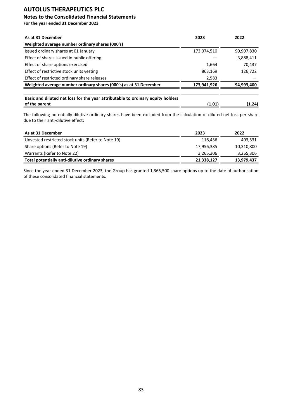 As at 31 December 2023 2022 Weighted average number ordinary shares (000's) Issued ordinary shares at 01 January 173,074,510 90,907,830 Effect of shares issued in public offering — 3,888,411 Effect of share options exercised 1,664 70,437 Effect of restrictive stock units vesting 863,169 126,722 Effect of restricted ordinary share releases 2,583 — Weighted average number ordinary shares (000's) as at 31 December 173,941,926 94,993,400 Basic and diluted net loss for the year attributable to ordinary equity holders of the parent (1.01) (1.24) The following potentially dilutive ordinary shares have been excluded from the calculation of diluted net loss per share due to their anti-dilutive effect: As at 31 December 2023 2022 Unvested restricted stock units (Refer to Note 19) 116,436 403,331 Share options (Refer to Note 19) 17,956,385 10,310,800 Warrants (Refer to Note 22) 3,265,306 3,265,306 Total potentially anti-dilutive ordinary shares 21,338,127 13,979,437 Since the year ended 31 December 2023, the Group has granted 1,365,500 share options up to the date of authorisation of these consolidated financial statements. AUTOLUS THERAPEUTICS PLC Notes to the Consolidated Financial Statements For the year ended 31 December 2023 83