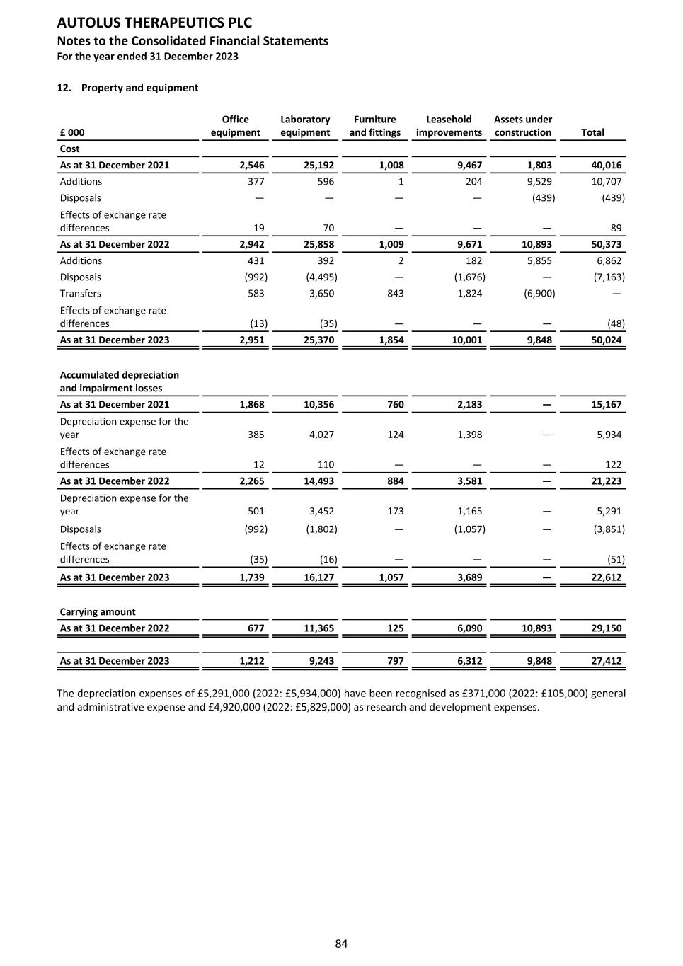 12. Property and equipment £ 000 Office equipment Laboratory equipment Furniture and fittings Leasehold improvements Assets under construction Total Cost As at 31 December 2021 2,546 25,192 1,008 9,467 1,803 40,016 Additions 377 596 1 204 9,529 10,707 Disposals — — — — (439) (439) Effects of exchange rate differences 19 70 — — — 89 As at 31 December 2022 2,942 25,858 1,009 9,671 10,893 50,373 Additions 431 392 2 182 5,855 6,862 Disposals (992) (4,495) — (1,676) — (7,163) Transfers 583 3,650 843 1,824 (6,900) — Effects of exchange rate differences (13) (35) — — — (48) As at 31 December 2023 2,951 25,370 1,854 10,001 9,848 50,024 Accumulated depreciation and impairment losses As at 31 December 2021 1,868 10,356 760 2,183 — 15,167 Depreciation expense for the year 385 4,027 124 1,398 — 5,934 Effects of exchange rate differences 12 110 — — — 122 As at 31 December 2022 2,265 14,493 884 3,581 — 21,223 Depreciation expense for the year 501 3,452 173 1,165 — 5,291 Disposals (992) (1,802) — (1,057) — (3,851) Effects of exchange rate differences (35) (16) — — — (51) As at 31 December 2023 1,739 16,127 1,057 3,689 — 22,612 Carrying amount As at 31 December 2022 677 11,365 125 6,090 10,893 29,150 As at 31 December 2023 1,212 9,243 797 6,312 9,848 27,412 The depreciation expenses of £5,291,000 (2022: £5,934,000) have been recognised as £371,000 (2022: £105,000) general and administrative expense and £4,920,000 (2022: £5,829,000) as research and development expenses. AUTOLUS THERAPEUTICS PLC Notes to the Consolidated Financial Statements For the year ended 31 December 2023 84