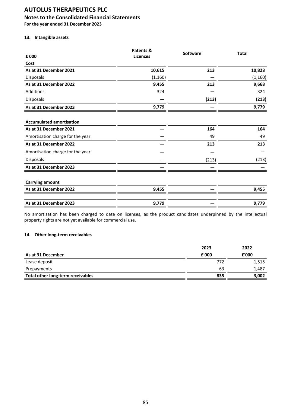 13. Intangible assets £ 000 Patents & Licences Software Total Cost As at 31 December 2021 10,615 213 10,828 Disposals (1,160) — (1,160) As at 31 December 2022 9,455 213 9,668 Additions 324 — 324 Disposals — (213) (213) As at 31 December 2023 9,779 — 9,779 Accumulated amortisation As at 31 December 2021 — 164 164 Amortisation charge for the year — 49 49 As at 31 December 2022 — 213 213 Amortisation charge for the year — — — Disposals — (213) (213) As at 31 December 2023 — — — Carrying amount As at 31 December 2022 9,455 — 9,455 As at 31 December 2023 9,779 — 9,779 No amortisation has been charged to date on licenses, as the product candidates underpinned by the intellectual property rights are not yet available for commercial use. 14. Other long-term receivables 2023 2022 As at 31 December £'000 £'000 Lease deposit 772 1,515 Prepayments 63 1,487 Total other long-term receivables 835 3,002 AUTOLUS THERAPEUTICS PLC Notes to the Consolidated Financial Statements For the year ended 31 December 2023 85