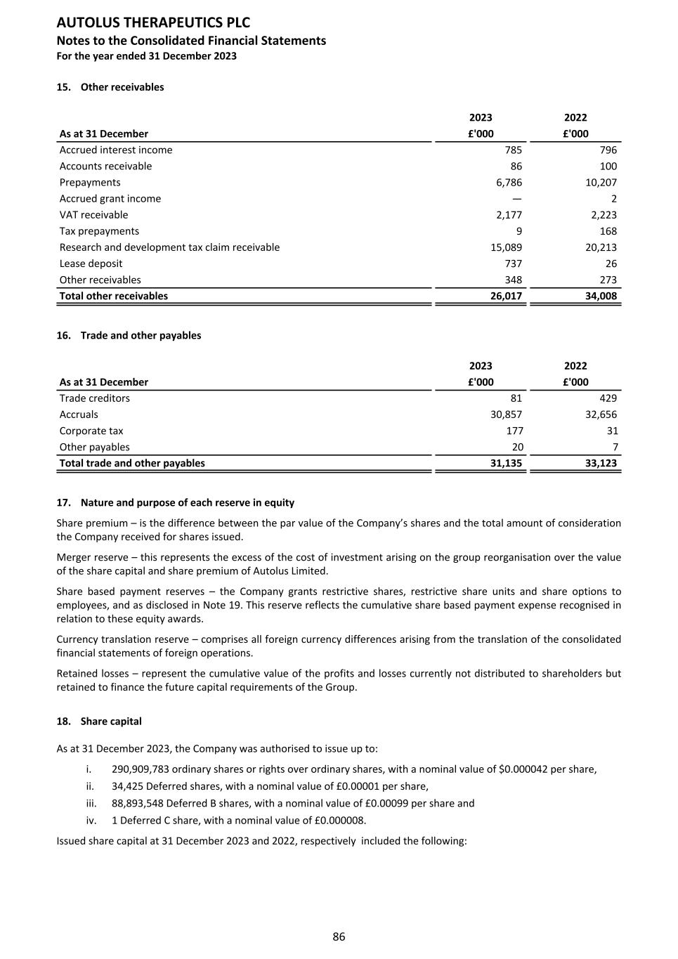 15. Other receivables 2023 2022 As at 31 December £'000 £'000 Accrued interest income 785 796 Accounts receivable 86 100 Prepayments 6,786 10,207 Accrued grant income — 2 VAT receivable 2,177 2,223 Tax prepayments 9 168 Research and development tax claim receivable 15,089 20,213 Lease deposit 737 26 Other receivables 348 273 Total other receivables 26,017 34,008 16. Trade and other payables 2023 2022 As at 31 December £'000 £'000 Trade creditors 81 429 Accruals 30,857 32,656 Corporate tax 177 31 Other payables 20 7 Total trade and other payables 31,135 33,123 17. Nature and purpose of each reserve in equity Share premium – is the difference between the par value of the Company’s shares and the total amount of consideration the Company received for shares issued. Merger reserve – this represents the excess of the cost of investment arising on the group reorganisation over the value of the share capital and share premium of Autolus Limited. Share based payment reserves – the Company grants restrictive shares, restrictive share units and share options to employees, and as disclosed in Note 19. This reserve reflects the cumulative share based payment expense recognised in relation to these equity awards. Currency translation reserve – comprises all foreign currency differences arising from the translation of the consolidated financial statements of foreign operations. Retained losses – represent the cumulative value of the profits and losses currently not distributed to shareholders but retained to finance the future capital requirements of the Group. 18. Share capital As at 31 December 2023, the Company was authorised to issue up to: i. 290,909,783 ordinary shares or rights over ordinary shares, with a nominal value of $0.000042 per share, ii. 34,425 Deferred shares, with a nominal value of £0.00001 per share, iii. 88,893,548 Deferred B shares, with a nominal value of £0.00099 per share and iv. 1 Deferred C share, with a nominal value of £0.000008. Issued share capital at 31 December 2023 and 2022, respectively included the following: AUTOLUS THERAPEUTICS PLC Notes to the Consolidated Financial Statements For the year ended 31 December 2023 86