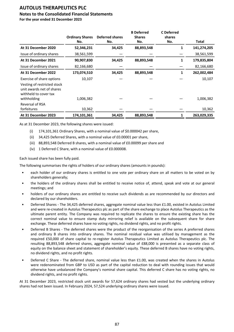 Ordinary Shares Deferred shares B Deferred Shares C Deferred shares No. No. No. No. Total At 31 December 2020 52,346,231 34,425 88,893,548 1 141,274,205 Issue of ordinary shares 38,561,599 — — — 38,561,599 At 31 December 2021 90,907,830 34,425 88,893,548 1 179,835,804 Issue of ordinary shares 82,166,680 — — — 82,166,680 At 31 December 2022 173,074,510 34,425 88,893,548 1 262,002,484 Exercise of share options 10,107 — — — 10,107 Vesting of restricted stock unit awards net of shares withheld to cover tax withholding 1,006,382 — — — 1,006,382 Reversal of RSA forfeitures 10,362 — — — 10,362 At 31 December 2023 174,101,361 34,425 88,893,548 1 263,029,335 As at 31 December 2023, the following shares were issued: (i) 174,101,361 Ordinary Shares, with a nominal value of $0.000042 per share, (ii) 34,425 Deferred Shares, with a nominal value of £0.00001 per share, (iii) 88,893,548 Deferred B shares, with a nominal value of £0.00099 per share and (iv) 1 Deferred C Share, with a nominal value of £0.000008. Each issued share has been fully paid. The following summarises the rights of holders of our ordinary shares (amounts in pounds): • each holder of our ordinary shares is entitled to one vote per ordinary share on all matters to be voted on by shareholders generally; • the holders of the ordinary shares shall be entitled to receive notice of, attend, speak and vote at our general meetings; and • holders of our ordinary shares are entitled to receive such dividends as are recommended by our directors and declared by our shareholders. • Deferred Shares - The 34,425 deferred shares, aggregate nominal value less than £1.00, existed in Autolus Limited and were re-created in Autolus Therapeutics plc as part of the share exchange to place Autolus Therapeutics as the ultimate parent entity. The Company was required to replicate the shares to ensure the existing share has the correct nominal value to ensure stamp duty mirroring relief is available on the subsequent share for share exchange. These deferred shares have no voting rights, no dividend rights, and no profit rights. • Deferred B Shares - The deferred shares were the product of the reorganisation of the series A preferred shares and ordinary B shares into ordinary shares. The nominal residual value was utilised by management as the required £50,000 of share capital to re-register Autolus Therapeutics Limited as Autolus Therapeutics plc. The resulting 88,893,548 deferred shares, aggregate nominal value of £88,000 is presented as a separate class of equity on the balance sheet and statement of shareholder’s equity. These deferred B shares have no voting rights, no dividend rights, and no profit rights. • Deferred C Share - The deferred share, nominal value less than £1.00, was created when the shares in Autolus were redenominated from GBP to USD as part of the capital reduction to deal with rounding issues that would otherwise have unbalanced the Company’s nominal share capital. This deferred C share has no voting rights, no dividend rights, and no profit rights. At 31 December 2023, restricted stock unit awards for 57,624 ordinary shares had vested but the underlying ordinary shares had not been issued. In February 2024, 57,524 underlying ordinary shares were issued. AUTOLUS THERAPEUTICS PLC Notes to the Consolidated Financial Statements For the year ended 31 December 2023 87