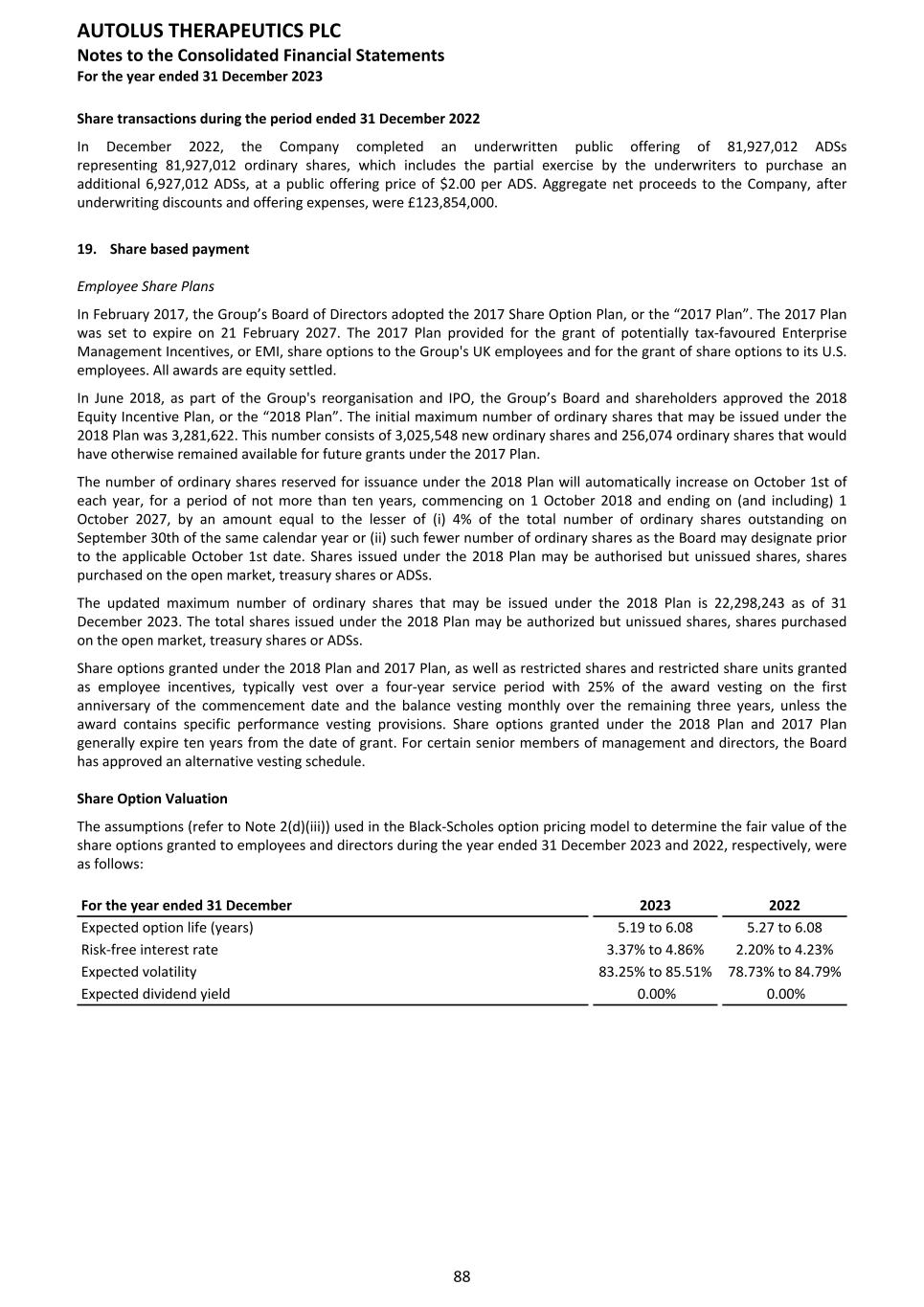 Share transactions during the period ended 31 December 2022 In December 2022, the Company completed an underwritten public offering of 81,927,012 ADSs representing 81,927,012 ordinary shares, which includes the partial exercise by the underwriters to purchase an additional 6,927,012 ADSs, at a public offering price of $2.00 per ADS. Aggregate net proceeds to the Company, after underwriting discounts and offering expenses, were £123,854,000. 19. Share based payment Employee Share Plans In February 2017, the Group’s Board of Directors adopted the 2017 Share Option Plan, or the “2017 Plan”. The 2017 Plan was set to expire on 21 February 2027. The 2017 Plan provided for the grant of potentially tax-favoured Enterprise Management Incentives, or EMI, share options to the Group's UK employees and for the grant of share options to its U.S. employees. All awards are equity settled. In June 2018, as part of the Group's reorganisation and IPO, the Group’s Board and shareholders approved the 2018 Equity Incentive Plan, or the “2018 Plan”. The initial maximum number of ordinary shares that may be issued under the 2018 Plan was 3,281,622. This number consists of 3,025,548 new ordinary shares and 256,074 ordinary shares that would have otherwise remained available for future grants under the 2017 Plan. The number of ordinary shares reserved for issuance under the 2018 Plan will automatically increase on October 1st of each year, for a period of not more than ten years, commencing on 1 October 2018 and ending on (and including) 1 October 2027, by an amount equal to the lesser of (i) 4% of the total number of ordinary shares outstanding on September 30th of the same calendar year or (ii) such fewer number of ordinary shares as the Board may designate prior to the applicable October 1st date. Shares issued under the 2018 Plan may be authorised but unissued shares, shares purchased on the open market, treasury shares or ADSs. The updated maximum number of ordinary shares that may be issued under the 2018 Plan is 22,298,243 as of 31 December 2023. The total shares issued under the 2018 Plan may be authorized but unissued shares, shares purchased on the open market, treasury shares or ADSs. Share options granted under the 2018 Plan and 2017 Plan, as well as restricted shares and restricted share units granted as employee incentives, typically vest over a four-year service period with 25% of the award vesting on the first anniversary of the commencement date and the balance vesting monthly over the remaining three years, unless the award contains specific performance vesting provisions. Share options granted under the 2018 Plan and 2017 Plan generally expire ten years from the date of grant. For certain senior members of management and directors, the Board has approved an alternative vesting schedule. Share Option Valuation The assumptions (refer to Note 2(d)(iii)) used in the Black-Scholes option pricing model to determine the fair value of the share options granted to employees and directors during the year ended 31 December 2023 and 2022, respectively, were as follows: For the year ended 31 December 2023 2022 Expected option life (years) 5.19 to 6.08 5.27 to 6.08 Risk-free interest rate 3.37% to 4.86% 2.20% to 4.23% Expected volatility 83.25% to 85.51% 78.73% to 84.79% Expected dividend yield 0.00% 0.00% AUTOLUS THERAPEUTICS PLC Notes to the Consolidated Financial Statements For the year ended 31 December 2023 88