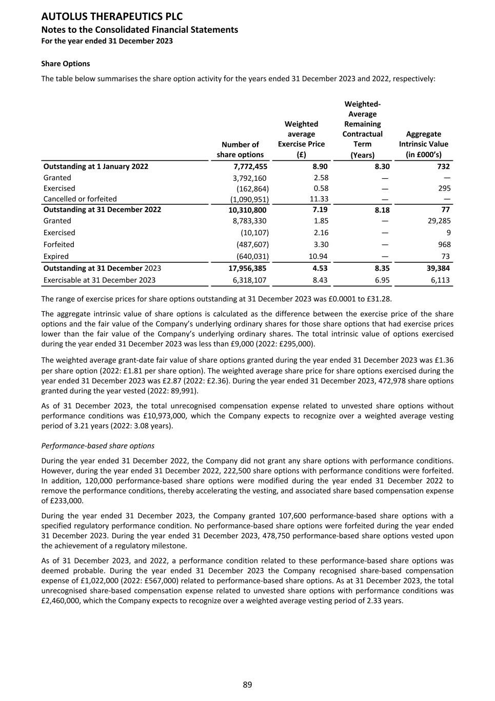 Share Options The table below summarises the share option activity for the years ended 31 December 2023 and 2022, respectively: Number of share options Weighted average Exercise Price Weighted- Average Remaining Contractual Term Aggregate Intrinsic Value (£) (Years) (in £000’s) Outstanding at 1 January 2022 7,772,455 8.90 8.30 732 Granted 3,792,160 2.58 — — Exercised (162,864) 0.58 — 295 Cancelled or forfeited (1,090,951) 11.33 — — Outstanding at 31 December 2022 10,310,800 7.19 8.18 77 Granted 8,783,330 1.85 — 29,285 Exercised (10,107) 2.16 — 9 Forfeited (487,607) 3.30 — 968 Expired (640,031) 10.94 — 73 Outstanding at 31 December 2023 17,956,385 4.53 8.35 39,384 Exercisable at 31 December 2023 6,318,107 8.43 6.95 6,113 The range of exercise prices for share options outstanding at 31 December 2023 was £0.0001 to £31.28. The aggregate intrinsic value of share options is calculated as the difference between the exercise price of the share options and the fair value of the Company’s underlying ordinary shares for those share options that had exercise prices lower than the fair value of the Company’s underlying ordinary shares. The total intrinsic value of options exercised during the year ended 31 December 2023 was less than £9,000 (2022: £295,000). The weighted average grant-date fair value of share options granted during the year ended 31 December 2023 was £1.36 per share option (2022: £1.81 per share option). The weighted average share price for share options exercised during the year ended 31 December 2023 was £2.87 (2022: £2.36). During the year ended 31 December 2023, 472,978 share options granted during the year vested (2022: 89,991). As of 31 December 2023, the total unrecognised compensation expense related to unvested share options without performance conditions was £10,973,000, which the Company expects to recognize over a weighted average vesting period of 3.21 years (2022: 3.08 years). Performance-based share options During the year ended 31 December 2022, the Company did not grant any share options with performance conditions. However, during the year ended 31 December 2022, 222,500 share options with performance conditions were forfeited. In addition, 120,000 performance-based share options were modified during the year ended 31 December 2022 to remove the performance conditions, thereby accelerating the vesting, and associated share based compensation expense of £233,000. During the year ended 31 December 2023, the Company granted 107,600 performance-based share options with a specified regulatory performance condition. No performance-based share options were forfeited during the year ended 31 December 2023. During the year ended 31 December 2023, 478,750 performance-based share options vested upon the achievement of a regulatory milestone. As of 31 December 2023, and 2022, a performance condition related to these performance-based share options was deemed probable. During the year ended 31 December 2023 the Company recognised share-based compensation expense of £1,022,000 (2022: £567,000) related to performance-based share options. As at 31 December 2023, the total unrecognised share-based compensation expense related to unvested share options with performance conditions was £2,460,000, which the Company expects to recognize over a weighted average vesting period of 2.33 years. AUTOLUS THERAPEUTICS PLC Notes to the Consolidated Financial Statements For the year ended 31 December 2023 89