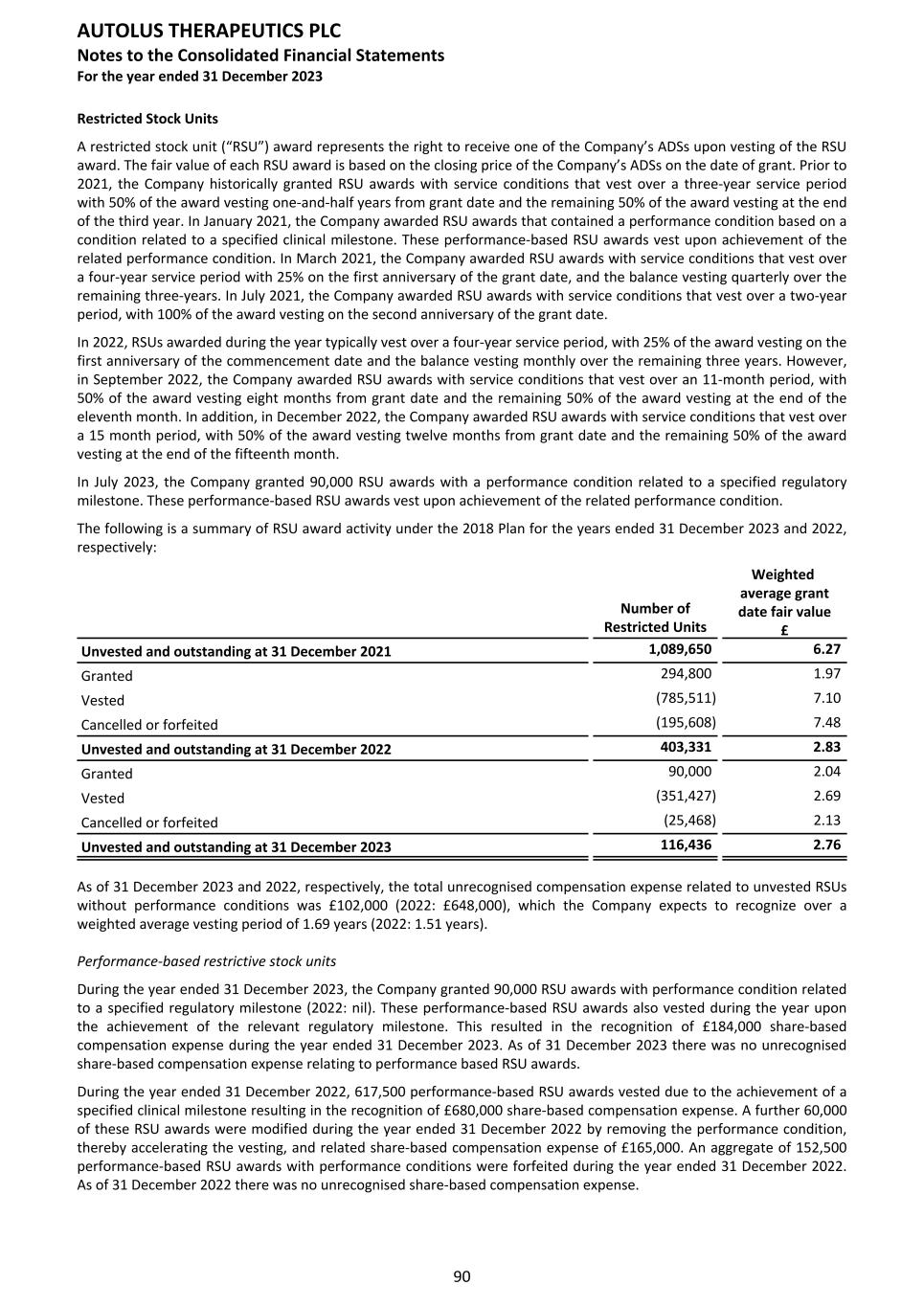 Restricted Stock Units A restricted stock unit (“RSU”) award represents the right to receive one of the Company’s ADSs upon vesting of the RSU award. The fair value of each RSU award is based on the closing price of the Company’s ADSs on the date of grant. Prior to 2021, the Company historically granted RSU awards with service conditions that vest over a three-year service period with 50% of the award vesting one-and-half years from grant date and the remaining 50% of the award vesting at the end of the third year. In January 2021, the Company awarded RSU awards that contained a performance condition based on a condition related to a specified clinical milestone. These performance-based RSU awards vest upon achievement of the related performance condition. In March 2021, the Company awarded RSU awards with service conditions that vest over a four-year service period with 25% on the first anniversary of the grant date, and the balance vesting quarterly over the remaining three-years. In July 2021, the Company awarded RSU awards with service conditions that vest over a two-year period, with 100% of the award vesting on the second anniversary of the grant date. In 2022, RSUs awarded during the year typically vest over a four-year service period, with 25% of the award vesting on the first anniversary of the commencement date and the balance vesting monthly over the remaining three years. However, in September 2022, the Company awarded RSU awards with service conditions that vest over an 11-month period, with 50% of the award vesting eight months from grant date and the remaining 50% of the award vesting at the end of the eleventh month. In addition, in December 2022, the Company awarded RSU awards with service conditions that vest over a 15 month period, with 50% of the award vesting twelve months from grant date and the remaining 50% of the award vesting at the end of the fifteenth month. In July 2023, the Company granted 90,000 RSU awards with a performance condition related to a specified regulatory milestone. These performance-based RSU awards vest upon achievement of the related performance condition. The following is a summary of RSU award activity under the 2018 Plan for the years ended 31 December 2023 and 2022, respectively: Number of Restricted Units Weighted average grant date fair value £ Unvested and outstanding at 31 December 2021 1,089,650 6.27 Granted 294,800 1.97 Vested (785,511) 7.10 Cancelled or forfeited (195,608) 7.48 Unvested and outstanding at 31 December 2022 403,331 2.83 Granted 90,000 2.04 Vested (351,427) 2.69 Cancelled or forfeited (25,468) 2.13 Unvested and outstanding at 31 December 2023 116,436 2.76 As of 31 December 2023 and 2022, respectively, the total unrecognised compensation expense related to unvested RSUs without performance conditions was £102,000 (2022: £648,000), which the Company expects to recognize over a weighted average vesting period of 1.69 years (2022: 1.51 years). Performance-based restrictive stock units During the year ended 31 December 2023, the Company granted 90,000 RSU awards with performance condition related to a specified regulatory milestone (2022: nil). These performance-based RSU awards also vested during the year upon the achievement of the relevant regulatory milestone. This resulted in the recognition of £184,000 share-based compensation expense during the year ended 31 December 2023. As of 31 December 2023 there was no unrecognised share-based compensation expense relating to performance based RSU awards. During the year ended 31 December 2022, 617,500 performance-based RSU awards vested due to the achievement of a specified clinical milestone resulting in the recognition of £680,000 share-based compensation expense. A further 60,000 of these RSU awards were modified during the year ended 31 December 2022 by removing the performance condition, thereby accelerating the vesting, and related share-based compensation expense of £165,000. An aggregate of 152,500 performance-based RSU awards with performance conditions were forfeited during the year ended 31 December 2022. As of 31 December 2022 there was no unrecognised share-based compensation expense. AUTOLUS THERAPEUTICS PLC Notes to the Consolidated Financial Statements For the year ended 31 December 2023 90