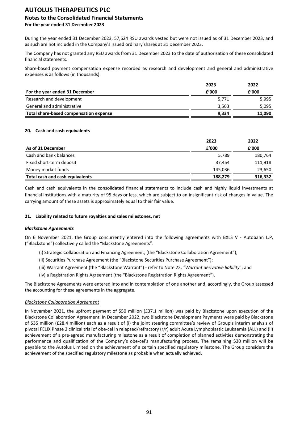 During the year ended 31 December 2023, 57,624 RSU awards vested but were not issued as of 31 December 2023, and as such are not included in the Company's issued ordinary shares at 31 December 2023. The Company has not granted any RSU awards from 31 December 2023 to the date of authorisation of these consolidated financial statements. Share-based payment compensation expense recorded as research and development and general and administrative expenses is as follows (in thousands): 2023 2022 For the year ended 31 December £’000 £’000 Research and development 5,771 5,995 General and administrative 3,563 5,095 Total share-based compensation expense 9,334 11,090 20. Cash and cash equivalents 2023 2022 As of 31 December £’000 £’000 Cash and bank balances 5,789 180,764 Fixed short-term deposit 37,454 111,918 Money market funds 145,036 23,650 Total cash and cash equivalents 188,279 316,332 Cash and cash equivalents in the consolidated financial statements to include cash and highly liquid investments at financial institutions with a maturity of 95 days or less, which are subject to an insignificant risk of changes in value. The carrying amount of these assets is approximately equal to their fair value. 21. Liability related to future royalties and sales milestones, net Blackstone Agreements On 6 November 2021, the Group concurrently entered into the following agreements with BXLS V - Autobahn L.P, (“Blackstone”) collectively called the “Blackstone Agreements”: (i) Strategic Collaboration and Financing Agreement, (the “Blackstone Collaboration Agreement”); (ii) Securities Purchase Agreement (the “Blackstone Securities Purchase Agreement”); (iii) Warrant Agreement (the “Blackstone Warrant”) - refer to Note 22, “Warrant derivative liability"; and (iv) a Registration Rights Agreement (the “Blackstone Registration Rights Agreement”). The Blackstone Agreements were entered into and in contemplation of one another and, accordingly, the Group assessed the accounting for these agreements in the aggregate. Blackstone Collaboration Agreement In November 2021, the upfront payment of $50 million (£37.1 million) was paid by Blackstone upon execution of the Blackstone Collaboration Agreement. In December 2022, two Blackstone Development Payments were paid by Blackstone of $35 million (£28.4 million) each as a result of (i) the joint steering committee’s review of Group’s interim analysis of pivotal FELIX Phase 2 clinical trial of obe-cel in relapsed/refractory (r/r) adult Acute Lymphoblastic Leukaemia (ALL) and (ii) achievement of a pre-agreed manufacturing milestone as a result of completion of planned activities demonstrating the performance and qualification of the Company’s obe-cel’s manufacturing process. The remaining $30 million will be payable to the Autolus Limited on the achievement of a certain specified regulatory milestone. The Group considers the achievement of the specified regulatory milestone as probable when actually achieved. AUTOLUS THERAPEUTICS PLC Notes to the Consolidated Financial Statements For the year ended 31 December 2023 91