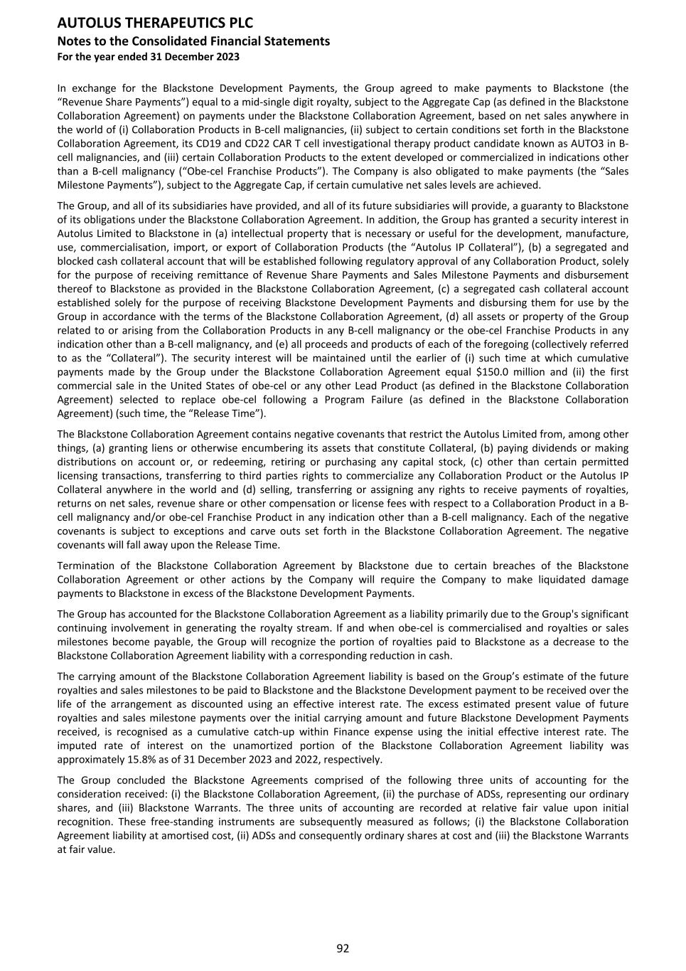 In exchange for the Blackstone Development Payments, the Group agreed to make payments to Blackstone (the “Revenue Share Payments”) equal to a mid-single digit royalty, subject to the Aggregate Cap (as defined in the Blackstone Collaboration Agreement) on payments under the Blackstone Collaboration Agreement, based on net sales anywhere in the world of (i) Collaboration Products in B-cell malignancies, (ii) subject to certain conditions set forth in the Blackstone Collaboration Agreement, its CD19 and CD22 CAR T cell investigational therapy product candidate known as AUTO3 in B- cell malignancies, and (iii) certain Collaboration Products to the extent developed or commercialized in indications other than a B-cell malignancy (“Obe-cel Franchise Products”). The Company is also obligated to make payments (the “Sales Milestone Payments”), subject to the Aggregate Cap, if certain cumulative net sales levels are achieved. The Group, and all of its subsidiaries have provided, and all of its future subsidiaries will provide, a guaranty to Blackstone of its obligations under the Blackstone Collaboration Agreement. In addition, the Group has granted a security interest in Autolus Limited to Blackstone in (a) intellectual property that is necessary or useful for the development, manufacture, use, commercialisation, import, or export of Collaboration Products (the “Autolus IP Collateral”), (b) a segregated and blocked cash collateral account that will be established following regulatory approval of any Collaboration Product, solely for the purpose of receiving remittance of Revenue Share Payments and Sales Milestone Payments and disbursement thereof to Blackstone as provided in the Blackstone Collaboration Agreement, (c) a segregated cash collateral account established solely for the purpose of receiving Blackstone Development Payments and disbursing them for use by the Group in accordance with the terms of the Blackstone Collaboration Agreement, (d) all assets or property of the Group related to or arising from the Collaboration Products in any B-cell malignancy or the obe-cel Franchise Products in any indication other than a B-cell malignancy, and (e) all proceeds and products of each of the foregoing (collectively referred to as the “Collateral”). The security interest will be maintained until the earlier of (i) such time at which cumulative payments made by the Group under the Blackstone Collaboration Agreement equal $150.0 million and (ii) the first commercial sale in the United States of obe-cel or any other Lead Product (as defined in the Blackstone Collaboration Agreement) selected to replace obe-cel following a Program Failure (as defined in the Blackstone Collaboration Agreement) (such time, the “Release Time”). The Blackstone Collaboration Agreement contains negative covenants that restrict the Autolus Limited from, among other things, (a) granting liens or otherwise encumbering its assets that constitute Collateral, (b) paying dividends or making distributions on account or, or redeeming, retiring or purchasing any capital stock, (c) other than certain permitted licensing transactions, transferring to third parties rights to commercialize any Collaboration Product or the Autolus IP Collateral anywhere in the world and (d) selling, transferring or assigning any rights to receive payments of royalties, returns on net sales, revenue share or other compensation or license fees with respect to a Collaboration Product in a B- cell malignancy and/or obe-cel Franchise Product in any indication other than a B-cell malignancy. Each of the negative covenants is subject to exceptions and carve outs set forth in the Blackstone Collaboration Agreement. The negative covenants will fall away upon the Release Time. Termination of the Blackstone Collaboration Agreement by Blackstone due to certain breaches of the Blackstone Collaboration Agreement or other actions by the Company will require the Company to make liquidated damage payments to Blackstone in excess of the Blackstone Development Payments. The Group has accounted for the Blackstone Collaboration Agreement as a liability primarily due to the Group's significant continuing involvement in generating the royalty stream. If and when obe-cel is commercialised and royalties or sales milestones become payable, the Group will recognize the portion of royalties paid to Blackstone as a decrease to the Blackstone Collaboration Agreement liability with a corresponding reduction in cash. The carrying amount of the Blackstone Collaboration Agreement liability is based on the Group’s estimate of the future royalties and sales milestones to be paid to Blackstone and the Blackstone Development payment to be received over the life of the arrangement as discounted using an effective interest rate. The excess estimated present value of future royalties and sales milestone payments over the initial carrying amount and future Blackstone Development Payments received, is recognised as a cumulative catch-up within Finance expense using the initial effective interest rate. The imputed rate of interest on the unamortized portion of the Blackstone Collaboration Agreement liability was approximately 15.8% as of 31 December 2023 and 2022, respectively. The Group concluded the Blackstone Agreements comprised of the following three units of accounting for the consideration received: (i) the Blackstone Collaboration Agreement, (ii) the purchase of ADSs, representing our ordinary shares, and (iii) Blackstone Warrants. The three units of accounting are recorded at relative fair value upon initial recognition. These free-standing instruments are subsequently measured as follows; (i) the Blackstone Collaboration Agreement liability at amortised cost, (ii) ADSs and consequently ordinary shares at cost and (iii) the Blackstone Warrants at fair value. AUTOLUS THERAPEUTICS PLC Notes to the Consolidated Financial Statements For the year ended 31 December 2023 