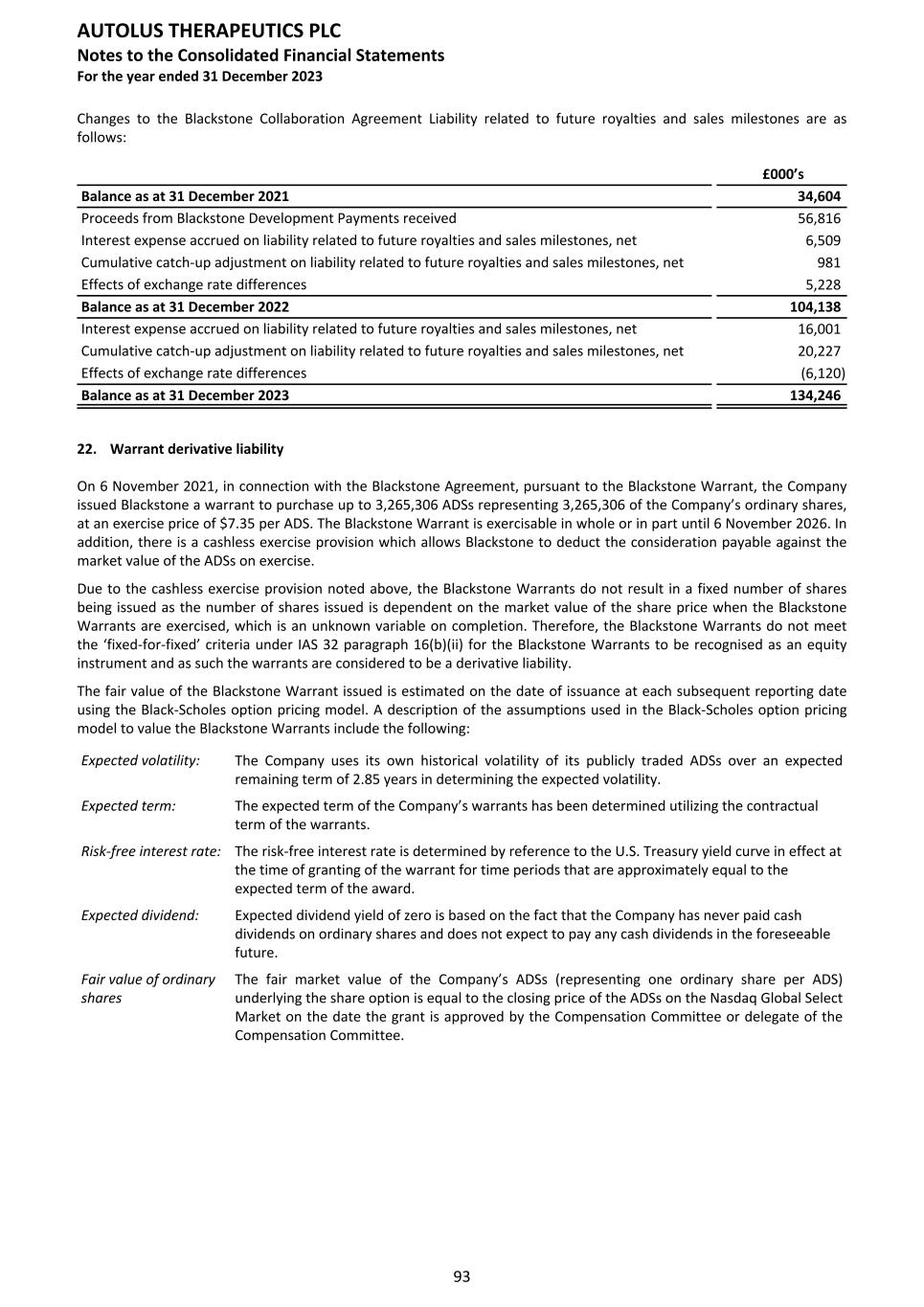 Changes to the Blackstone Collaboration Agreement Liability related to future royalties and sales milestones are as follows: £000’s Balance as at 31 December 2021 34,604 Proceeds from Blackstone Development Payments received 56,816 Interest expense accrued on liability related to future royalties and sales milestones, net 6,509 Cumulative catch-up adjustment on liability related to future royalties and sales milestones, net 981 Effects of exchange rate differences 5,228 Balance as at 31 December 2022 104,138 Interest expense accrued on liability related to future royalties and sales milestones, net 16,001 Cumulative catch-up adjustment on liability related to future royalties and sales milestones, net 20,227 Effects of exchange rate differences (6,120) Balance as at 31 December 2023 134,246 22. Warrant derivative liability On 6 November 2021, in connection with the Blackstone Agreement, pursuant to the Blackstone Warrant, the Company issued Blackstone a warrant to purchase up to 3,265,306 ADSs representing 3,265,306 of the Company’s ordinary shares, at an exercise price of $7.35 per ADS. The Blackstone Warrant is exercisable in whole or in part until 6 November 2026. In addition, there is a cashless exercise provision which allows Blackstone to deduct the consideration payable against the market value of the ADSs on exercise. Due to the cashless exercise provision noted above, the Blackstone Warrants do not result in a fixed number of shares being issued as the number of shares issued is dependent on the market value of the share price when the Blackstone Warrants are exercised, which is an unknown variable on completion. Therefore, the Blackstone Warrants do not meet the ‘fixed-for-fixed’ criteria under IAS 32 paragraph 16(b)(ii) for the Blackstone Warrants to be recognised as an equity instrument and as such the warrants are considered to be a derivative liability. The fair value of the Blackstone Warrant issued is estimated on the date of issuance at each subsequent reporting date using the Black-Scholes option pricing model. A description of the assumptions used in the Black-Scholes option pricing model to value the Blackstone Warrants include the following: Expected volatility: The Company uses its own historical volatility of its publicly traded ADSs over an expected remaining term of 2.85 years in determining the expected volatility. Expected term: The expected term of the Company’s warrants has been determined utilizing the contractual term of the warrants. Risk-free interest rate: The risk-free interest rate is determined by reference to the U.S. Treasury yield curve in effect at the time of granting of the warrant for time periods that are approximately equal to the expected term of the award. Expected dividend: Expected dividend yield of zero is based on the fact that the Company has never paid cash dividends on ordinary shares and does not expect to pay any cash dividends in the foreseeable future. Fair value of ordinary shares The fair market value of the Company’s ADSs (representing one ordinary share per ADS) underlying the share option is equal to the closing price of the ADSs on the Nasdaq Global Select Market on the date the grant is approved by the Compensation Committee or delegate of the Compensation Committee. AUTOLUS THERAPEUTICS PLC Notes to the Consolidated Financial Statements For the year ended 31 December 2023 93