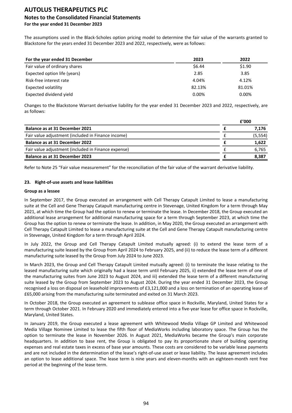 The assumptions used in the Black-Scholes option pricing model to determine the fair value of the warrants granted to Blackstone for the years ended 31 December 2023 and 2022, respectively, were as follows: For the year ended 31 December 2023 2022 Fair value of ordinary shares $6.44 $1.90 Expected option life (years) 2.85 3.85 Risk-free interest rate 4.04% 4.12% Expected volatility 82.13% 81.01% Expected dividend yield 0.00% 0.00% Changes to the Blackstone Warrant derivative liability for the year ended 31 December 2023 and 2022, respectively, are as follows: £’000 Balance as at 31 December 2021 £ 7,176 Fair value adjustment (included in Finance income) £ (5,554) Balance as at 31 December 2022 £ 1,622 Fair value adjustment (included in Finance expense) £ 6,765 Balance as at 31 December 2023 £ 8,387 Refer to Note 25 “Fair value measurement” for the reconciliation of the fair value of the warrant derivative liability. 23. Right-of-use assets and lease liabilities Group as a lessee In September 2017, the Group executed an arrangement with Cell Therapy Catapult Limited to lease a manufacturing suite at the Cell and Gene Therapy Catapult manufacturing centre in Stevenage, United Kingdom for a term through May 2021, at which time the Group had the option to renew or terminate the lease. In December 2018, the Group executed an additional lease arrangement for additional manufacturing space for a term through September 2023, at which time the Group has the option to renew or terminate the lease. In addition, in May 2020, the Group executed an arrangement with Cell Therapy Catapult Limited to lease a manufacturing suite at the Cell and Gene Therapy Catapult manufacturing centre in Stevenage, United Kingdom for a term through April 2024. In July 2022, the Group and Cell Therapy Catapult Limited mutually agreed: (i) to extend the lease term of a manufacturing suite leased by the Group from April 2024 to February 2025, and (ii) to reduce the lease term of a different manufacturing suite leased by the Group from July 2024 to June 2023. In March 2023, the Group and Cell Therapy Catapult Limited mutually agreed: (i) to terminate the lease relating to the leased manufacturing suite which originally had a lease term until February 2025, ii) extended the lease term of one of the manufacturing suites from June 2023 to August 2024, and iii) extended the lease term of a different manufacturing suite leased by the Group from September 2023 to August 2024. During the year ended 31 December 2023, the Group recognised a loss on disposal on leasehold improvements of £3,121,000 and a loss on termination of an operating lease of £65,000 arising from the manufacturing suite terminated and exited on 31 March 2023. In October 2018, the Group executed an agreement to sublease office space in Rockville, Maryland, United States for a term through October 2021. In February 2020 and immediately entered into a five-year lease for office space in Rockville, Maryland, United States. In January 2019, the Group executed a lease agreement with Whitewood Media Village GP Limited and Whitewood Media Village Nominee Limited to lease the fifth floor of MediaWorks including laboratory space. The Group has the option to terminate the lease in November 2026. In August 2021, MediaWorks became the Group's main corporate headquarters. In addition to base rent, the Group is obligated to pay its proportionate share of building operating expenses and real estate taxes in excess of base year amounts. These costs are considered to be variable lease payments and are not included in the determination of the lease’s right-of-use asset or lease liability. The lease agreement includes an option to lease additional space. The lease term is nine years and eleven-months with an eighteen-month rent free period at the beginning of the lease term. AUTOLUS THERAPEUTICS PLC Notes to the Consolidated Financial Statements For the year ended 31 December 2023 94