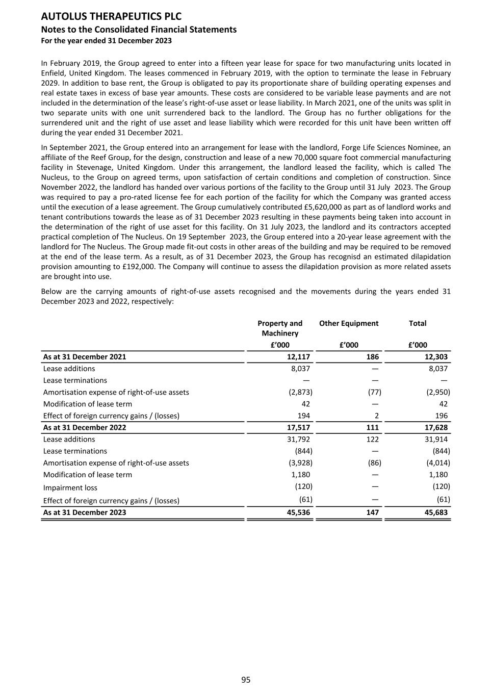 In February 2019, the Group agreed to enter into a fifteen year lease for space for two manufacturing units located in Enfield, United Kingdom. The leases commenced in February 2019, with the option to terminate the lease in February 2029. In addition to base rent, the Group is obligated to pay its proportionate share of building operating expenses and real estate taxes in excess of base year amounts. These costs are considered to be variable lease payments and are not included in the determination of the lease’s right-of-use asset or lease liability. In March 2021, one of the units was split in two separate units with one unit surrendered back to the landlord. The Group has no further obligations for the surrendered unit and the right of use asset and lease liability which were recorded for this unit have been written off during the year ended 31 December 2021. In September 2021, the Group entered into an arrangement for lease with the landlord, Forge Life Sciences Nominee, an affiliate of the Reef Group, for the design, construction and lease of a new 70,000 square foot commercial manufacturing facility in Stevenage, United Kingdom. Under this arrangement, the landlord leased the facility, which is called The Nucleus, to the Group on agreed terms, upon satisfaction of certain conditions and completion of construction. Since November 2022, the landlord has handed over various portions of the facility to the Group until 31 July 2023. The Group was required to pay a pro-rated license fee for each portion of the facility for which the Company was granted access until the execution of a lease agreement. The Group cumulatively contributed £5,620,000 as part as of landlord works and tenant contributions towards the lease as of 31 December 2023 resulting in these payments being taken into account in the determination of the right of use asset for this facility. On 31 July 2023, the landlord and its contractors accepted practical completion of The Nucleus. On 19 September 2023, the Group entered into a 20-year lease agreement with the landlord for The Nucleus. The Group made fit-out costs in other areas of the building and may be required to be removed at the end of the lease term. As a result, as of 31 December 2023, the Group has recognisd an estimated dilapidation provision amounting to £192,000. The Company will continue to assess the dilapidation provision as more related assets are brought into use. Below are the carrying amounts of right-of-use assets recognised and the movements during the years ended 31 December 2023 and 2022, respectively: Property and Machinery Other Equipment Total £’000 £’000 £’000 As at 31 December 2021 12,117 186 12,303 Lease additions 8,037 — 8,037 Lease terminations — — — Amortisation expense of right-of-use assets (2,873) (77) (2,950) Modification of lease term 42 — 42 Effect of foreign currency gains / (losses) 194 2 196 As at 31 December 2022 17,517 111 17,628 Lease additions 31,792 122 31,914 Lease terminations (844) — (844) Amortisation expense of right-of-use assets (3,928) (86) (4,014) Modification of lease term 1,180 — 1,180 Impairment loss (120) — (120) Effect of foreign currency gains / (losses) (61) — (61) As at 31 December 2023 45,536 147 45,683 AUTOLUS THERAPEUTICS PLC Notes to the Consolidated Financial Statements For the year ended 31 December 2023 95