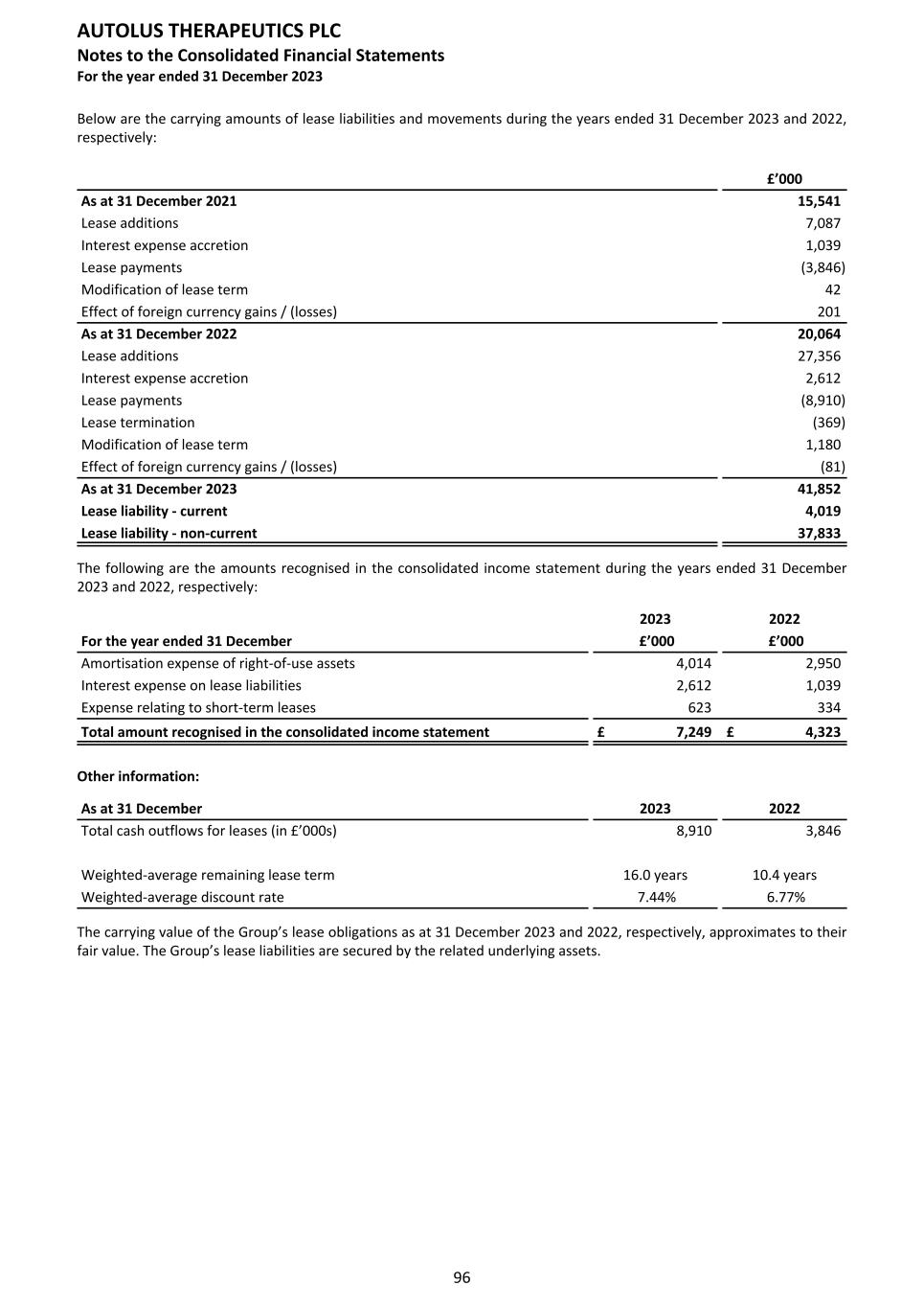 Below are the carrying amounts of lease liabilities and movements during the years ended 31 December 2023 and 2022, respectively: £’000 As at 31 December 2021 15,541 Lease additions 7,087 Interest expense accretion 1,039 Lease payments (3,846) Modification of lease term 42 Effect of foreign currency gains / (losses) 201 As at 31 December 2022 20,064 Lease additions 27,356 Interest expense accretion 2,612 Lease payments (8,910) Lease termination (369) Modification of lease term 1,180 Effect of foreign currency gains / (losses) (81) As at 31 December 2023 41,852 Lease liability - current 4,019 Lease liability - non-current 37,833 The following are the amounts recognised in the consolidated income statement during the years ended 31 December 2023 and 2022, respectively: 2023 2022 For the year ended 31 December £’000 £’000 Amortisation expense of right-of-use assets 4,014 2,950 Interest expense on lease liabilities 2,612 1,039 Expense relating to short-term leases 623 334 Total amount recognised in the consolidated income statement £ 7,249 £ 4,323 Other information: As at 31 December 2023 2022 Total cash outflows for leases (in £’000s) 8,910 3,846 Weighted-average remaining lease term 16.0 years 10.4 years Weighted-average discount rate 7.44% 6.77% The carrying value of the Group’s lease obligations as at 31 December 2023 and 2022, respectively, approximates to their fair value. The Group’s lease liabilities are secured by the related underlying assets. AUTOLUS THERAPEUTICS PLC Notes to the Consolidated Financial Statements For the year ended 31 December 2023 96