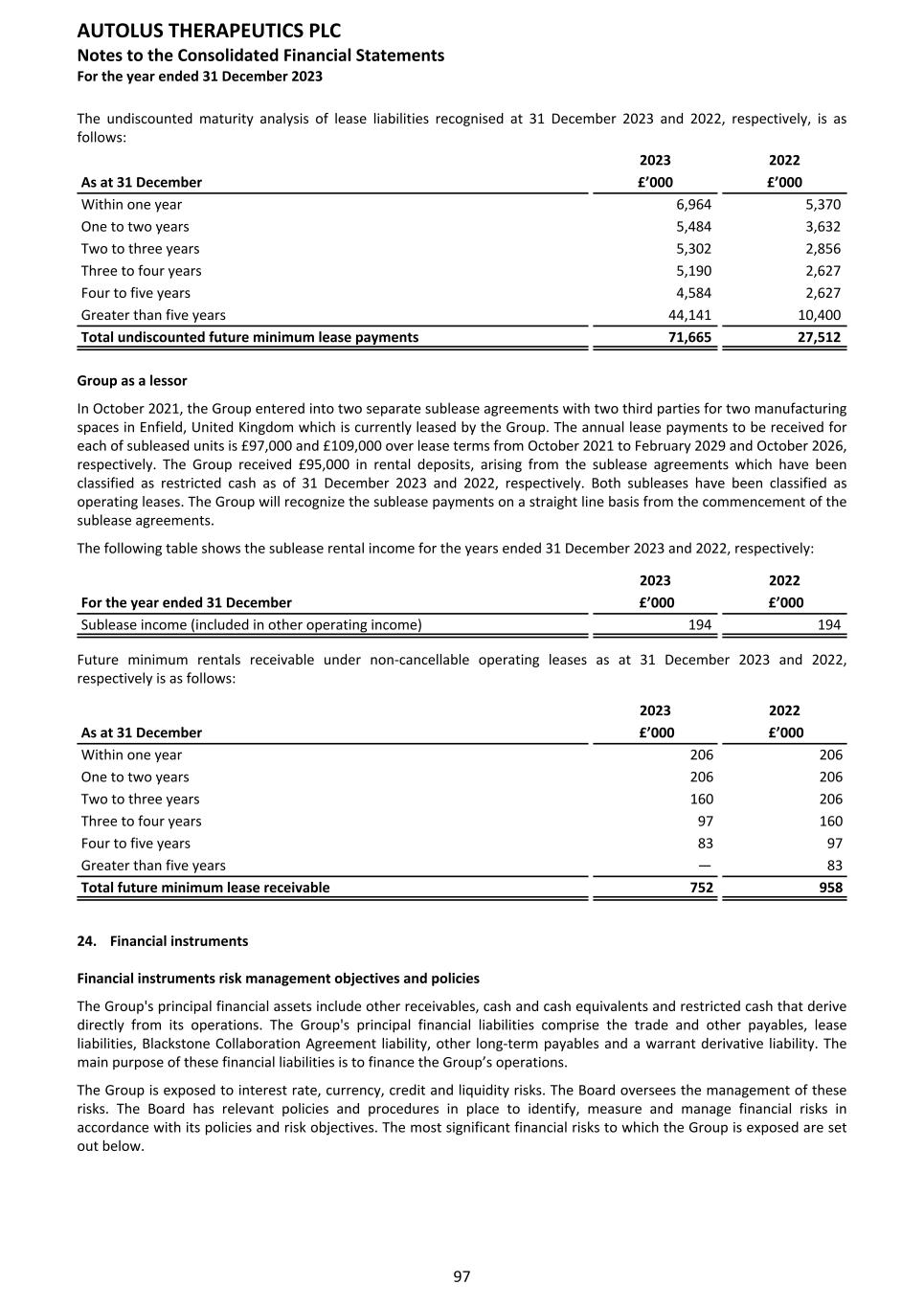 The undiscounted maturity analysis of lease liabilities recognised at 31 December 2023 and 2022, respectively, is as follows: 2023 2022 As at 31 December £’000 £’000 Within one year 6,964 5,370 One to two years 5,484 3,632 Two to three years 5,302 2,856 Three to four years 5,190 2,627 Four to five years 4,584 2,627 Greater than five years 44,141 10,400 Total undiscounted future minimum lease payments 71,665 27,512 Group as a lessor In October 2021, the Group entered into two separate sublease agreements with two third parties for two manufacturing spaces in Enfield, United Kingdom which is currently leased by the Group. The annual lease payments to be received for each of subleased units is £97,000 and £109,000 over lease terms from October 2021 to February 2029 and October 2026, respectively. The Group received £95,000 in rental deposits, arising from the sublease agreements which have been classified as restricted cash as of 31 December 2023 and 2022, respectively. Both subleases have been classified as operating leases. The Group will recognize the sublease payments on a straight line basis from the commencement of the sublease agreements. The following table shows the sublease rental income for the years ended 31 December 2023 and 2022, respectively: 2023 2022 For the year ended 31 December £’000 £’000 Sublease income (included in other operating income) 194 194 Future minimum rentals receivable under non-cancellable operating leases as at 31 December 2023 and 2022, respectively is as follows: 2023 2022 As at 31 December £’000 £’000 Within one year 206 206 One to two years 206 206 Two to three years 160 206 Three to four years 97 160 Four to five years 83 97 Greater than five years — 83 Total future minimum lease receivable 752 958 24. Financial instruments Financial instruments risk management objectives and policies The Group's principal financial assets include other receivables, cash and cash equivalents and restricted cash that derive directly from its operations. The Group's principal financial liabilities comprise the trade and other payables, lease liabilities, Blackstone Collaboration Agreement liability, other long-term payables and a warrant derivative liability. The main purpose of these financial liabilities is to finance the Group’s operations. The Group is exposed to interest rate, currency, credit and liquidity risks. The Board oversees the management of these risks. The Board has relevant policies and procedures in place to identify, measure and manage financial risks in accordance with its policies and risk objectives. The most significant financial risks to which the Group is exposed are set out below. AUTOLUS THERAPEUTICS PLC Notes to the Consolidated Financial Statements For the year ended 31 December 2023 97