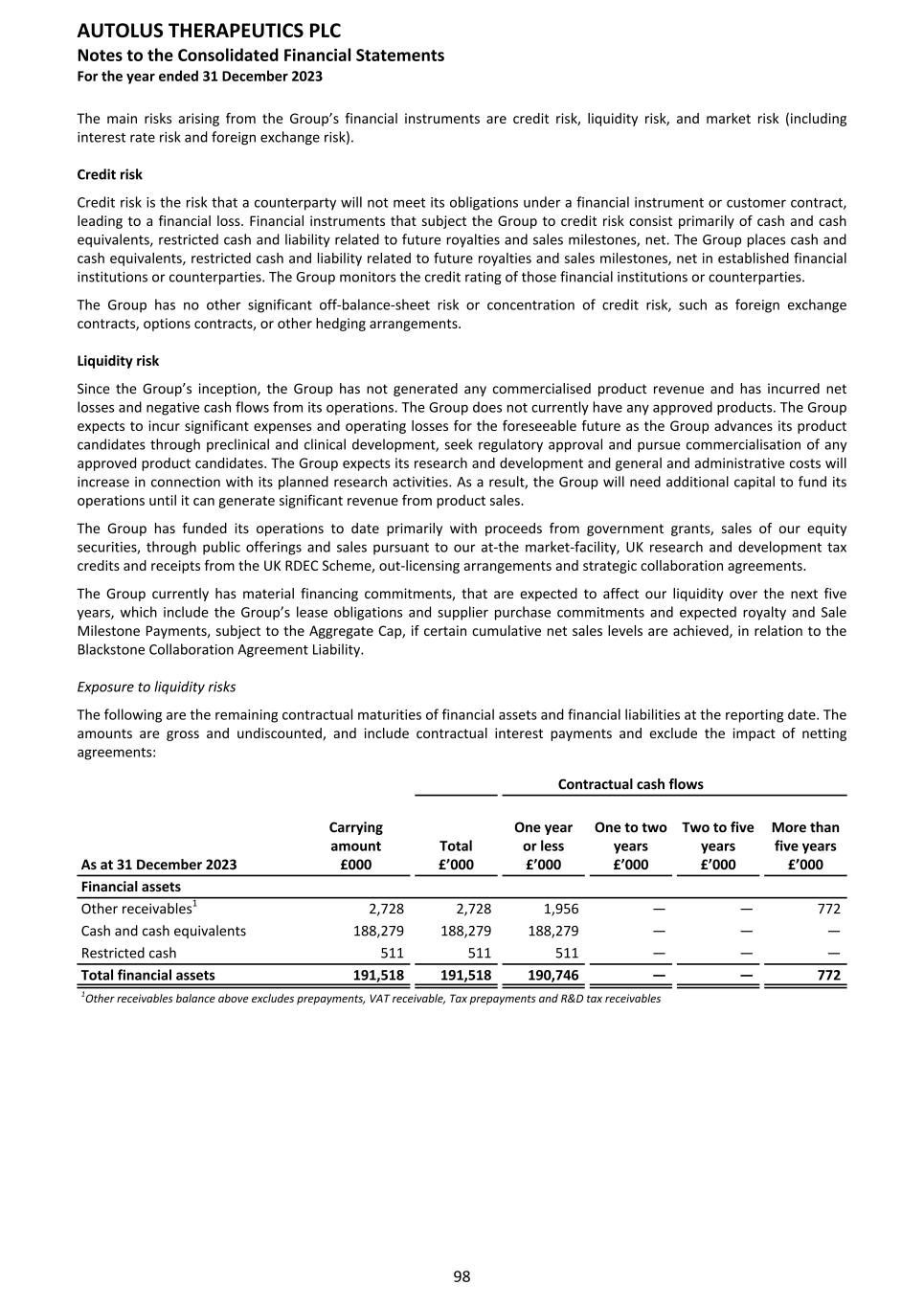 The main risks arising from the Group’s financial instruments are credit risk, liquidity risk, and market risk (including interest rate risk and foreign exchange risk). Credit risk Credit risk is the risk that a counterparty will not meet its obligations under a financial instrument or customer contract, leading to a financial loss. Financial instruments that subject the Group to credit risk consist primarily of cash and cash equivalents, restricted cash and liability related to future royalties and sales milestones, net. The Group places cash and cash equivalents, restricted cash and liability related to future royalties and sales milestones, net in established financial institutions or counterparties. The Group monitors the credit rating of those financial institutions or counterparties. The Group has no other significant off-balance-sheet risk or concentration of credit risk, such as foreign exchange contracts, options contracts, or other hedging arrangements. Liquidity risk Since the Group’s inception, the Group has not generated any commercialised product revenue and has incurred net losses and negative cash flows from its operations. The Group does not currently have any approved products. The Group expects to incur significant expenses and operating losses for the foreseeable future as the Group advances its product candidates through preclinical and clinical development, seek regulatory approval and pursue commercialisation of any approved product candidates. The Group expects its research and development and general and administrative costs will increase in connection with its planned research activities. As a result, the Group will need additional capital to fund its operations until it can generate significant revenue from product sales. The Group has funded its operations to date primarily with proceeds from government grants, sales of our equity securities, through public offerings and sales pursuant to our at-the market-facility, UK research and development tax credits and receipts from the UK RDEC Scheme, out-licensing arrangements and strategic collaboration agreements. The Group currently has material financing commitments, that are expected to affect our liquidity over the next five years, which include the Group’s lease obligations and supplier purchase commitments and expected royalty and Sale Milestone Payments, subject to the Aggregate Cap, if certain cumulative net sales levels are achieved, in relation to the Blackstone Collaboration Agreement Liability. Exposure to liquidity risks The following are the remaining contractual maturities of financial assets and financial liabilities at the reporting date. The amounts are gross and undiscounted, and include contractual interest payments and exclude the impact of netting agreements: Contractual cash flows As at 31 December 2023 Carrying amount £000 Total £’000 One year or less £’000 One to two years £’000 Two to five years £’000 More than five years £’000 Financial assets Other receivables1 2,728 2,728 1,956 — — 772 Cash and cash equivalents 188,279 188,279 188,279 — — — Restricted cash 511 511 511 — — — Total financial assets 191,518 191,518 190,746 — — 772 1Other receivables balance above excludes prepayments, VAT receivable, Tax prepayments and R&D tax receivables AUTOLUS THERAPEUTICS PLC Notes to the Consolidated Financial Statements For the year ended 31 December 2023 98