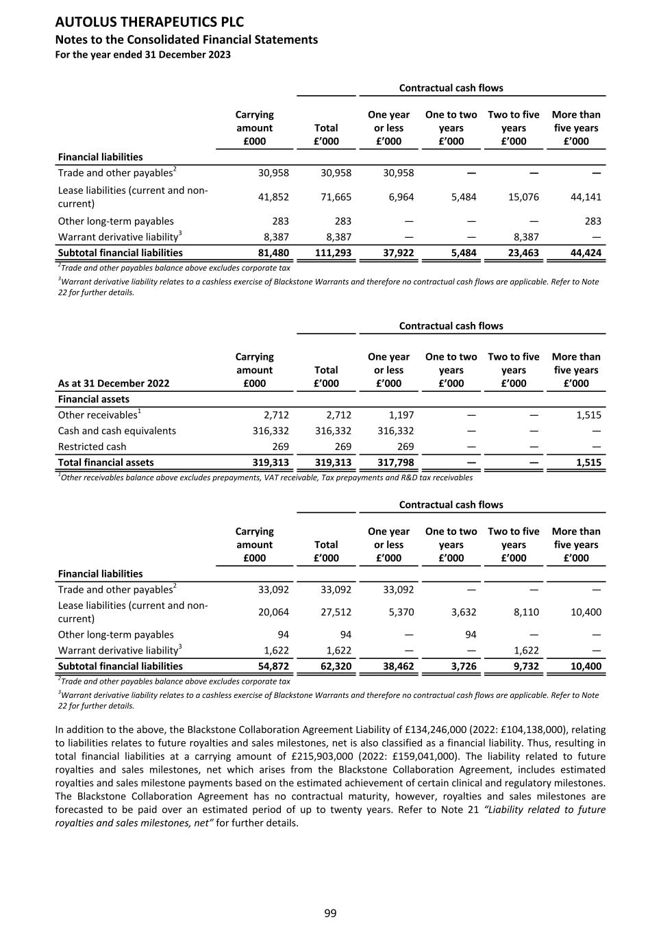 Contractual cash flows Carrying amount £000 Total £’000 One year or less £’000 One to two years £’000 Two to five years £’000 More than five years £’000 Financial liabilities Trade and other payables2 30,958 30,958 30,958 — — — Lease liabilities (current and non- current) 41,852 71,665 6,964 5,484 15,076 44,141 Other long-term payables 283 283 — — — 283 Warrant derivative liability3 8,387 8,387 — — 8,387 — Subtotal financial liabilities 81,480 111,293 37,922 5,484 23,463 44,424 2Trade and other payables balance above excludes corporate tax 3Warrant derivative liability relates to a cashless exercise of Blackstone Warrants and therefore no contractual cash flows are applicable. Refer to Note 22 for further details. Contractual cash flows As at 31 December 2022 Carrying amount £000 Total £’000 One year or less £’000 One to two years £’000 Two to five years £’000 More than five years £’000 Financial assets Other receivables1 2,712 2,712 1,197 — — 1,515 Cash and cash equivalents 316,332 316,332 316,332 — — — Restricted cash 269 269 269 — — — Total financial assets 319,313 319,313 317,798 — — 1,515 1Other receivables balance above excludes prepayments, VAT receivable, Tax prepayments and R&D tax receivables Contractual cash flows Carrying amount £000 Total £’000 One year or less £’000 One to two years £’000 Two to five years £’000 More than five years £’000 Financial liabilities Trade and other payables2 33,092 33,092 33,092 — — — Lease liabilities (current and non- current) 20,064 27,512 5,370 3,632 8,110 10,400 Other long-term payables 94 94 — 94 — — Warrant derivative liability3 1,622 1,622 — — 1,622 — Subtotal financial liabilities 54,872 62,320 38,462 3,726 9,732 10,400 2Trade and other payables balance above excludes corporate tax 3Warrant derivative liability relates to a cashless exercise of Blackstone Warrants and therefore no contractual cash flows are applicable. Refer to Note 22 for further details. In addition to the above, the Blackstone Collaboration Agreement Liability of £134,246,000 (2022: £104,138,000), relating to liabilities relates to future royalties and sales milestones, net is also classified as a financial liability. Thus, resulting in total financial liabilities at a carrying amount of £215,903,000 (2022: £159,041,000). The liability related to future royalties and sales milestones, net which arises from the Blackstone Collaboration Agreement, includes estimated royalties and sales milestone payments based on the estimated achievement of certain clinical and regulatory milestones. The Blackstone Collaboration Agreement has no contractual maturity, however, royalties and sales milestones are forecasted to be paid over an estimated period of up to twenty years. Refer to Note 21 “Liability related to future royalties and sales milestones, net” for further details. AUTOLUS THERAPEUTICS PLC Notes to the Consolidated Financial Statements For the year ended 31 December 2023 99