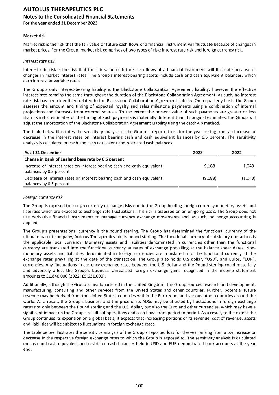 Market risk Market risk is the risk that the fair value or future cash flows of a financial instrument will fluctuate because of changes in market prices. For the Group, market risk comprises of two types of risk: interest rate risk and foreign currency risk. Interest rate risk Interest rate risk is the risk that the fair value or future cash flows of a financial instrument will fluctuate because of changes in market interest rates. The Group's interest-bearing assets include cash and cash equivalent balances, which earn interest at variable rates. The Group's only interest-bearing liability is the Blackstone Collaboration Agreement liability, however the effective interest rate remains the same throughout the duration of the Blackstone Collaboration Agreement. As such, no interest rate risk has been identified related to the Blackstone Collaboration Agreement liability. On a quarterly basis, the Group assesses the amount and timing of expected royalty and sales milestone payments using a combination of internal projections and forecasts from external sources. To the extent the present value of such payments are greater or less than its initial estimates or the timing of such payments is materially different than its original estimates, the Group will adjust the amortization of the Blackstone Collaboration Agreement Liability using the catch-up method. The table below illustrates the sensitivity analysis of the Group ’s reported loss for the year arising from an increase or decrease in the interest rates on interest bearing cash and cash equivalent balances by 0.5 percent. The sensitivity analysis is calculated on cash and cash equivalent and restricted cash balances: As at 31 December 2023 2022 Change in Bank of England base rate by 0.5 percent Increase of interest rates on interest bearing cash and cash equivalent balances by 0.5 percent 9,188 1,043 Decrease of interest rates on interest bearing cash and cash equivalent balances by 0.5 percent (9,188) (1,043) Foreign currency risk The Group is exposed to foreign currency exchange risks due to the Group holding foreign currency monetary assets and liabilities which are exposed to exchange rate fluctuations. This risk is assessed on an on-going basis. The Group does not use derivative financial instruments to manage currency exchange movements and, as such, no hedge accounting is applied. The Group’s presentational currency is the pound sterling. The Group has determined the functional currency of the ultimate parent company, Autolus Therapeutics plc, is pound sterling. The functional currency of subsidiary operations is the applicable local currency. Monetary assets and liabilities denominated in currencies other than the functional currency are translated into the functional currency at rates of exchange prevailing at the balance sheet dates. Non- monetary assets and liabilities denominated in foreign currencies are translated into the functional currency at the exchange rates prevailing at the date of the transaction. The Group also holds U.S dollar, “USD”, and Euros, “EUR”, currencies. Any fluctuations in currency exchange rates between the U.S. dollar and the Pound sterling could materially and adversely affect the Group’s business. Unrealised foreign exchange gains recognised in the income statement amounts to £1,840,000 (2022: £5,631,000). Additionally, although the Group is headquartered in the United Kingdom, the Group sources research and development, manufacturing, consulting and other services from the United States and other countries. Further, potential future revenue may be derived from the United States, countries within the Euro zone, and various other countries around the world. As a result, the Group’s business and the price of its ADSs may be affected by fluctuations in foreign exchange rates not only between the Pound sterling and the U.S. dollar, but also the Euro and other currencies, which may have a significant impact on the Group’s results of operations and cash flows from period to period. As a result, to the extent the Group continues its expansion on a global basis, it expects that increasing portions of its revenue, cost of revenue, assets and liabilities will be subject to fluctuations in foreign exchange rates. The table below illustrates the sensitivity analysis of the Group’s reported loss for the year arising from a 5% increase or decrease in the respective foreign exchange rates to which the Group is exposed to. The sensitivity analysis is calculated on cash and cash equivalent and restricted cash balances held in USD and EUR denominated bank accounts at the year end. AUTOLUS THERAPEUTICS PLC Notes to the Consolidated Financial Statements For the year ended 31 December 2023 100