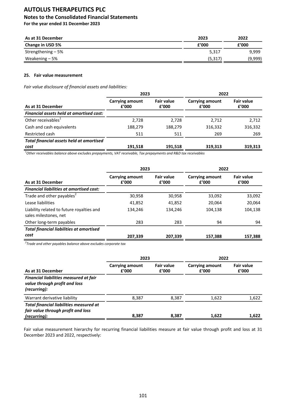 As at 31 December 2023 2022 Change in USD 5% £’000 £’000 Strengthening – 5% 5,317 9,999 Weakening – 5% (5,317) (9,999) 25. Fair value measurement Fair value disclosure of financial assets and liabilities: 2023 2022 As at 31 December Carrying amount £’000 Fair value £’000 Carrying amount £’000 Fair value £’000 Financial assets held at amortised cost: Other receivables1 2,728 2,728 2,712 2,712 Cash and cash equivalents 188,279 188,279 316,332 316,332 Restricted cash 511 511 269 269 Total financial assets held at amortised cost 191,518 191,518 319,313 319,313 1Other receivables balance above excludes prepayments, VAT receivable, Tax prepayments and R&D tax receivables 2023 2022 As at 31 December Carrying amount £’000 Fair value £’000 Carrying amount £’000 Fair value £’000 Financial liabilities at amortised cost: Trade and other payables2 30,958 30,958 33,092 33,092 Lease liabilities 41,852 41,852 20,064 20,064 Liability related to future royalties and sales milestones, net 134,246 134,246 104,138 104,138 Other long-term payables 283 283 94 94 Total financial liabilities at amortised cost 207,339 207,339 157,388 157,388 2Trade and other payables balance above excludes corporate tax 2023 2022 As at 31 December Carrying amount £’000 Fair value £’000 Carrying amount £’000 Fair value £’000 Financial liabilities measured at fair value through profit and loss (recurring): Warrant derivative liability 8,387 8,387 17,832 1,622 1,622 Total financial liabilities measured at fair value through profit and loss (recurring): 8,387 8,387 1,622 1,622 Fair value measurement hierarchy for recurring financial liabilities measure at fair value through profit and loss at 31 December 2023 and 2022, respectively: AUTOLUS THERAPEUTICS PLC Notes to the Consolidated Financial Statements For the year ended 31 December 2023 101