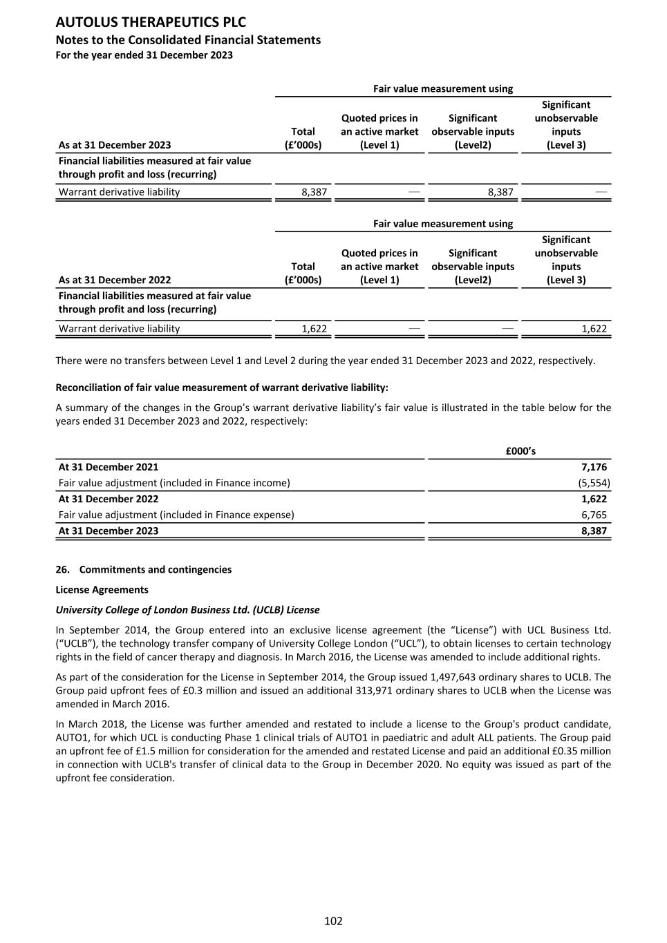 Fair value measurement using As at 31 December 2023 Total (£’000s) Quoted prices in an active market (Level 1) Significant observable inputs (Level2) Significant unobservable inputs (Level 3) Financial liabilities measured at fair value through profit and loss (recurring) Warrant derivative liability 8,387 — 8,387 — Fair value measurement using As at 31 December 2022 Total (£’000s) Quoted prices in an active market (Level 1) Significant observable inputs (Level2) Significant unobservable inputs (Level 3) Financial liabilities measured at fair value through profit and loss (recurring) Warrant derivative liability 1,622 — — 1,622 There were no transfers between Level 1 and Level 2 during the year ended 31 December 2023 and 2022, respectively. Reconciliation of fair value measurement of warrant derivative liability: A summary of the changes in the Group’s warrant derivative liability’s fair value is illustrated in the table below for the years ended 31 December 2023 and 2022, respectively: £000’s At 31 December 2021 7,176 Fair value adjustment (included in Finance income) (5,554) At 31 December 2022 1,622 Fair value adjustment (included in Finance expense) 6,765 At 31 December 2023 8,387 26. Commitments and contingencies License Agreements University College of London Business Ltd. (UCLB) License In September 2014, the Group entered into an exclusive license agreement (the “License”) with UCL Business Ltd. (“UCLB”), the technology transfer company of University College London (“UCL”), to obtain licenses to certain technology rights in the field of cancer therapy and diagnosis. In March 2016, the License was amended to include additional rights. As part of the consideration for the License in September 2014, the Group issued 1,497,643 ordinary shares to UCLB. The Group paid upfront fees of £0.3 million and issued an additional 313,971 ordinary shares to UCLB when the License was amended in March 2016. In March 2018, the License was further amended and restated to include a license to the Group's product candidate, AUTO1, for which UCL is conducting Phase 1 clinical trials of AUTO1 in paediatric and adult ALL patients. The Group paid an upfront fee of £1.5 million for consideration for the amended and restated License and paid an additional £0.35 million in connection with UCLB's transfer of clinical data to the Group in December 2020. No equity was issued as part of the upfront fee consideration. AUTOLUS THERAPEUTICS PLC Notes to the Consolidated Financial Statements For the year ended 31 December 2023 102