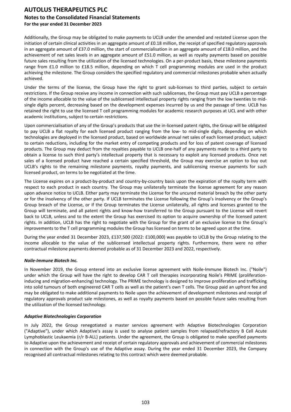 Additionally, the Group may be obligated to make payments to UCLB under the amended and restated License upon the initiation of certain clinical activities in an aggregate amount of £0.18 million, the receipt of specified regulatory approvals in an aggregate amount of £37.0 million, the start of commercialisation in an aggregate amount of £18.0 million, and the achievement of net sales levels in an aggregate amount of £51.0 million, as well as royalty payments based on possible future sales resulting from the utilization of the licensed technologies. On a per-product basis, these milestone payments range from £1.0 million to £18.5 million, depending on which T cell programming modules are used in the product achieving the milestone. The Group considers the specified regulatory and commercial milestones probable when actually achieved. Under the terms of the license, the Group have the right to grant sub-licenses to third parties, subject to certain restrictions. If the Group receive any income in connection with such sublicenses, the Group must pay UCLB a percentage of the income allocable to the value of the sublicensed intellectual property rights ranging from the low twenties to mid- single digits percent, decreasing based on the development expenses incurred by us and the passage of time. UCLB has retained the right to use the licensed T cell programming modules for academic research purposes at UCL and with other academic institutions, subject to certain restrictions. Upon commercialisation of any of the Group’s products that use the in-licensed patent rights, the Group will be obligated to pay UCLB a flat royalty for each licensed product ranging from the low- to mid-single digits, depending on which technologies are deployed in the licensed product, based on worldwide annual net sales of each licensed product, subject to certain reductions, including for the market entry of competing products and for loss of patent coverage of licensed products. The Group may deduct from the royalties payable to UCLB one-half of any payments made to a third party to obtain a license to such third party’s intellectual property that is necessary to exploit any licensed products. Once net sales of a licensed product have reached a certain specified threshold, the Group may exercise an option to buy out UCLB’s rights to the remaining milestone payments, royalty payments, and sublicensing revenue payments for such licensed product, on terms to be negotiated at the time. The License expires on a product-by-product and country-by-country basis upon the expiration of the royalty term with respect to each product in each country. The Group may unilaterally terminate the license agreement for any reason upon advance notice to UCLB. Either party may terminate the License for the uncured material breach by the other party or for the insolvency of the other party. If UCLB terminates the License following the Group’s insolvency or the Group’s Group breach of the License, or if the Group terminates the License unilaterally, all rights and licenses granted to the Group will terminate, and all patent rights and know-how transferred to the Group pursuant to the License will revert back to UCLB, unless and to the extent the Group has exercised its option to acquire ownership of the licensed patent rights. In addition, UCLB has the right to negotiate with the Group for the grant of an exclusive license to the Group’s improvements to the T cell programming modules the Group has licensed on terms to be agreed upon at the time. During the year ended 31 December 2023, £137,500 (2022: £100,000) was payable to UCLB by the Group relating to the income allocable to the value of the sublicensed intellectual property rights. Furthermore, there were no other contractual milestone payments deemed probable as of 31 December 2023 and 2022, respectively. Noile-Immune Biotech Inc. In November 2019, the Group entered into an exclusive license agreement with Noile-Immune Biotech Inc. ("Noile") under which the Group will have the right to develop CAR T cell therapies incorporating Noile’s PRIME (proliferation- inducing and migration-enhancing) technology. The PRIME technology is designed to improve proliferation and trafficking into solid tumours of both engineered CAR T cells as well as the patient’s own T cells. The Group paid an upfront fee and may be obligated to make additional payments to Noile upon the achievement of development milestones and receipt of regulatory approvals product sale milestones, as well as royalty payments based on possible future sales resulting from the utilization of the licensed technology. Adaptive Biotechnologies Corporation In July 2022, the Group renegotiated a master services agreement with Adaptive Biotechnologies Corporation ("Adaptive"), under which Adaptive's assay is used to analyse patient samples from relapsed/refractory B Cell Acute Lymphoblastic Leukaemia (r/r B-ALL) patients. Under the agreement, the Group is obligated to make specified payments to Adaptive upon the achievement and receipt of certain regulatory approvals and achievement of commercial milestones in connection with the Group's use of the Adaptive assay. During the year ended 31 December 2023, the Company recognised all contractual milestones relating to this contract which were deemed probable. AUTOLUS THERAPEUTICS PLC Notes to the Consolidated Financial Statements For the year ended 31 December 2023 103