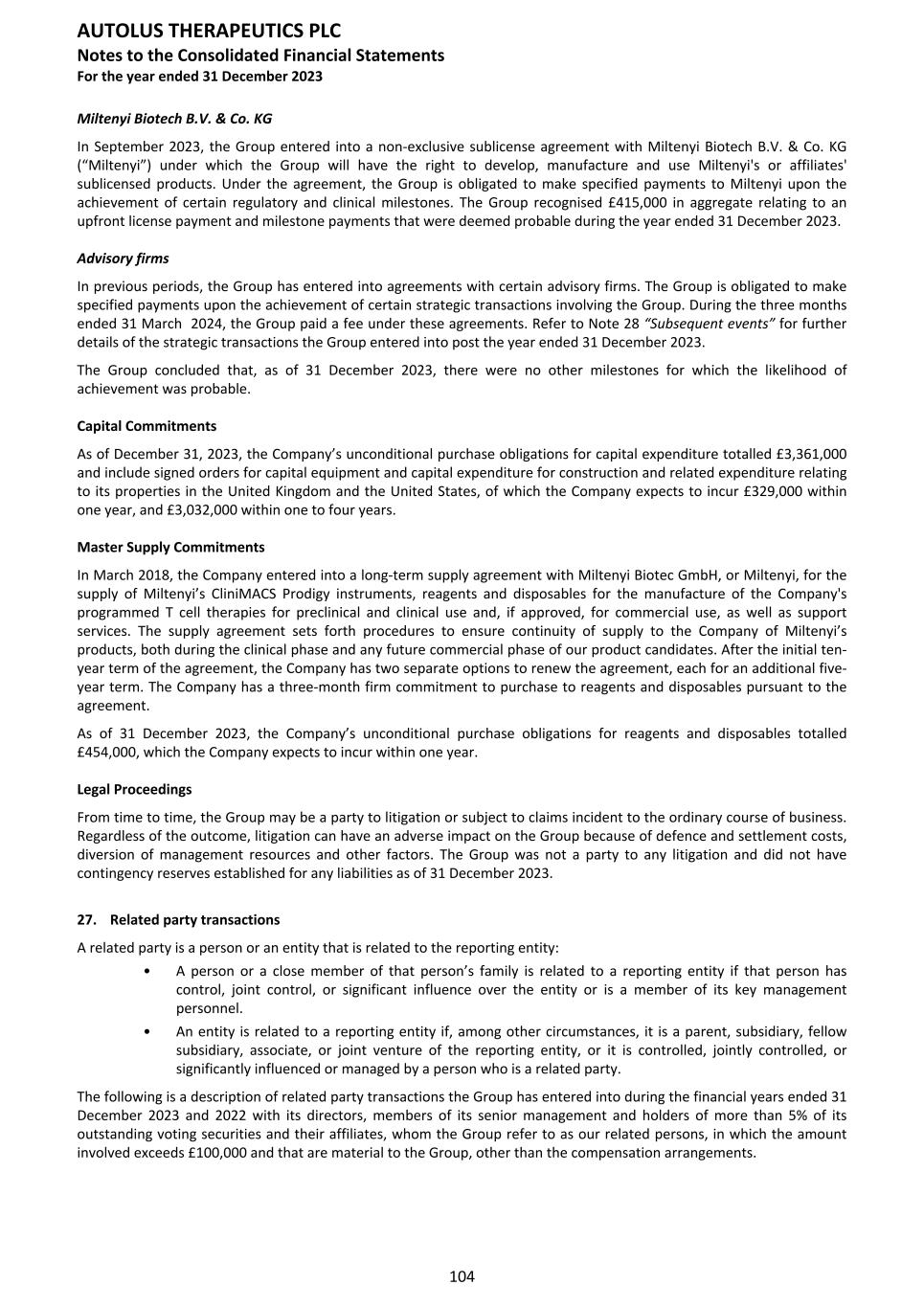 Miltenyi Biotech B.V. & Co. KG In September 2023, the Group entered into a non-exclusive sublicense agreement with Miltenyi Biotech B.V. & Co. KG (“Miltenyi”) under which the Group will have the right to develop, manufacture and use Miltenyi's or affiliates' sublicensed products. Under the agreement, the Group is obligated to make specified payments to Miltenyi upon the achievement of certain regulatory and clinical milestones. The Group recognised £415,000 in aggregate relating to an upfront license payment and milestone payments that were deemed probable during the year ended 31 December 2023. Advisory firms In previous periods, the Group has entered into agreements with certain advisory firms. The Group is obligated to make specified payments upon the achievement of certain strategic transactions involving the Group. During the three months ended 31 March 2024, the Group paid a fee under these agreements. Refer to Note 28 “Subsequent events” for further details of the strategic transactions the Group entered into post the year ended 31 December 2023. The Group concluded that, as of 31 December 2023, there were no other milestones for which the likelihood of achievement was probable. Capital Commitments As of December 31, 2023, the Company’s unconditional purchase obligations for capital expenditure totalled £3,361,000 and include signed orders for capital equipment and capital expenditure for construction and related expenditure relating to its properties in the United Kingdom and the United States, of which the Company expects to incur £329,000 within one year, and £3,032,000 within one to four years. Master Supply Commitments In March 2018, the Company entered into a long-term supply agreement with Miltenyi Biotec GmbH, or Miltenyi, for the supply of Miltenyi’s CliniMACS Prodigy instruments, reagents and disposables for the manufacture of the Company's programmed T cell therapies for preclinical and clinical use and, if approved, for commercial use, as well as support services. The supply agreement sets forth procedures to ensure continuity of supply to the Company of Miltenyi’s products, both during the clinical phase and any future commercial phase of our product candidates. After the initial ten- year term of the agreement, the Company has two separate options to renew the agreement, each for an additional five- year term. The Company has a three-month firm commitment to purchase to reagents and disposables pursuant to the agreement. As of 31 December 2023, the Company’s unconditional purchase obligations for reagents and disposables totalled £454,000, which the Company expects to incur within one year. Legal Proceedings From time to time, the Group may be a party to litigation or subject to claims incident to the ordinary course of business. Regardless of the outcome, litigation can have an adverse impact on the Group because of defence and settlement costs, diversion of management resources and other factors. The Group was not a party to any litigation and did not have contingency reserves established for any liabilities as of 31 December 2023. 27. Related party transactions A related party is a person or an entity that is related to the reporting entity: • A person or a close member of that person’s family is related to a reporting entity if that person has control, joint control, or significant influence over the entity or is a member of its key management personnel. • An entity is related to a reporting entity if, among other circumstances, it is a parent, subsidiary, fellow subsidiary, associate, or joint venture of the reporting entity, or it is controlled, jointly controlled, or significantly influenced or managed by a person who is a related party. The following is a description of related party transactions the Group has entered into during the financial years ended 31 December 2023 and 2022 with its directors, members of its senior management and holders of more than 5% of its outstanding voting securities and their affiliates, whom the Group refer to as our related persons, in which the amount involved exceeds £100,000 and that are material to the Group, other than the compensation arrangements. AUTOLUS THERAPEUTICS PLC Notes to the Consolidated Financial Statements For the year ended 31 December 2023 104