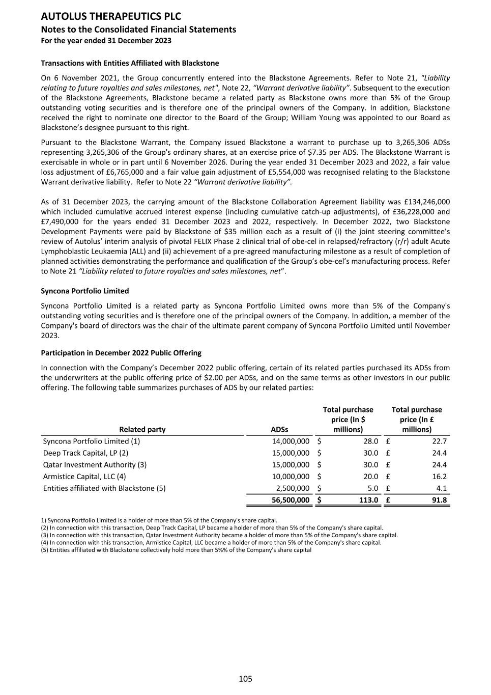 Transactions with Entities Affiliated with Blackstone On 6 November 2021, the Group concurrently entered into the Blackstone Agreements. Refer to Note 21, "Liability relating to future royalties and sales milestones, net", Note 22, “Warrant derivative liability”. Subsequent to the execution of the Blackstone Agreements, Blackstone became a related party as Blackstone owns more than 5% of the Group outstanding voting securities and is therefore one of the principal owners of the Company. In addition, Blackstone received the right to nominate one director to the Board of the Group; William Young was appointed to our Board as Blackstone’s designee pursuant to this right. Pursuant to the Blackstone Warrant, the Company issued Blackstone a warrant to purchase up to 3,265,306 ADSs representing 3,265,306 of the Group's ordinary shares, at an exercise price of $7.35 per ADS. The Blackstone Warrant is exercisable in whole or in part until 6 November 2026. During the year ended 31 December 2023 and 2022, a fair value loss adjustment of £6,765,000 and a fair value gain adjustment of £5,554,000 was recognised relating to the Blackstone Warrant derivative liability. Refer to Note 22 “Warrant derivative liability”. As of 31 December 2023, the carrying amount of the Blackstone Collaboration Agreement liability was £134,246,000 which included cumulative accrued interest expense (including cumulative catch-up adjustments), of £36,228,000 and £7,490,000 for the years ended 31 December 2023 and 2022, respectively. In December 2022, two Blackstone Development Payments were paid by Blackstone of $35 million each as a result of (i) the joint steering committee’s review of Autolus’ interim analysis of pivotal FELIX Phase 2 clinical trial of obe-cel in relapsed/refractory (r/r) adult Acute Lymphoblastic Leukaemia (ALL) and (ii) achievement of a pre-agreed manufacturing milestone as a result of completion of planned activities demonstrating the performance and qualification of the Group’s obe-cel’s manufacturing process. Refer to Note 21 “Liability related to future royalties and sales milestones, net”. Syncona Portfolio Limited Syncona Portfolio Limited is a related party as Syncona Portfolio Limited owns more than 5% of the Company's outstanding voting securities and is therefore one of the principal owners of the Company. In addition, a member of the Company's board of directors was the chair of the ultimate parent company of Syncona Portfolio Limited until November 2023. Participation in December 2022 Public Offering In connection with the Company’s December 2022 public offering, certain of its related parties purchased its ADSs from the underwriters at the public offering price of $2.00 per ADSs, and on the same terms as other investors in our public offering. The following table summarizes purchases of ADS by our related parties: Related party ADSs Total purchase price (In $ millions) Total purchase price (In £ millions) Syncona Portfolio Limited (1) 14,000,000 $ 28.0 £ 22.7 Deep Track Capital, LP (2) 15,000,000 $ 30.0 £ 24.4 Qatar Investment Authority (3) 15,000,000 $ 30.0 £ 24.4 Armistice Capital, LLC (4) 10,000,000 $ 20.0 £ 16.2 Entities affiliated with Blackstone (5) 2,500,000 $ 5.0 £ 4.1 56,500,000 $ 113.0 £ 91.8 1) Syncona Portfolio Limited is a holder of more than 5% of the Company's share capital. (2) In connection with this transaction, Deep Track Capital, LP became a holder of more than 5% of the Company's share capital. (3) In connection with this transaction, Qatar Investment Authority became a holder of more than 5% of the Company's share capital. (4) In connection with this transaction, Armistice Capital, LLC became a holder of more than 5% of the Company's share capital. (5) Entities affiliated with Blackstone collectively hold more than 5%% of the Company's share capital AUTOLUS THERAPEUTICS PLC Notes to the Consolidated Financial Statements For the year ended 31 December 2023 105