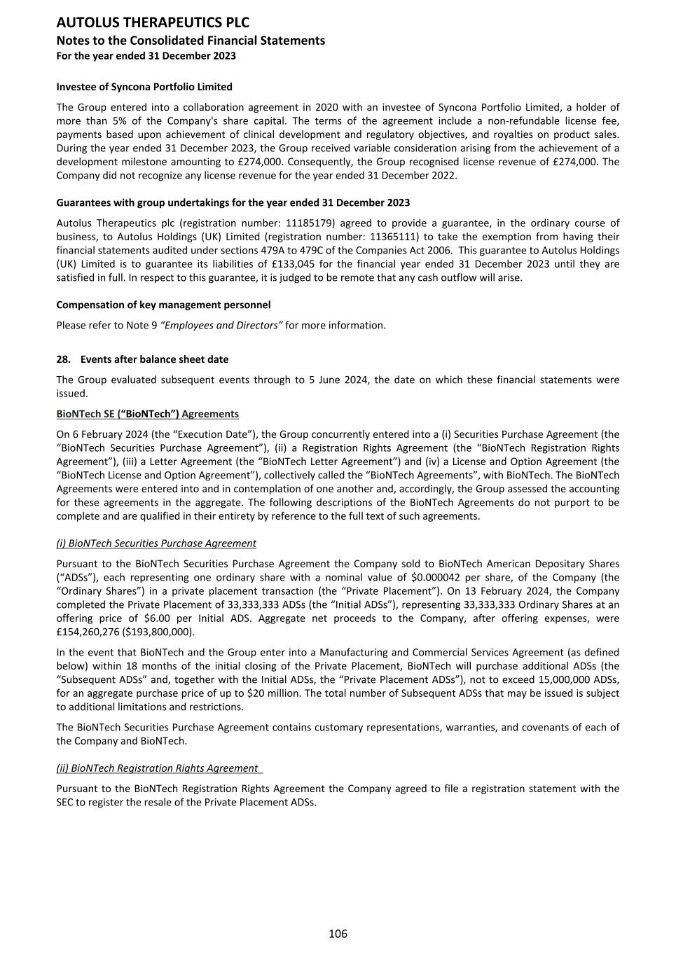 Investee of Syncona Portfolio Limited The Group entered into a collaboration agreement in 2020 with an investee of Syncona Portfolio Limited, a holder of more than 5% of the Company's share capital. The terms of the agreement include a non-refundable license fee, payments based upon achievement of clinical development and regulatory objectives, and royalties on product sales. During the year ended 31 December 2023, the Group received variable consideration arising from the achievement of a development milestone amounting to £274,000. Consequently, the Group recognised license revenue of £274,000. The Company did not recognize any license revenue for the year ended 31 December 2022. Guarantees with group undertakings for the year ended 31 December 2023 Autolus Therapeutics plc (registration number: 11185179) agreed to provide a guarantee, in the ordinary course of business, to Autolus Holdings (UK) Limited (registration number: 11365111) to take the exemption from having their financial statements audited under sections 479A to 479C of the Companies Act 2006. This guarantee to Autolus Holdings (UK) Limited is to guarantee its liabilities of £133,045 for the financial year ended 31 December 2023 until they are satisfied in full. In respect to this guarantee, it is judged to be remote that any cash outflow will arise. Compensation of key management personnel Please refer to Note 9 “Employees and Directors” for more information. 28. Events after balance sheet date The Group evaluated subsequent events through to 5 June 2024, the date on which these financial statements were issued. BioNTech SE (“BioNTech”) Agreements On 6 February 2024 (the “Execution Date”), the Group concurrently entered into a (i) Securities Purchase Agreement (the “BioNTech Securities Purchase Agreement”), (ii) a Registration Rights Agreement (the “BioNTech Registration Rights Agreement”), (iii) a Letter Agreement (the “BioNTech Letter Agreement”) and (iv) a License and Option Agreement (the “BioNTech License and Option Agreement”), collectively called the “BioNTech Agreements”, with BioNTech. The BioNTech Agreements were entered into and in contemplation of one another and, accordingly, the Group assessed the accounting for these agreements in the aggregate. The following descriptions of the BioNTech Agreements do not purport to be complete and are qualified in their entirety by reference to the full text of such agreements. (i) BioNTech Securities Purchase Agreement Pursuant to the BioNTech Securities Purchase Agreement the Company sold to BioNTech American Depositary Shares (“ADSs”), each representing one ordinary share with a nominal value of $0.000042 per share, of the Company (the “Ordinary Shares”) in a private placement transaction (the “Private Placement”). On 13 February 2024, the Company completed the Private Placement of 33,333,333 ADSs (the “Initial ADSs”), representing 33,333,333 Ordinary Shares at an offering price of $6.00 per Initial ADS. Aggregate net proceeds to the Company, after offering expenses, were £154,260,276 ($193,800,000). In the event that BioNTech and the Group enter into a Manufacturing and Commercial Services Agreement (as defined below) within 18 months of the initial closing of the Private Placement, BioNTech will purchase additional ADSs (the “Subsequent ADSs” and, together with the Initial ADSs, the “Private Placement ADSs”), not to exceed 15,000,000 ADSs, for an aggregate purchase price of up to $20 million. The total number of Subsequent ADSs that may be issued is subject to additional limitations and restrictions. The BioNTech Securities Purchase Agreement contains customary representations, warranties, and covenants of each of the Company and BioNTech. (ii) BioNTech Registration Rights Agreement Pursuant to the BioNTech Registration Rights Agreement the Company agreed to file a registration statement with the SEC to register the resale of the Private Placement ADSs. AUTOLUS THERAPEUTICS PLC Notes to the Consolidated Financial Statements For the year ended 31 December 2023 106