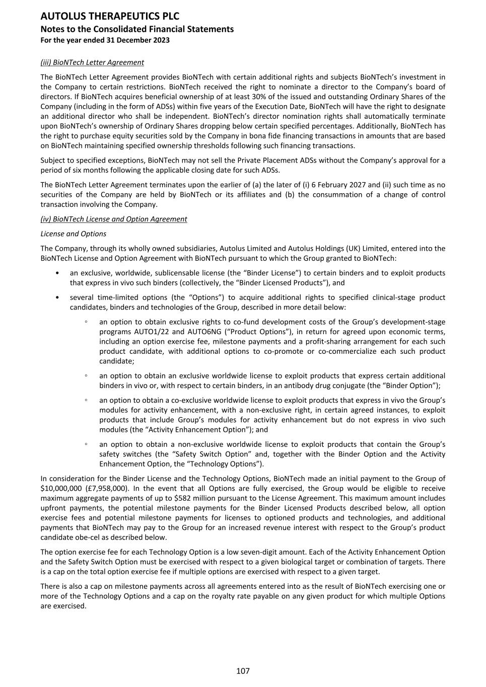 (iii) BioNTech Letter Agreement The BioNTech Letter Agreement provides BioNTech with certain additional rights and subjects BioNTech’s investment in the Company to certain restrictions. BioNTech received the right to nominate a director to the Company’s board of directors. If BioNTech acquires beneficial ownership of at least 30% of the issued and outstanding Ordinary Shares of the Company (including in the form of ADSs) within five years of the Execution Date, BioNTech will have the right to designate an additional director who shall be independent. BioNTech’s director nomination rights shall automatically terminate upon BioNTech’s ownership of Ordinary Shares dropping below certain specified percentages. Additionally, BioNTech has the right to purchase equity securities sold by the Company in bona fide financing transactions in amounts that are based on BioNTech maintaining specified ownership thresholds following such financing transactions. Subject to specified exceptions, BioNTech may not sell the Private Placement ADSs without the Company’s approval for a period of six months following the applicable closing date for such ADSs. The BioNTech Letter Agreement terminates upon the earlier of (a) the later of (i) 6 February 2027 and (ii) such time as no securities of the Company are held by BioNTech or its affiliates and (b) the consummation of a change of control transaction involving the Company. (iv) BioNTech License and Option Agreement License and Options The Company, through its wholly owned subsidiaries, Autolus Limited and Autolus Holdings (UK) Limited, entered into the BioNTech License and Option Agreement with BioNTech pursuant to which the Group granted to BioNTech: • an exclusive, worldwide, sublicensable license (the “Binder License”) to certain binders and to exploit products that express in vivo such binders (collectively, the “Binder Licensed Products”), and • several time-limited options (the “Options”) to acquire additional rights to specified clinical-stage product candidates, binders and technologies of the Group, described in more detail below: ◦ an option to obtain exclusive rights to co-fund development costs of the Group’s development-stage programs AUTO1/22 and AUTO6NG (“Product Options”), in return for agreed upon economic terms, including an option exercise fee, milestone payments and a profit-sharing arrangement for each such product candidate, with additional options to co-promote or co-commercialize each such product candidate; ◦ an option to obtain an exclusive worldwide license to exploit products that express certain additional binders in vivo or, with respect to certain binders, in an antibody drug conjugate (the “Binder Option”); ◦ an option to obtain a co-exclusive worldwide license to exploit products that express in vivo the Group’s modules for activity enhancement, with a non-exclusive right, in certain agreed instances, to exploit products that include Group’s modules for activity enhancement but do not express in vivo such modules (the “Activity Enhancement Option”); and ◦ an option to obtain a non-exclusive worldwide license to exploit products that contain the Group’s safety switches (the “Safety Switch Option” and, together with the Binder Option and the Activity Enhancement Option, the “Technology Options”). In consideration for the Binder License and the Technology Options, BioNTech made an initial payment to the Group of $10,000,000 (£7,958,000). In the event that all Options are fully exercised, the Group would be eligible to receive maximum aggregate payments of up to $582 million pursuant to the License Agreement. This maximum amount includes upfront payments, the potential milestone payments for the Binder Licensed Products described below, all option exercise fees and potential milestone payments for licenses to optioned products and technologies, and additional payments that BioNTech may pay to the Group for an increased revenue interest with respect to the Group’s product candidate obe-cel as described below. The option exercise fee for each Technology Option is a low seven-digit amount. Each of the Activity Enhancement Option and the Safety Switch Option must be exercised with respect to a given biological target or combination of targets. There is a cap on the total option exercise fee if multiple options are exercised with respect to a given target. There is also a cap on milestone payments across all agreements entered into as the result of BioNTech exercising one or more of the Technology Options and a cap on the royalty rate payable on any given product for which multiple Options are exercised. AUTOLUS THERAPEUTICS PLC Notes to the Consolidated Financial Statements For the year ended 31 December 2023 107