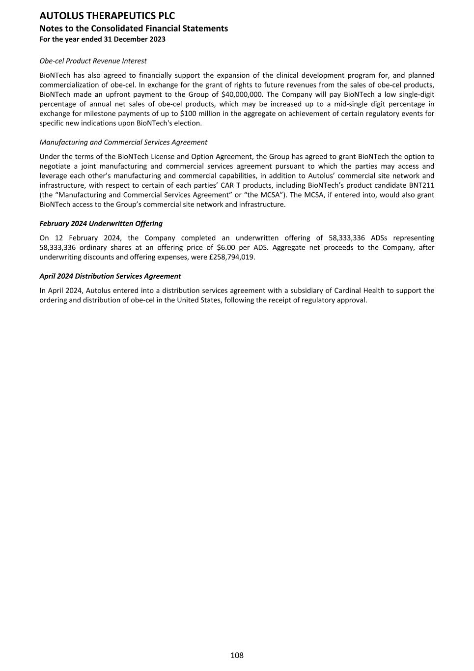 Obe-cel Product Revenue Interest BioNTech has also agreed to financially support the expansion of the clinical development program for, and planned commercialization of obe-cel. In exchange for the grant of rights to future revenues from the sales of obe-cel products, BioNTech made an upfront payment to the Group of $40,000,000. The Company will pay BioNTech a low single-digit percentage of annual net sales of obe-cel products, which may be increased up to a mid-single digit percentage in exchange for milestone payments of up to $100 million in the aggregate on achievement of certain regulatory events for specific new indications upon BioNTech's election. Manufacturing and Commercial Services Agreement Under the terms of the BioNTech License and Option Agreement, the Group has agreed to grant BioNTech the option to negotiate a joint manufacturing and commercial services agreement pursuant to which the parties may access and leverage each other’s manufacturing and commercial capabilities, in addition to Autolus’ commercial site network and infrastructure, with respect to certain of each parties’ CAR T products, including BioNTech’s product candidate BNT211 (the “Manufacturing and Commercial Services Agreement” or “the MCSA”). The MCSA, if entered into, would also grant BioNTech access to the Group’s commercial site network and infrastructure. February 2024 Underwritten Offering On 12 February 2024, the Company completed an underwritten offering of 58,333,336 ADSs representing 58,333,336 ordinary shares at an offering price of $6.00 per ADS. Aggregate net proceeds to the Company, after underwriting discounts and offering expenses, were £258,794,019. April 2024 Distribution Services Agreement In April 2024, Autolus entered into a distribution services agreement with a subsidiary of Cardinal Health to support the ordering and distribution of obe-cel in the United States, following the receipt of regulatory approval. AUTOLUS THERAPEUTICS PLC Notes to the Consolidated Financial Statements For the year ended 31 December 2023 108